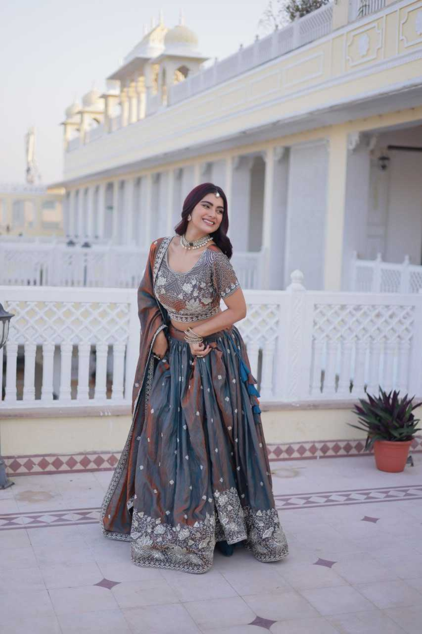 A mesmerizing dualtone grey YSL silk lehenga set with pipe embroidery, sequin & thread work, featuring a stunning lotus motif border.