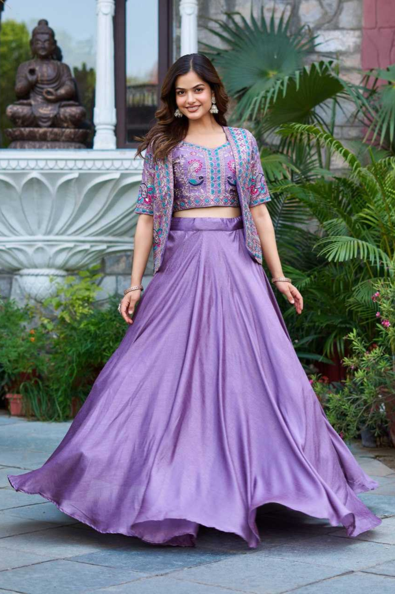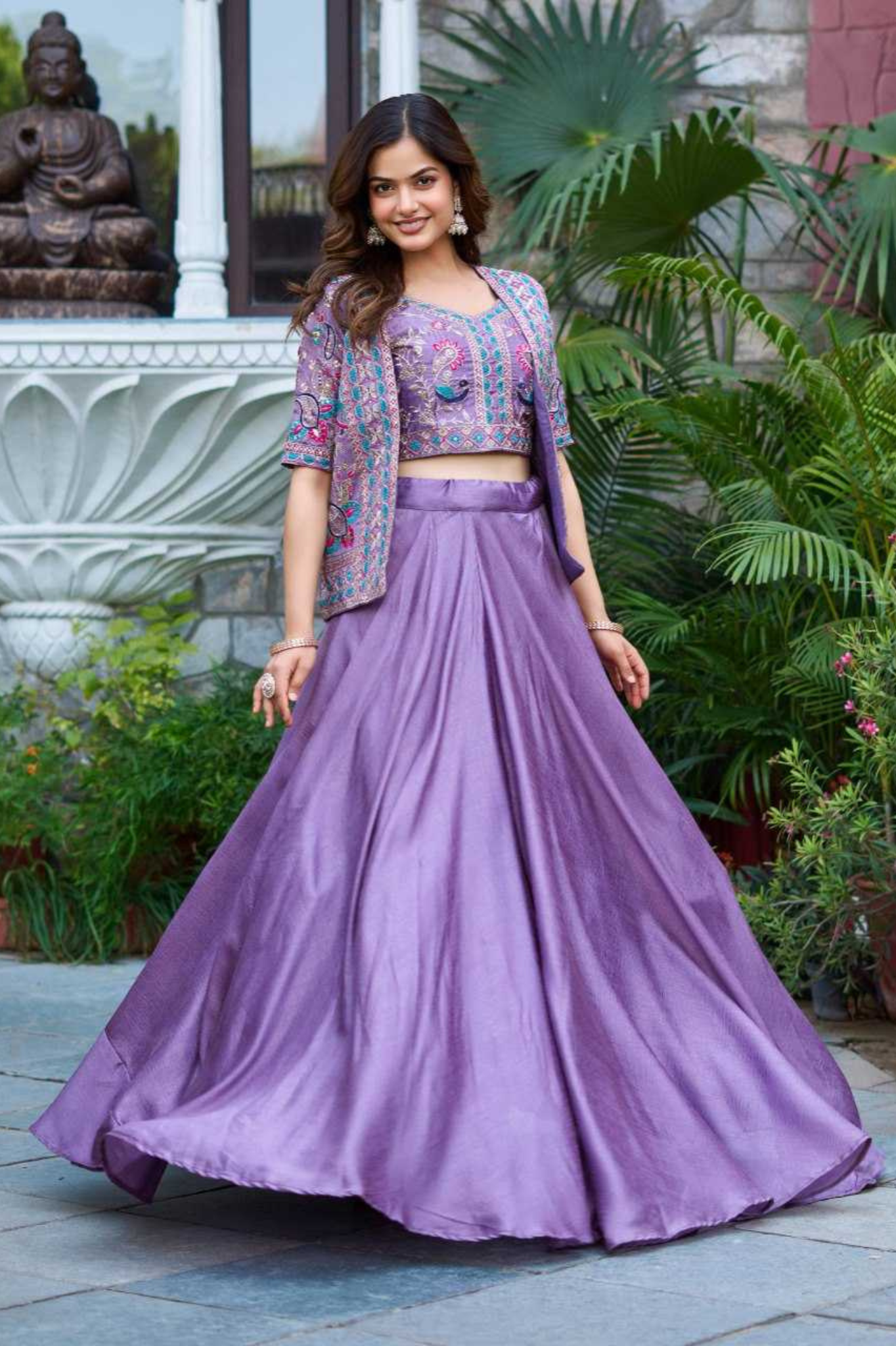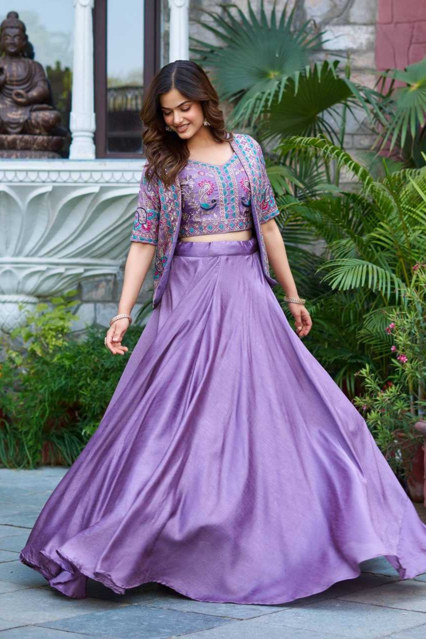 An elegant three-piece lehenga set crafted in premium Vichitra silk. The heavily embroidered choli with fine thread work is paired with a flared lehenga and a stylish koti (jacket) to give a regal and festive appeal. Perfect for weddings, sangeet, and traditional functions.