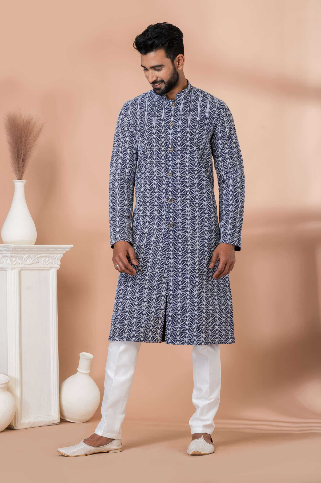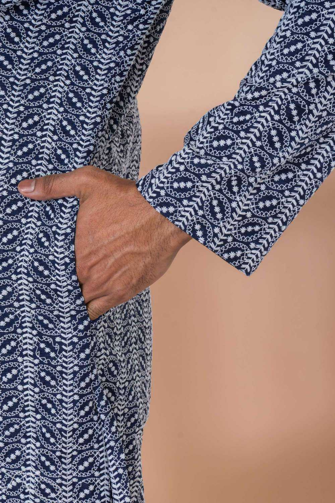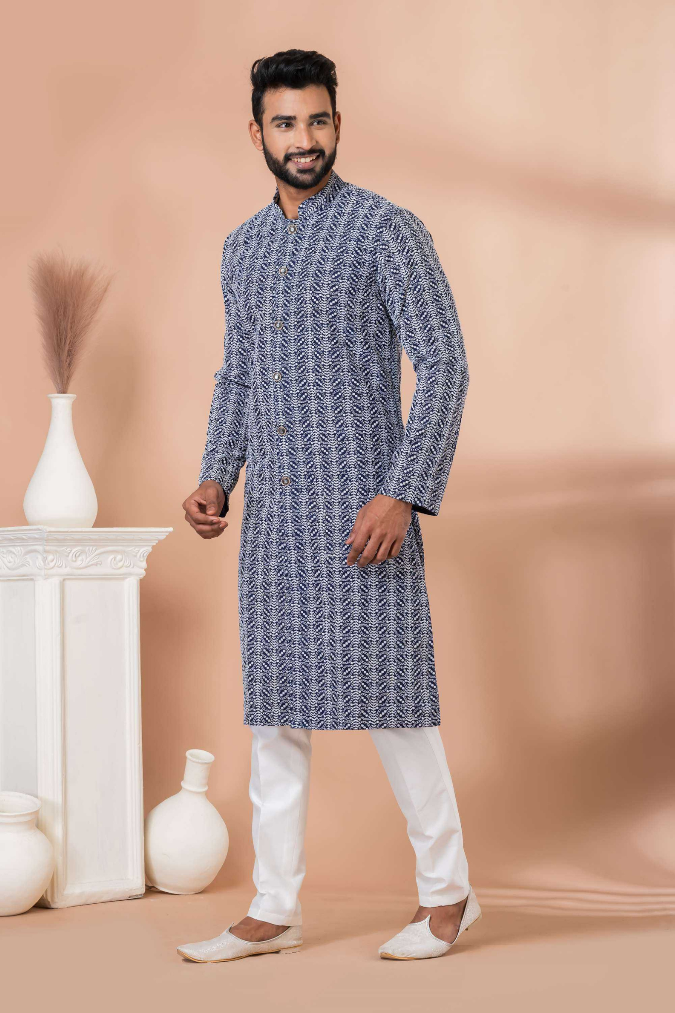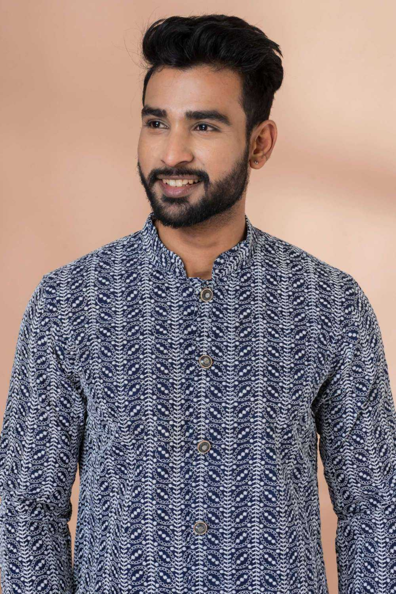 Showcase timeless charm with this elegant men's kurta set crafted from embroidered cotton fabric. The breathable cotton kurta is adorned with intricate embroidery, giving it a sophisticated and festive touch. Paired with a soft Viscose PC bottom for ultimate comfort, this ensemble is a perfect choice for traditional functions, cultural events, and casual festive wear. A fine blend of simplicity and style, designed to keep you comfortable while looking effortlessly graceful.