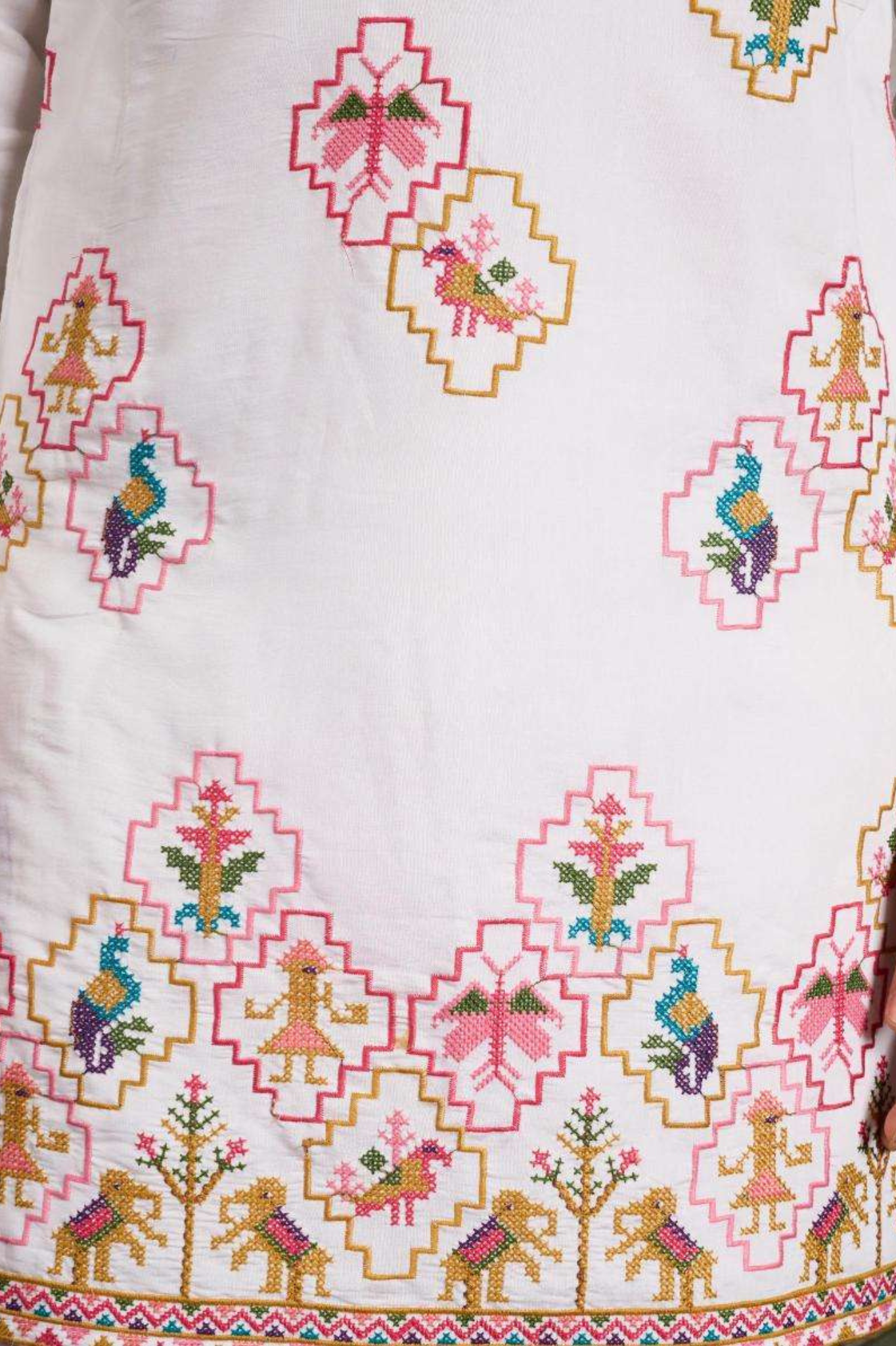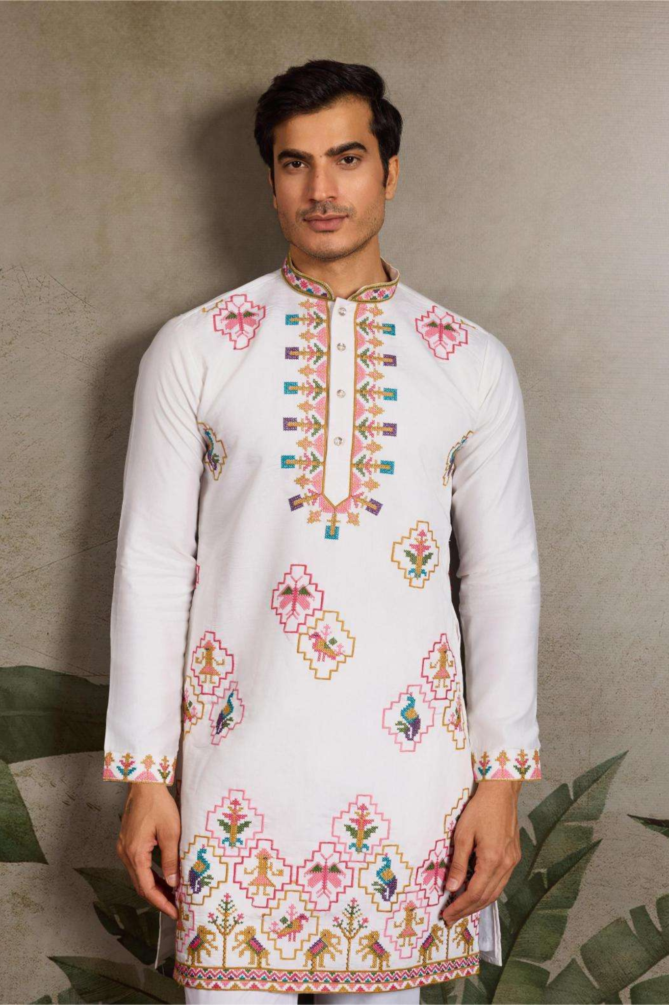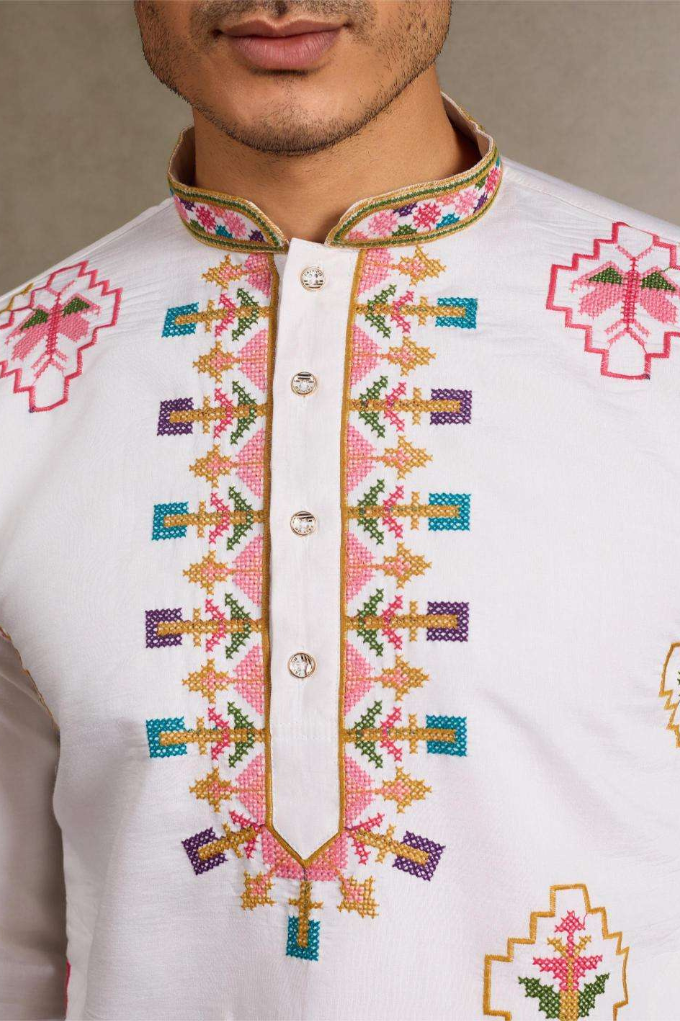 A perfect fusion of tradition and style. This white kurta is crafted with intricate multicolour embroidery, making it a standout...