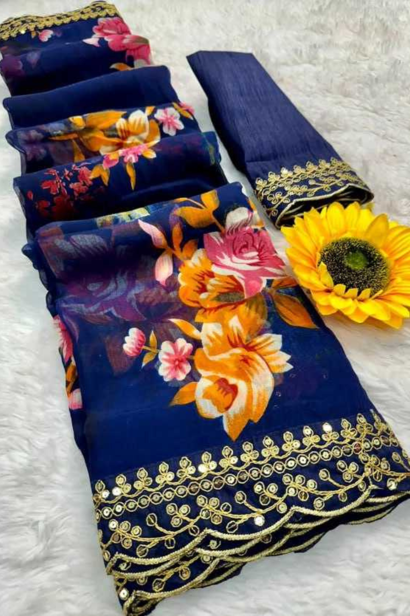 Blue Floral Georgette Saree with Golden Embroidered Lace Border