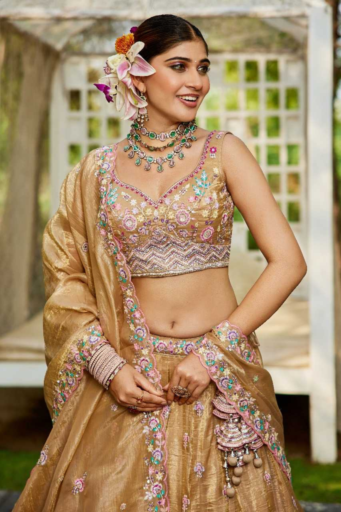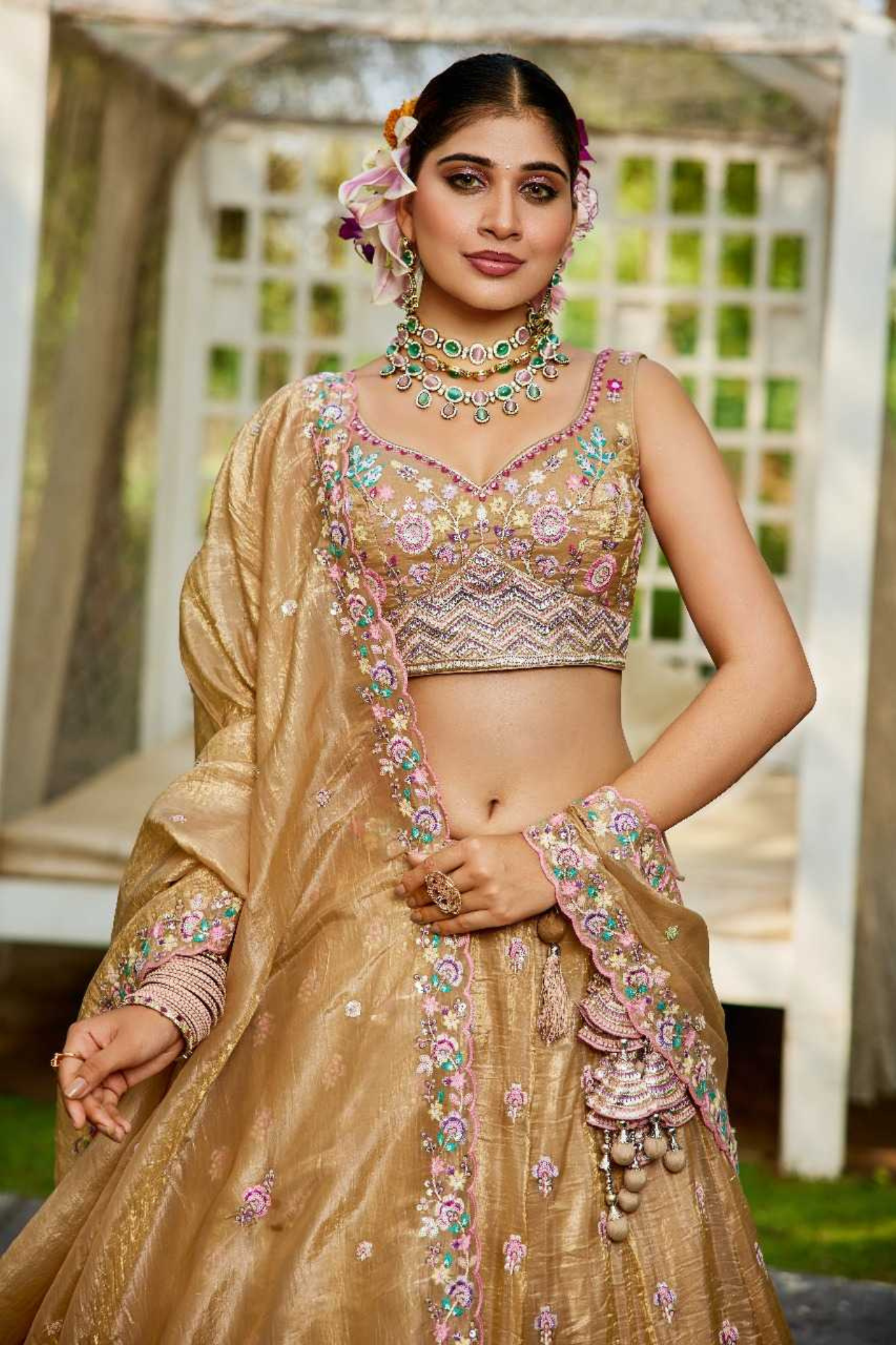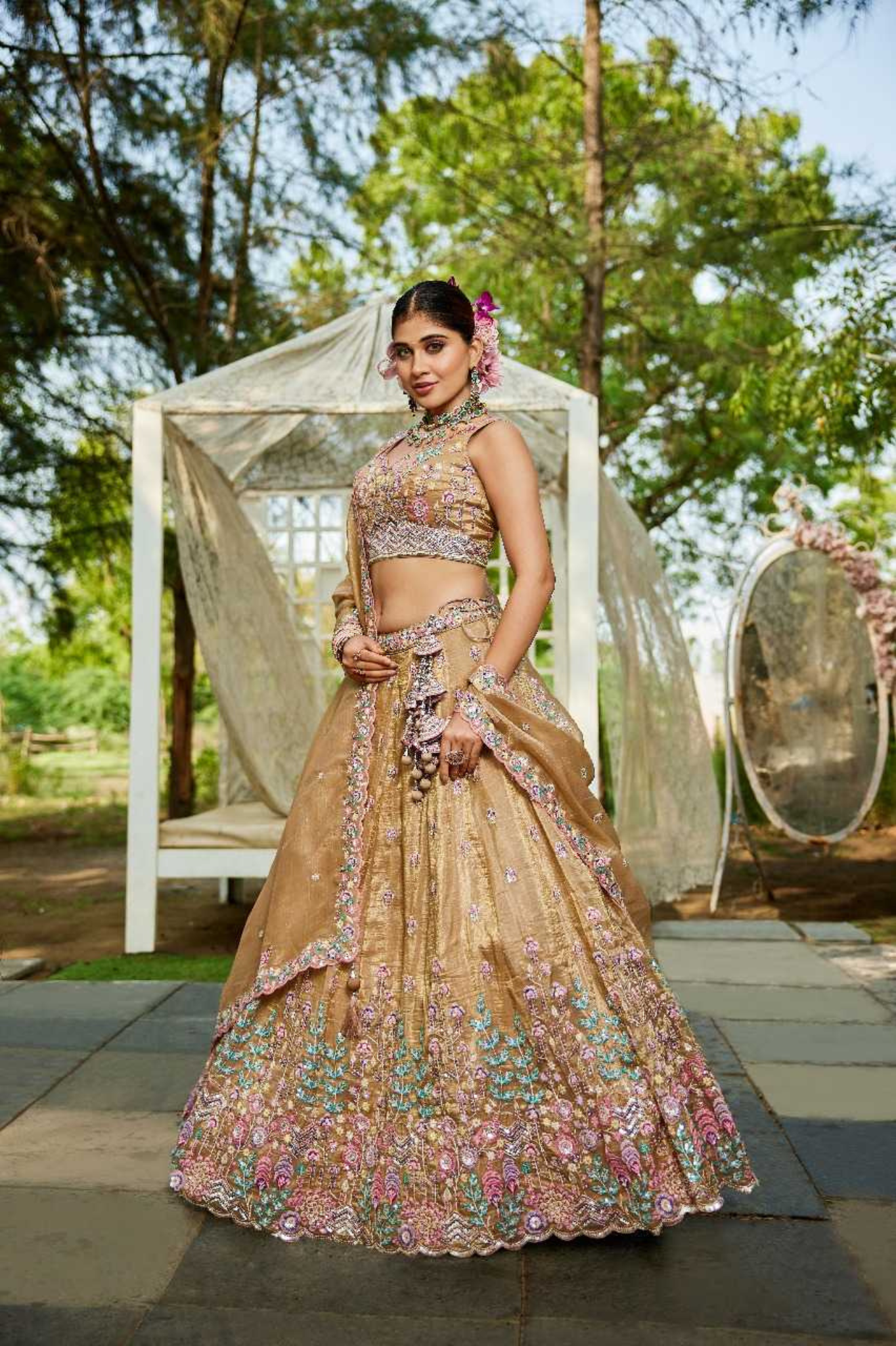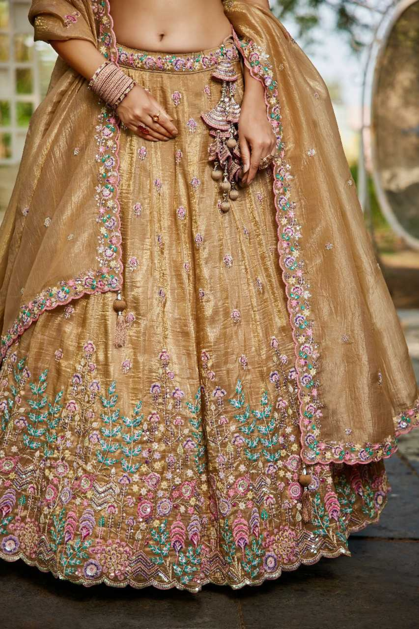 Shine with grace in this exquisite tissue lehenga set designed with delicate embroidery and floral motifs in pastel shades. The...