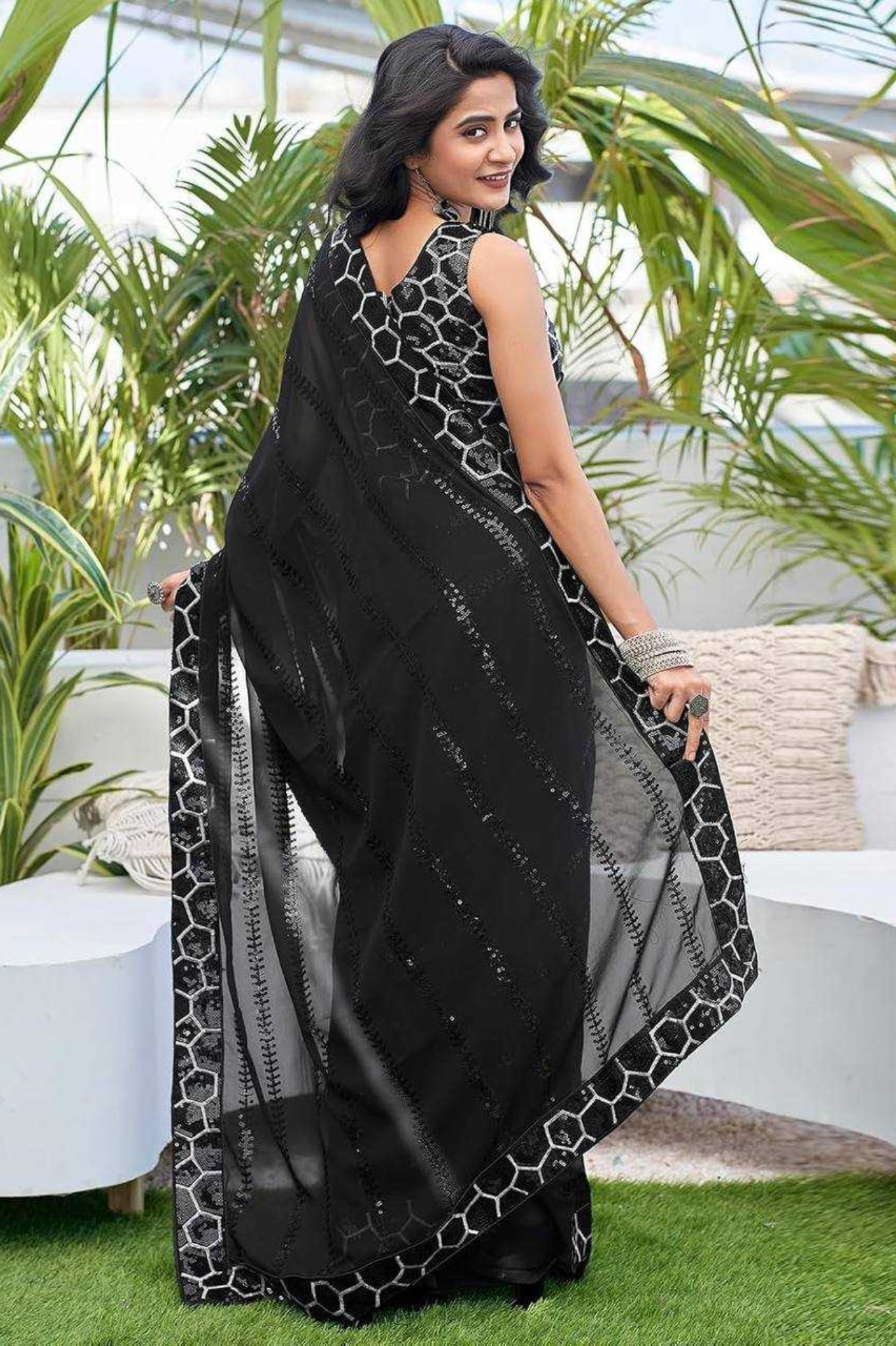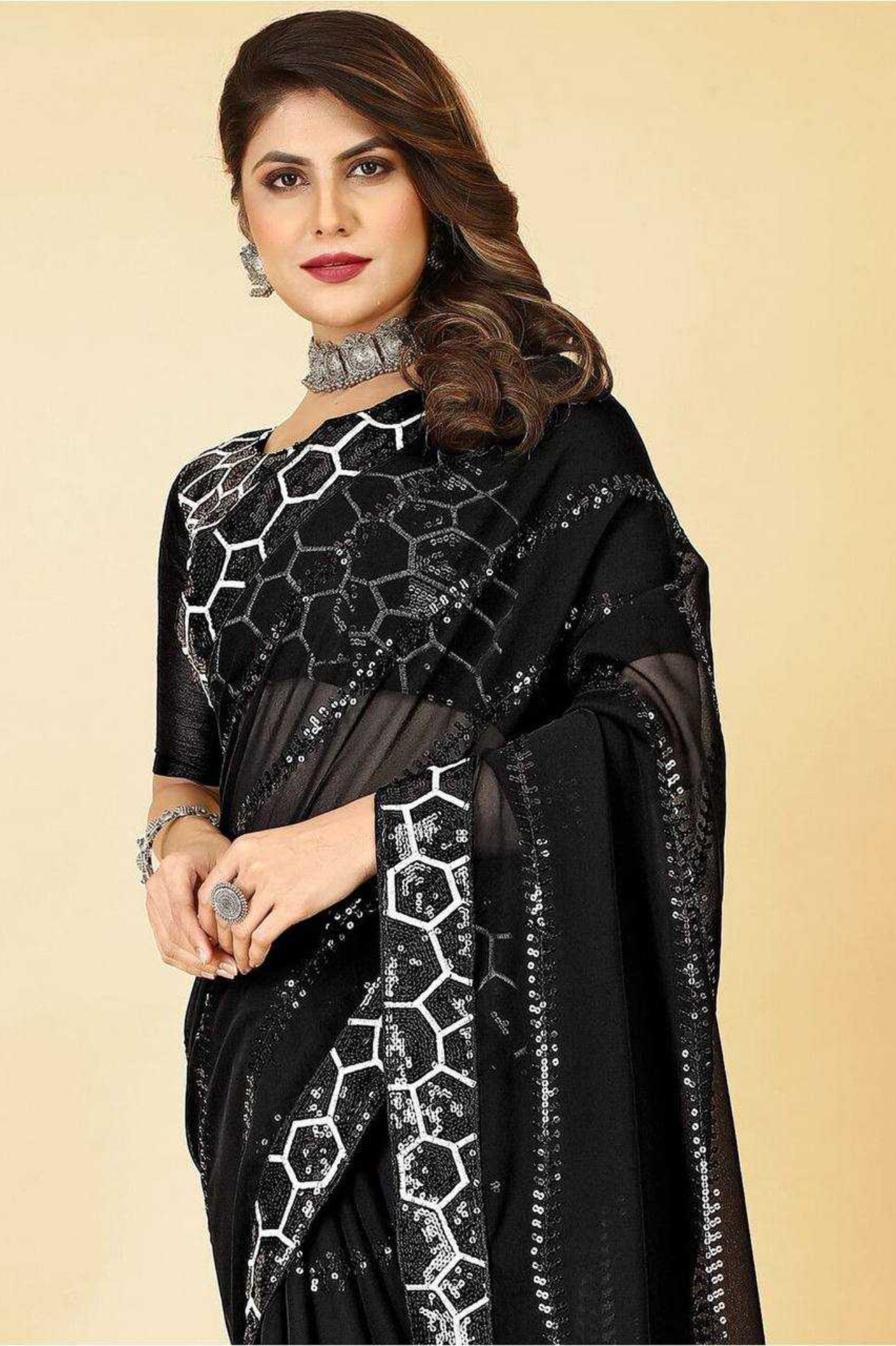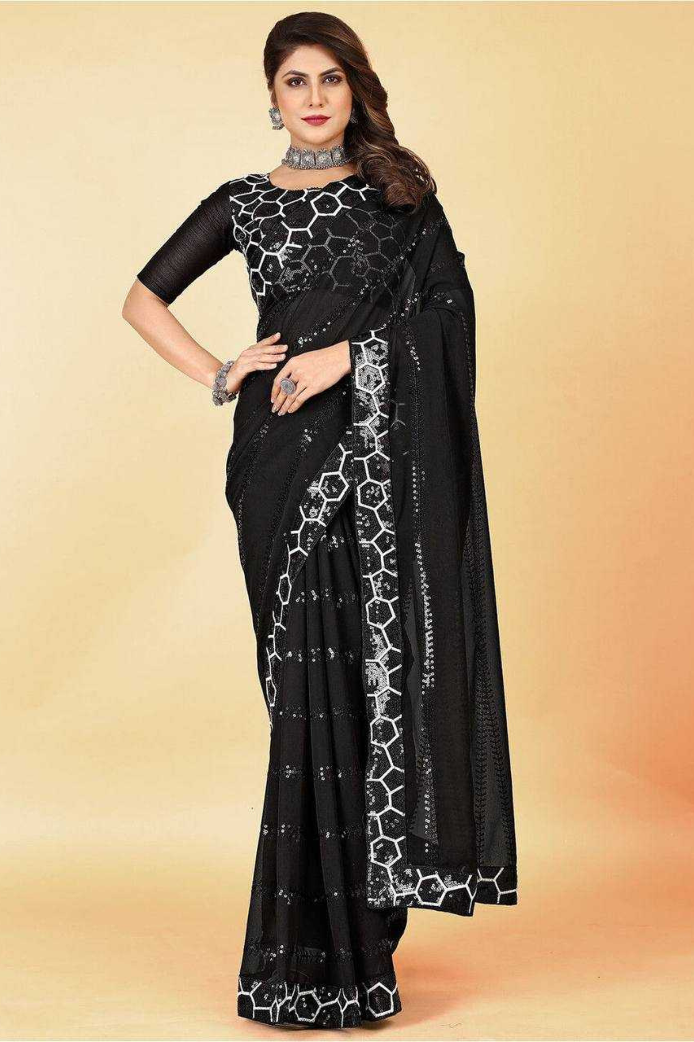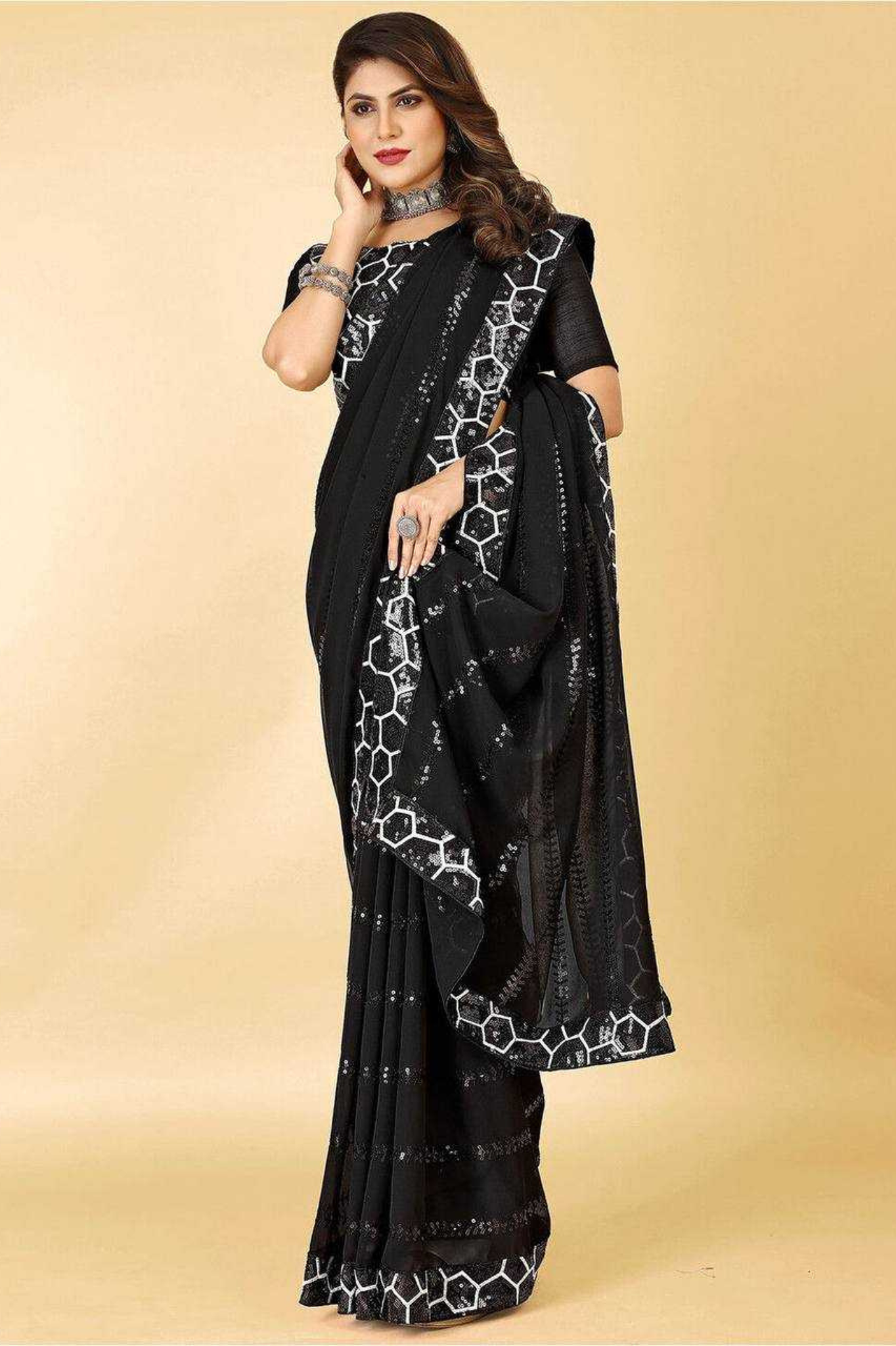Black Heavy Georgette Saree with All-Over Sequin Embroidery and Fancy Lace Border