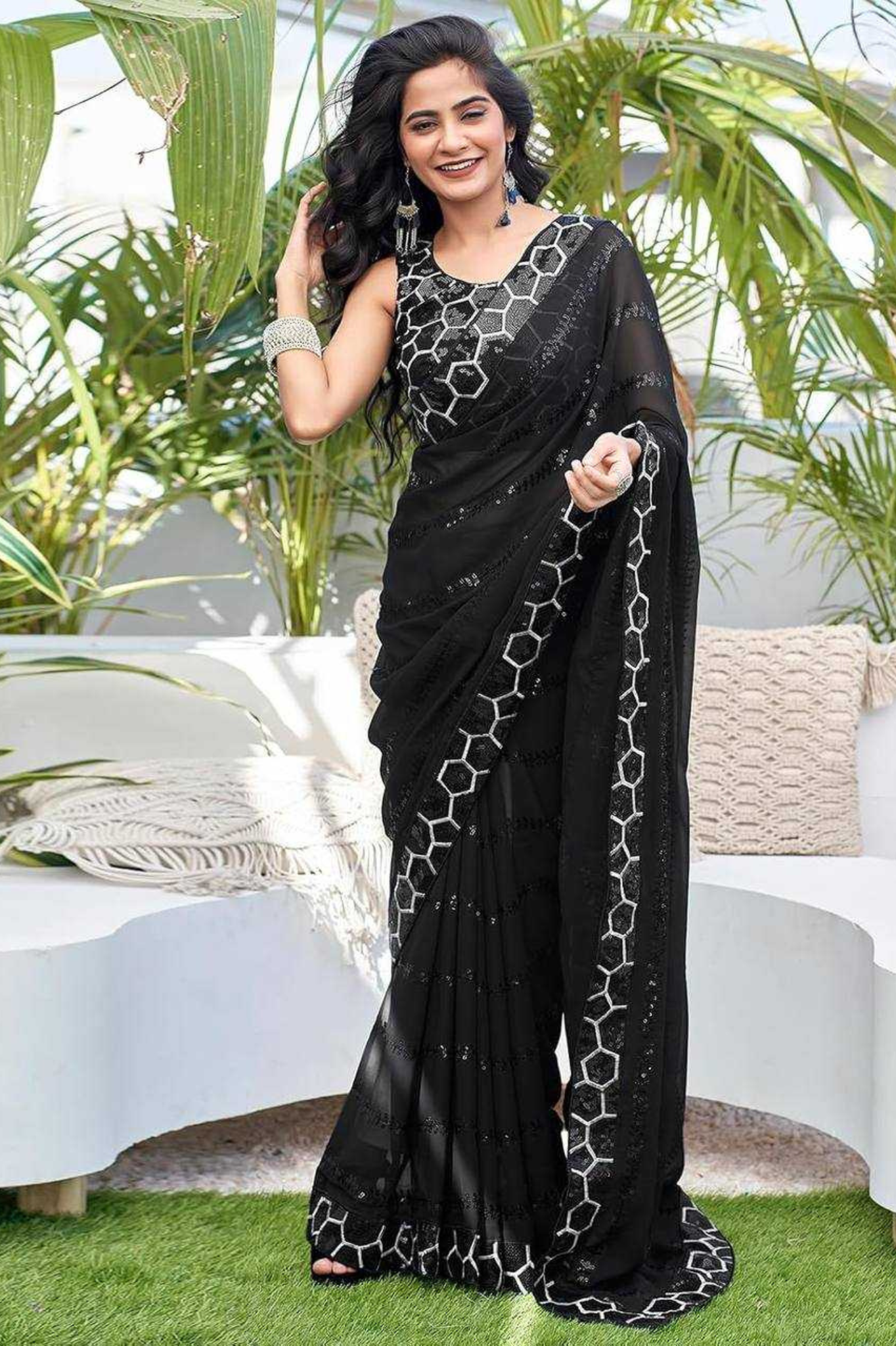 Make a statement in this black heavy georgette saree, exquisitely designed with all-over embroidery sequin work and a fancy lace border that adds a touch of modern glamour. The saree comes paired with a mono Banglory silk blouse featuring front and back sequin embroidery, creating a bold and sophisticated look perfect for parties, receptions, and festive evenings.
