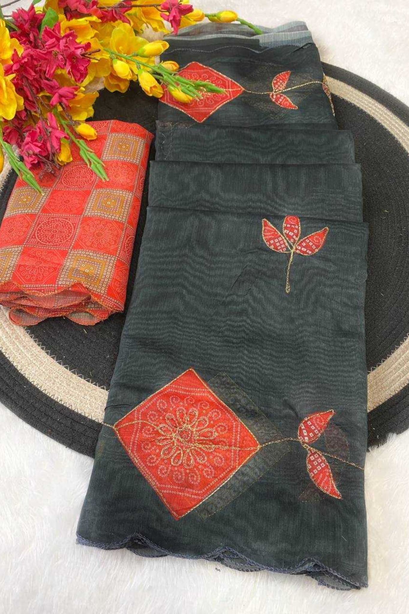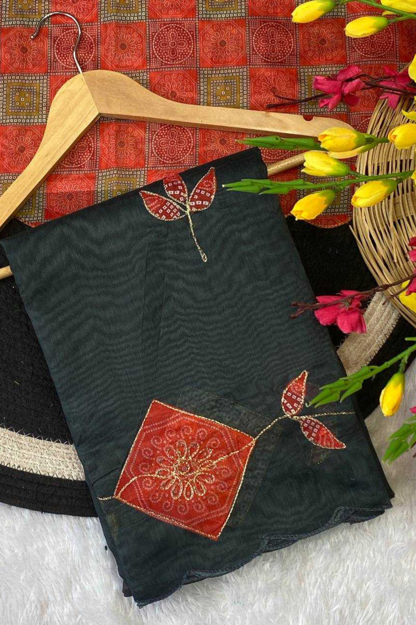 Black Soft Chanderi Cotton Saree with Embroidery & Zari Patti Border