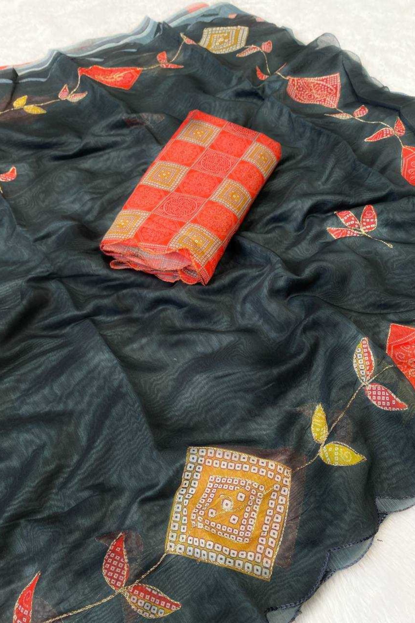 An elegant drape crafted from premium crunchy chiffon, this saree features a graceful scallop design with fine thread embroidery work, making it a timeless addition to your festive and wedding wardrobe. The satin digital print blouse complements the saree beautifully, adding a modern touch...