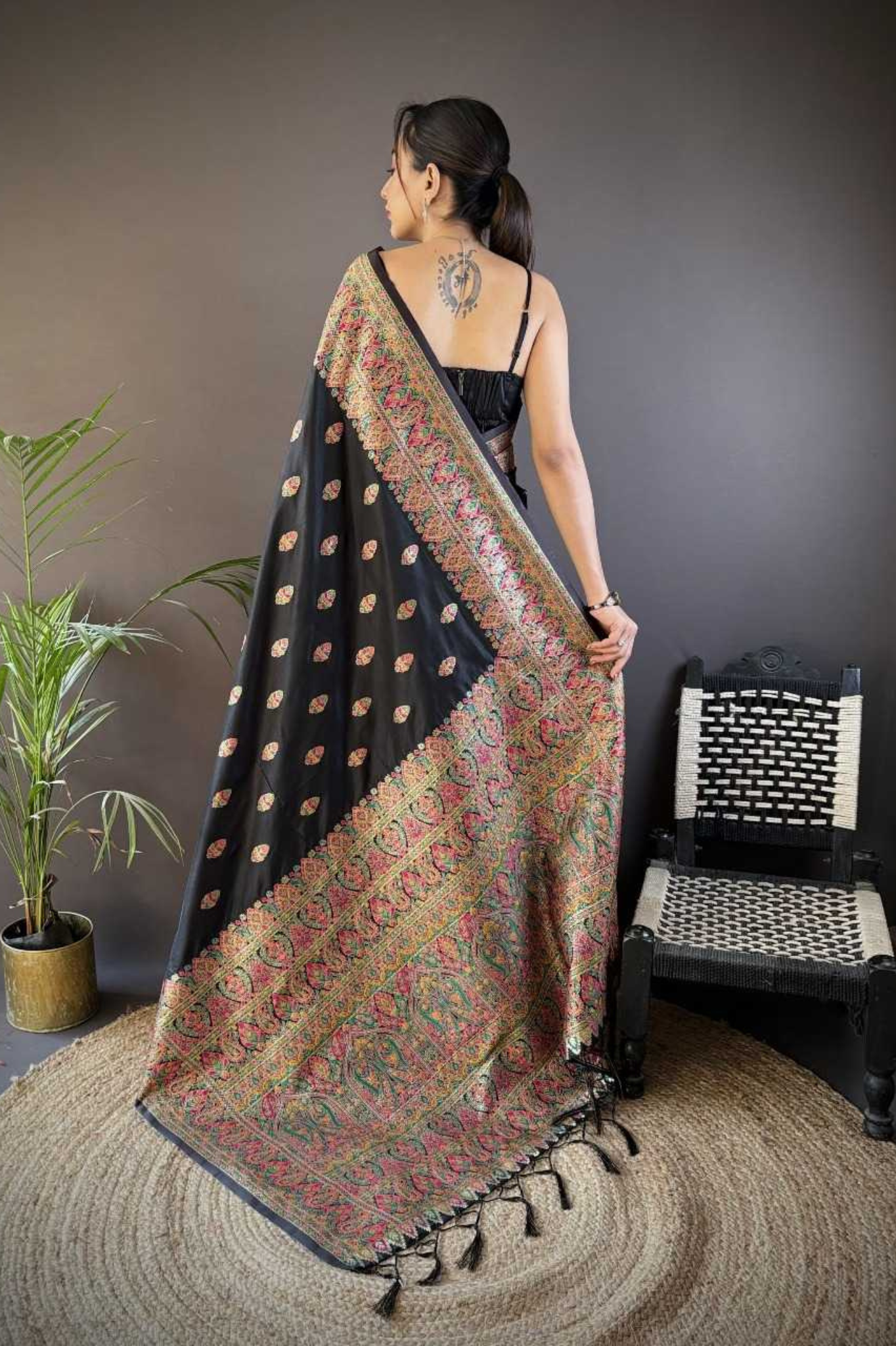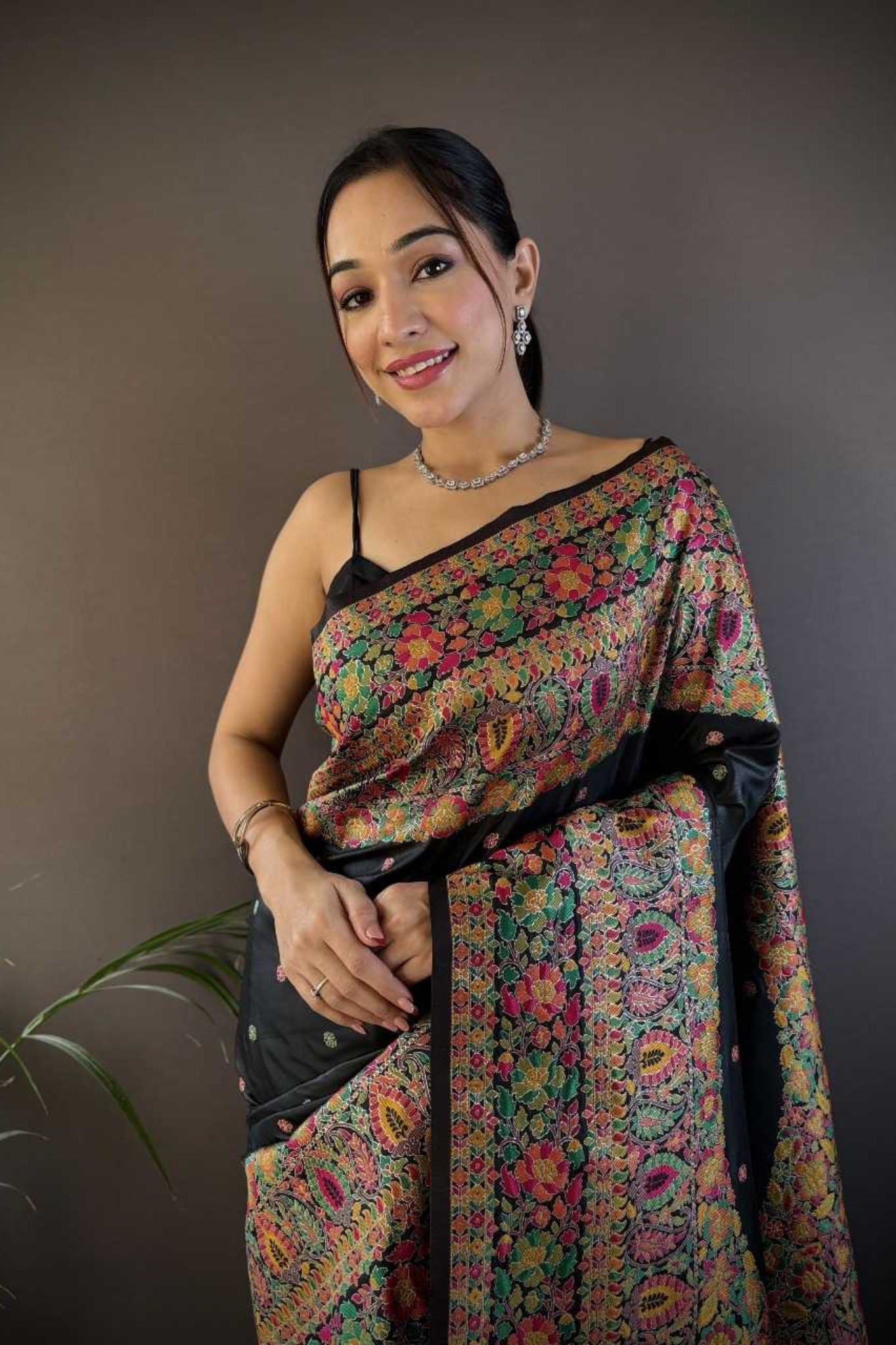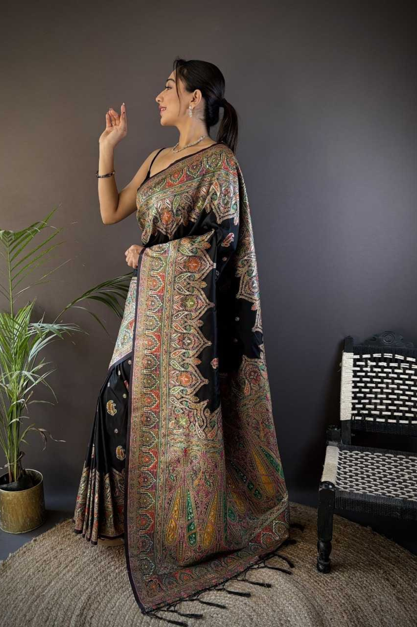 Black Soft Kashmiri Pashmina Silk Saree with Intricate Weaving Work