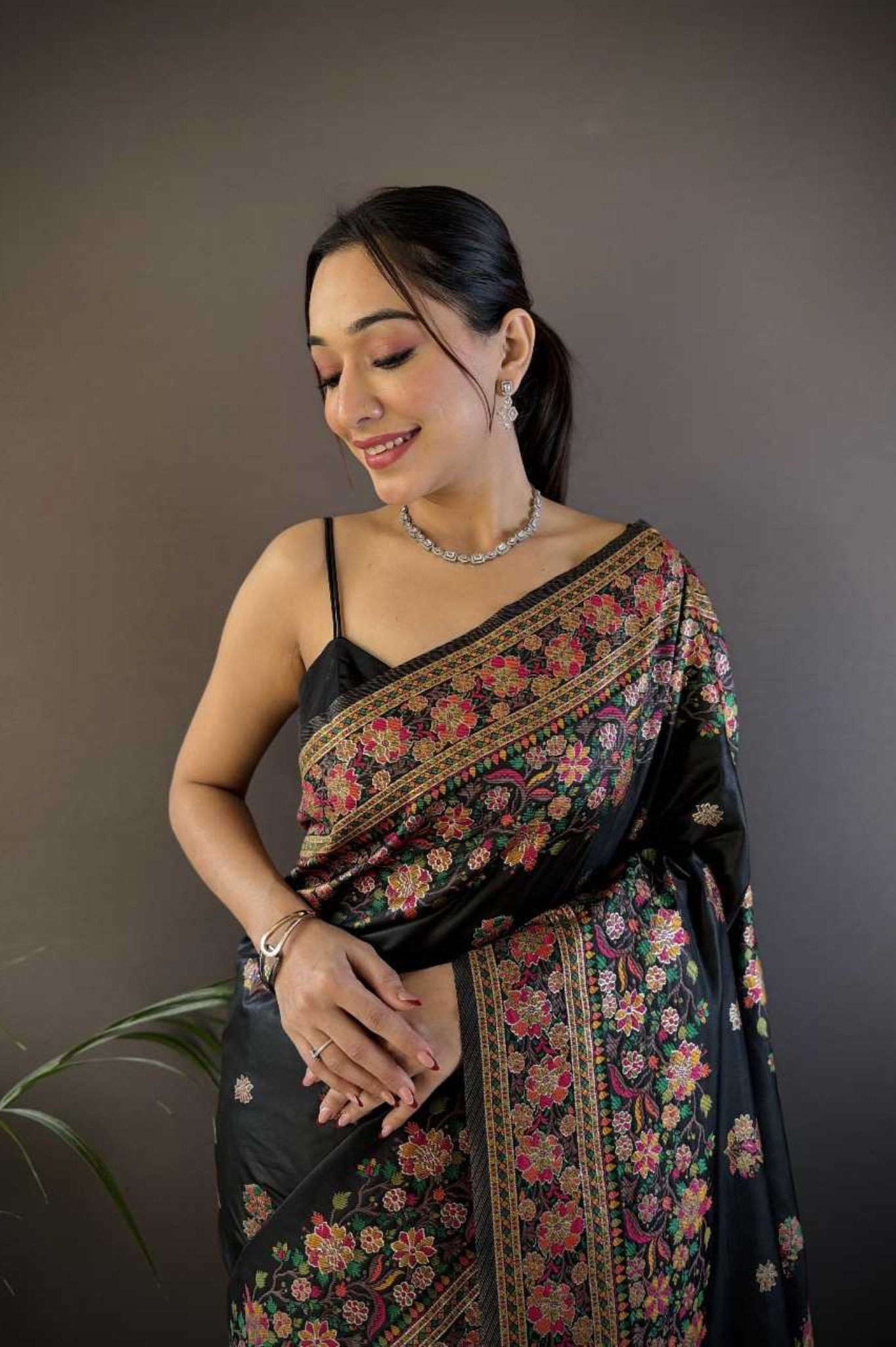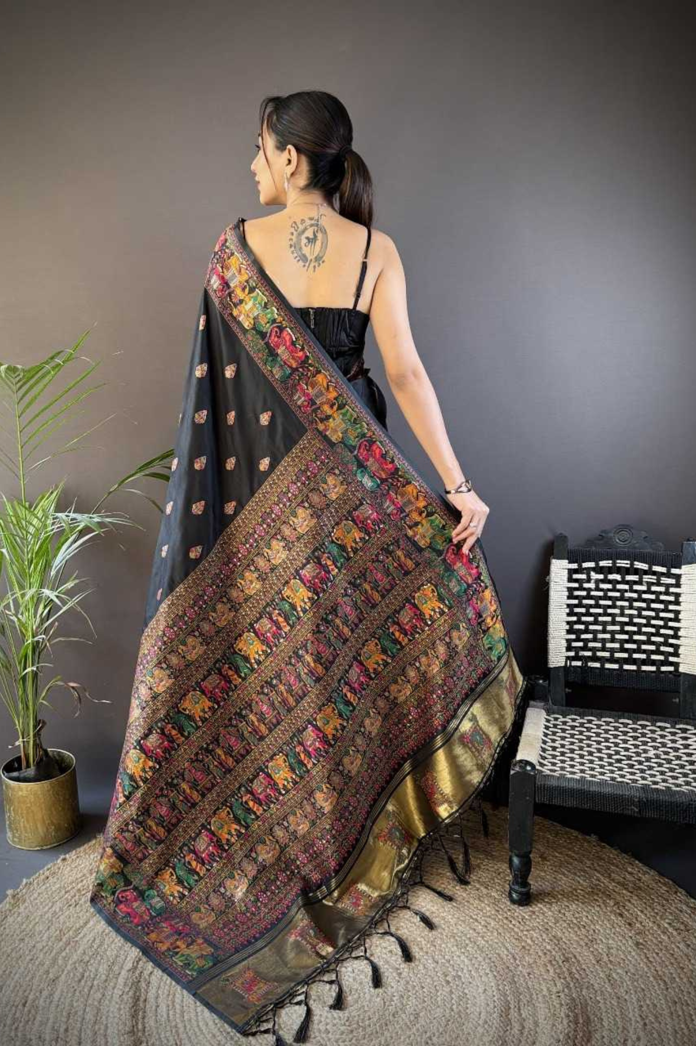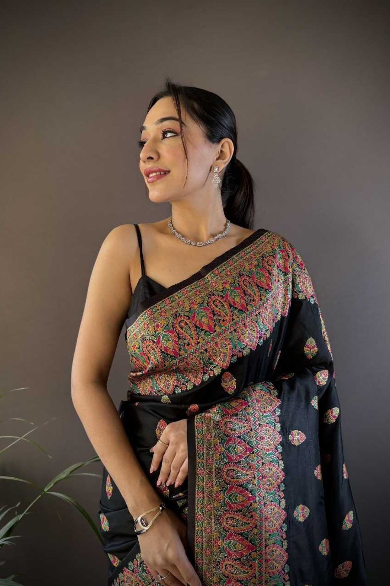 Black Soft Kashmiri Pashmina Silk Saree with Intricate Weaving Work