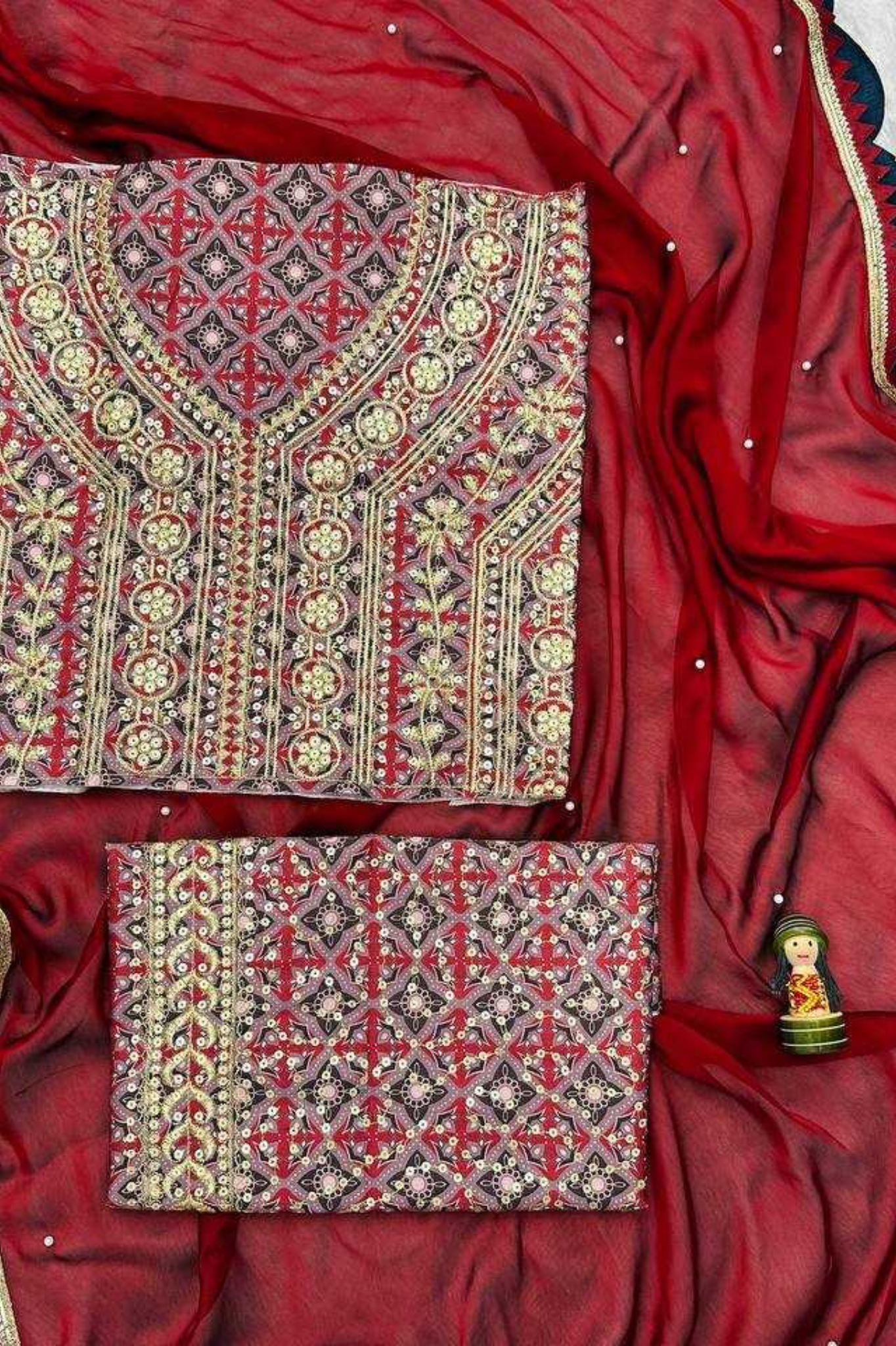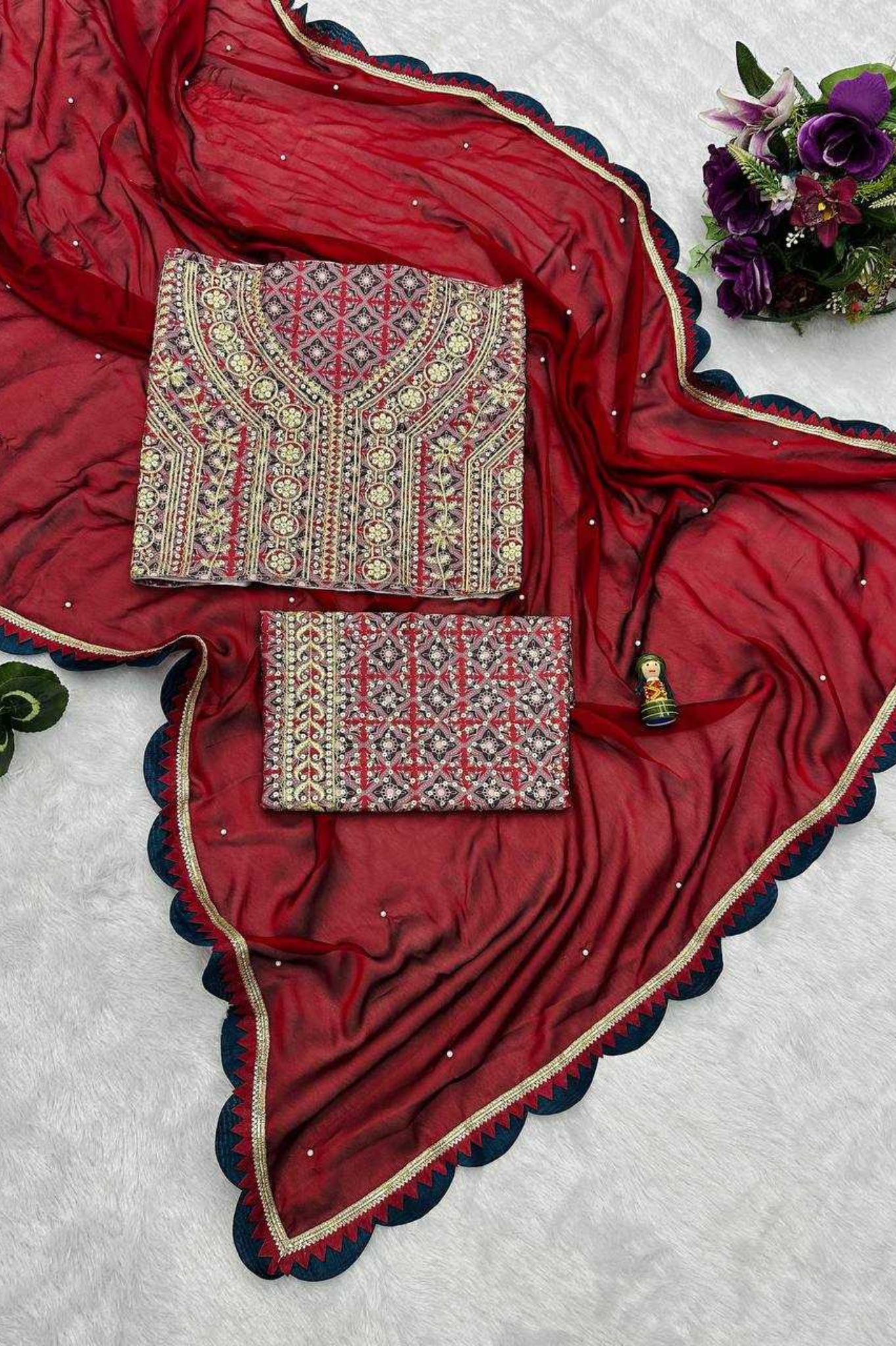 An elegant drape crafted from premium crunchy chiffon, this saree features a graceful scallop design with fine thread embroidery work, making it a timeless addition to your festive and wedding wardrobe. The satin digital print blouse complements the saree beautifully, adding a modern touch...