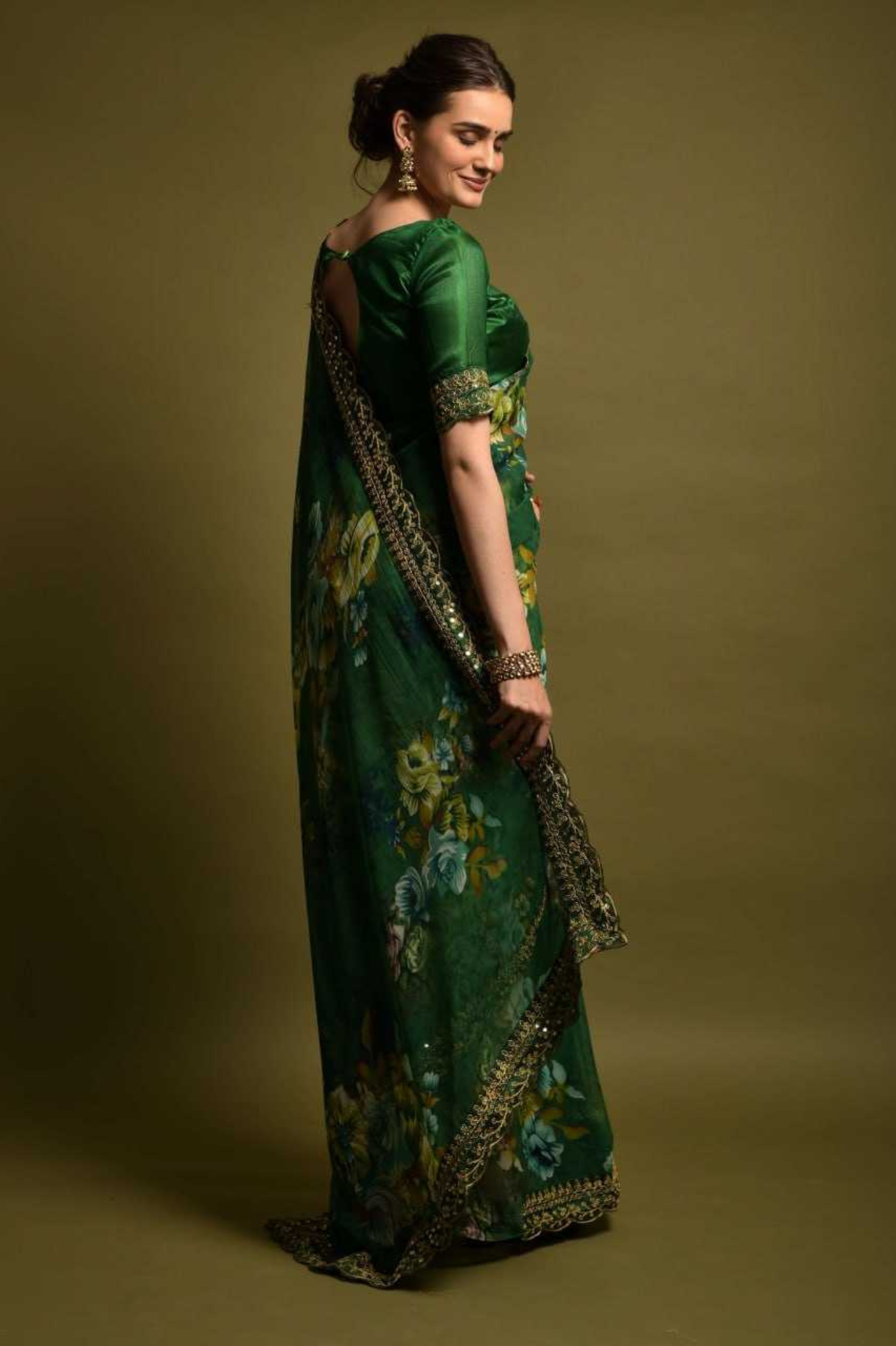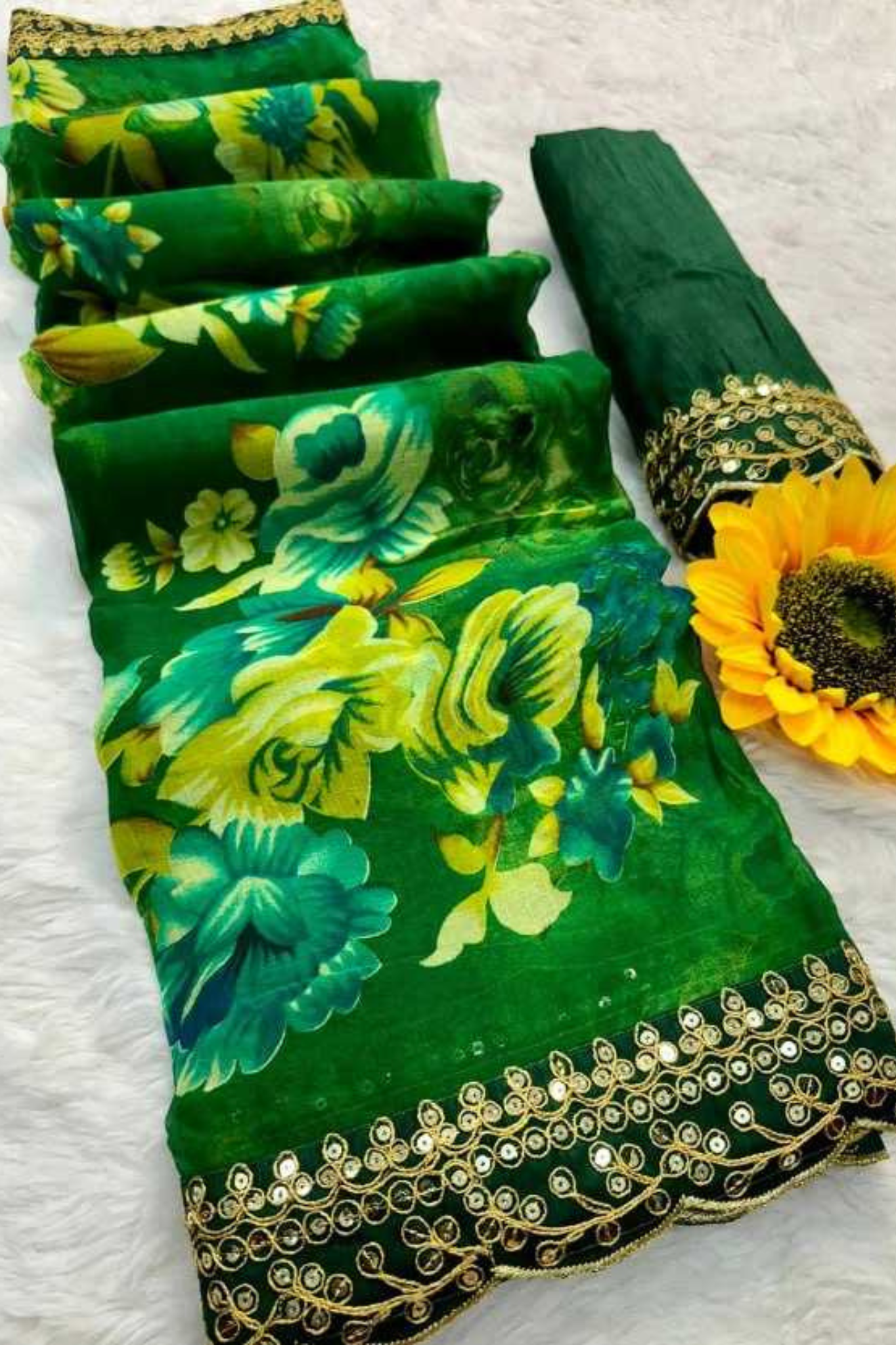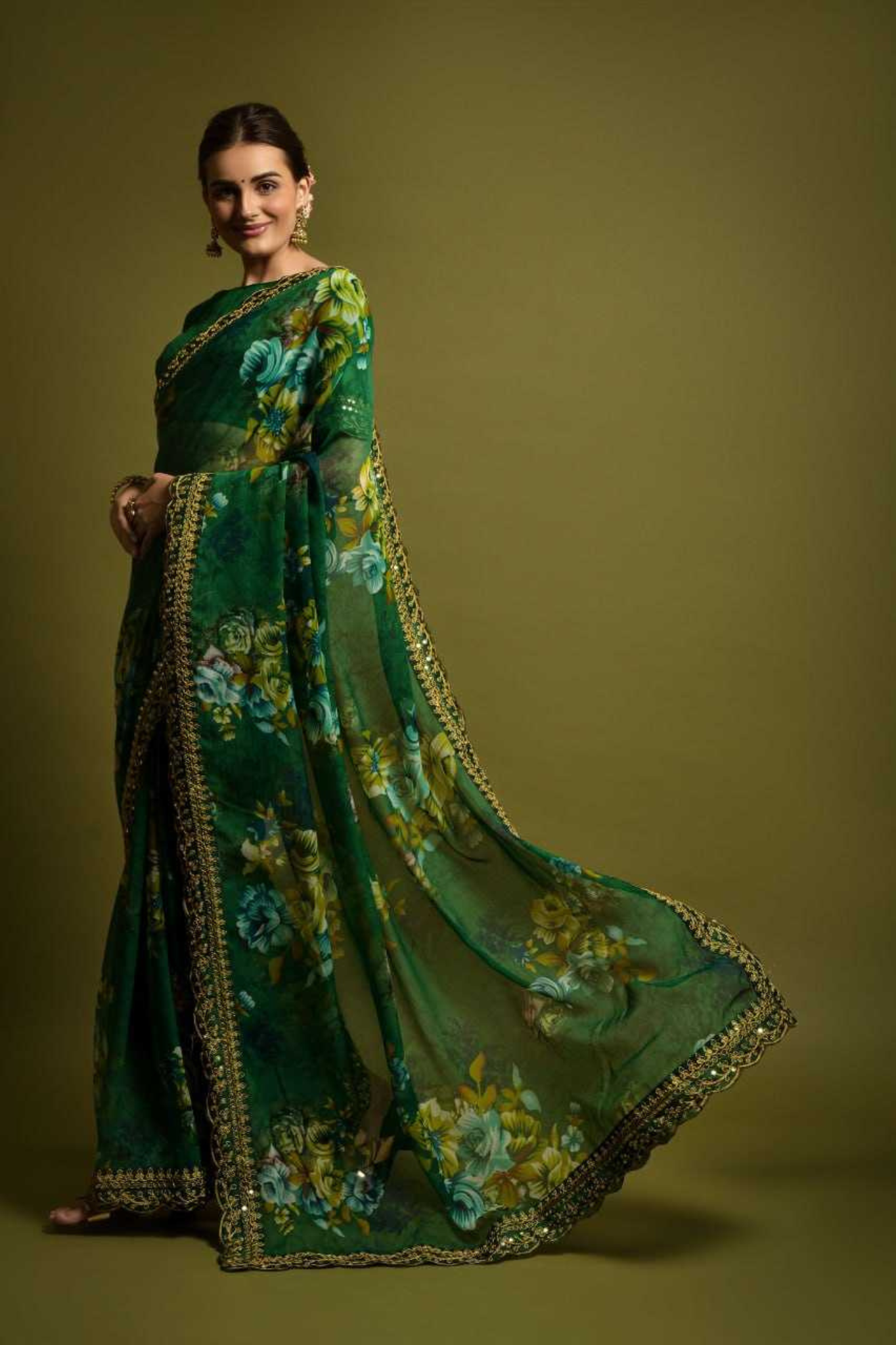 Embrace timeless elegance with this Green georgette saree, featuring a bold floral print and a stunning golden embroidered lace border....