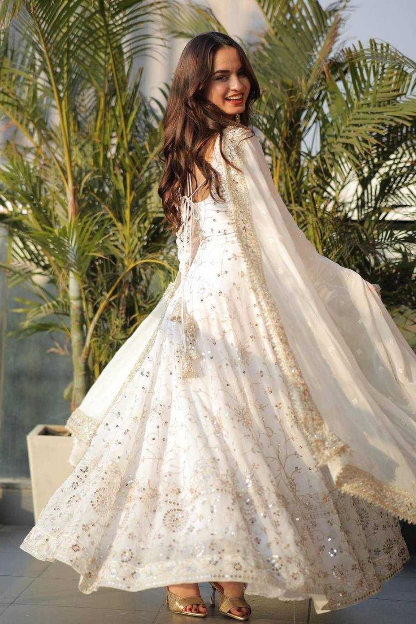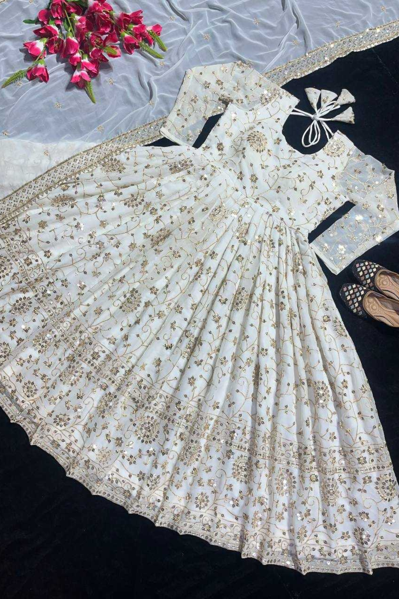 White Faux Georgette Sequin Embroidered Gown with Dupatta