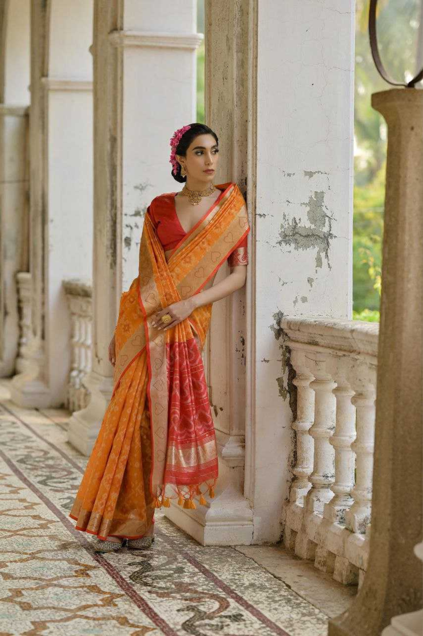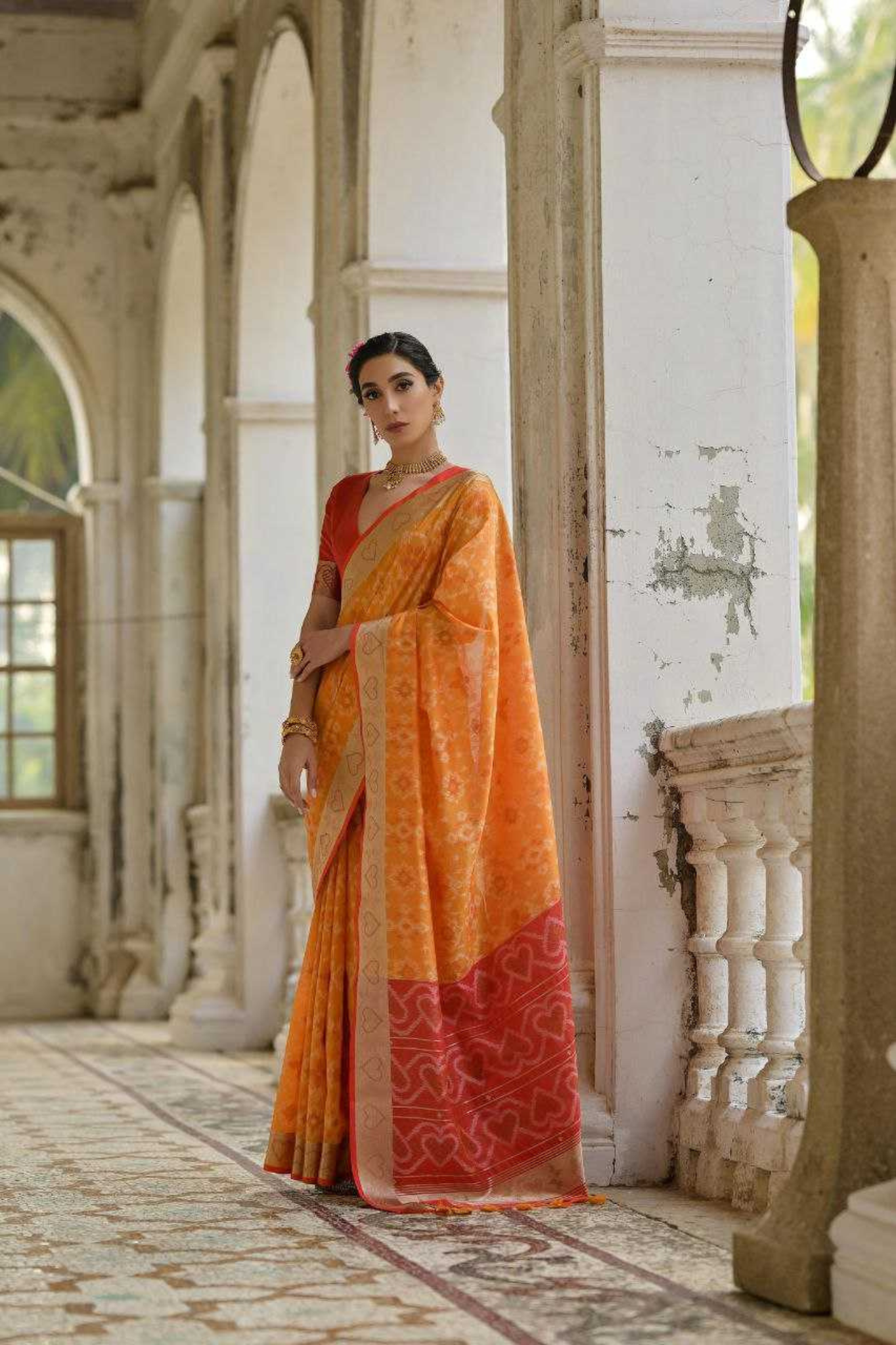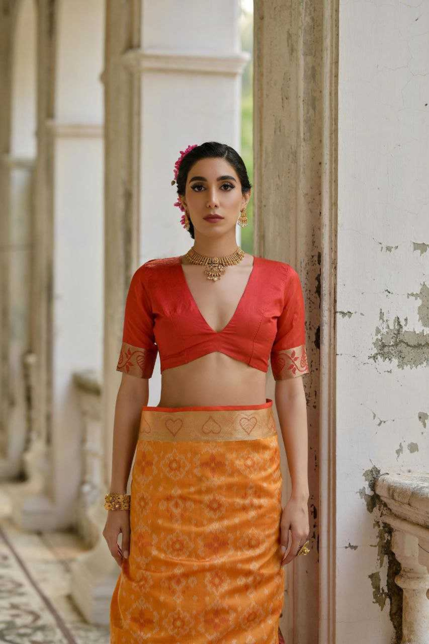 Orange Soft Desi Raw Silk Saree with Pochampally Ikkat Concept & Zari Weaving Border