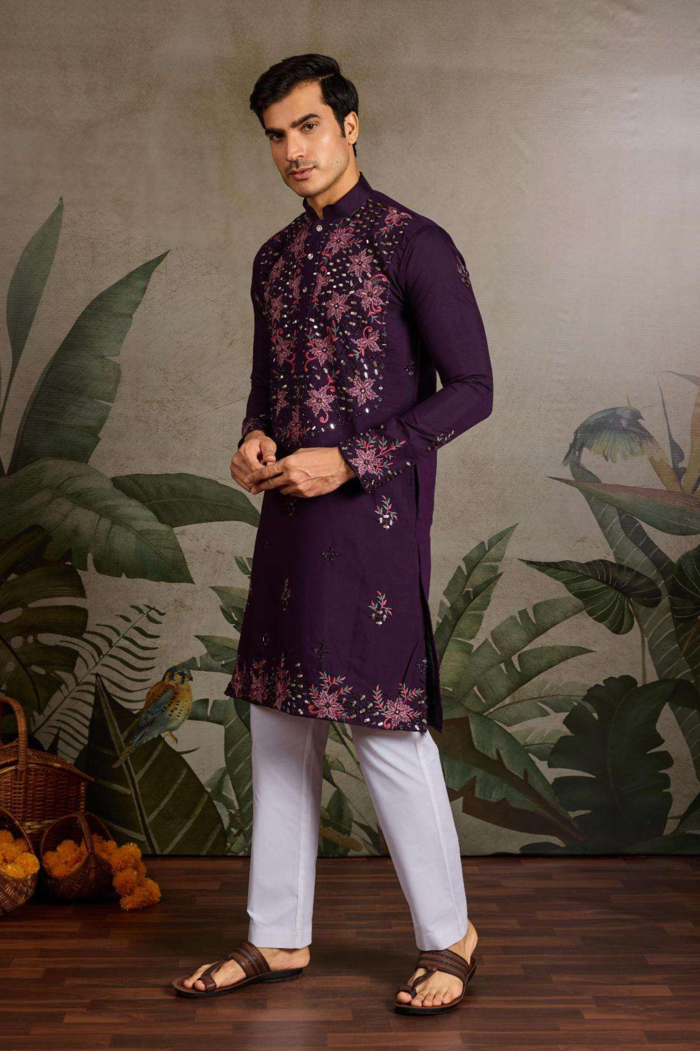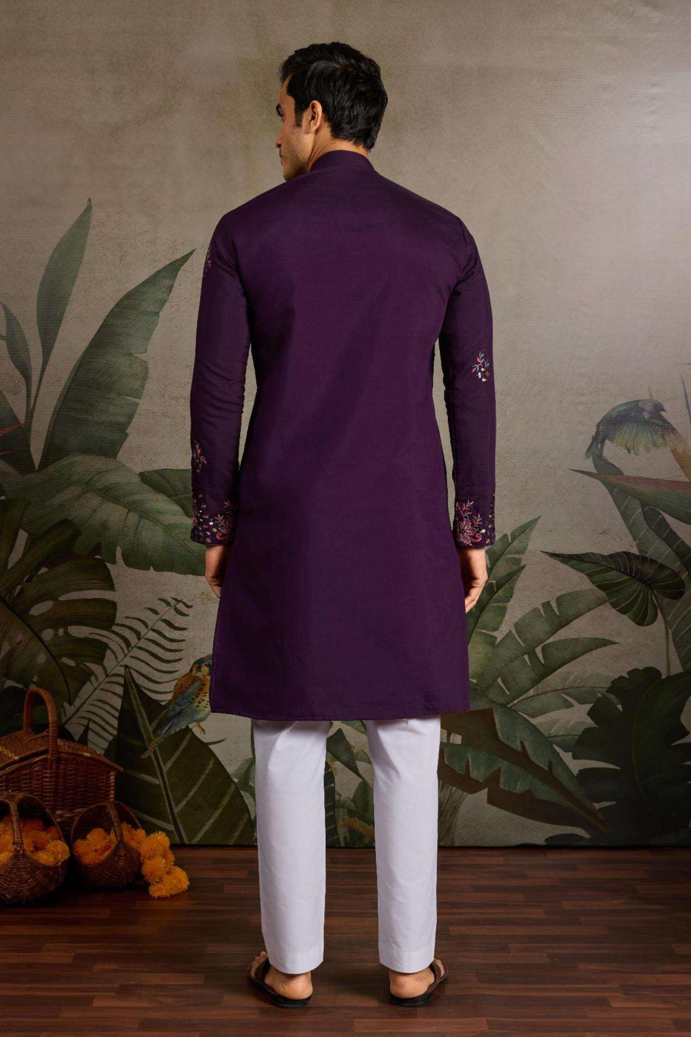 This Purple Kurta Set is crafted for elegance and grandeur, featuring exquisite embroidery in floral patterns on the front side and sleeves with lace work (0.8 MTR) and detailed embroidery on the back side with sleeves (1.1 MTR). Paired with a crisp white pant, this outfit brings a perfect balance of regal style and modern sophistication.