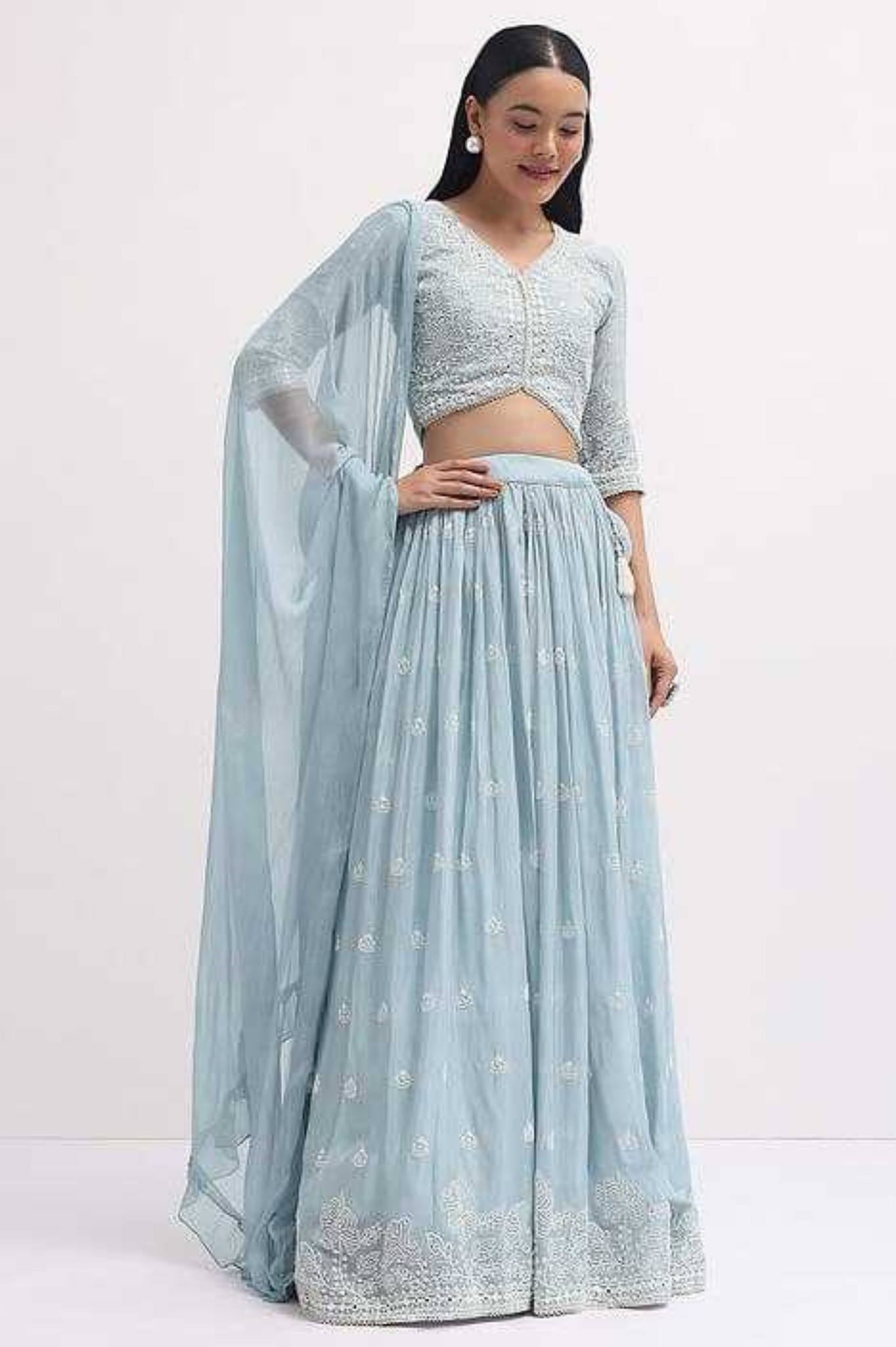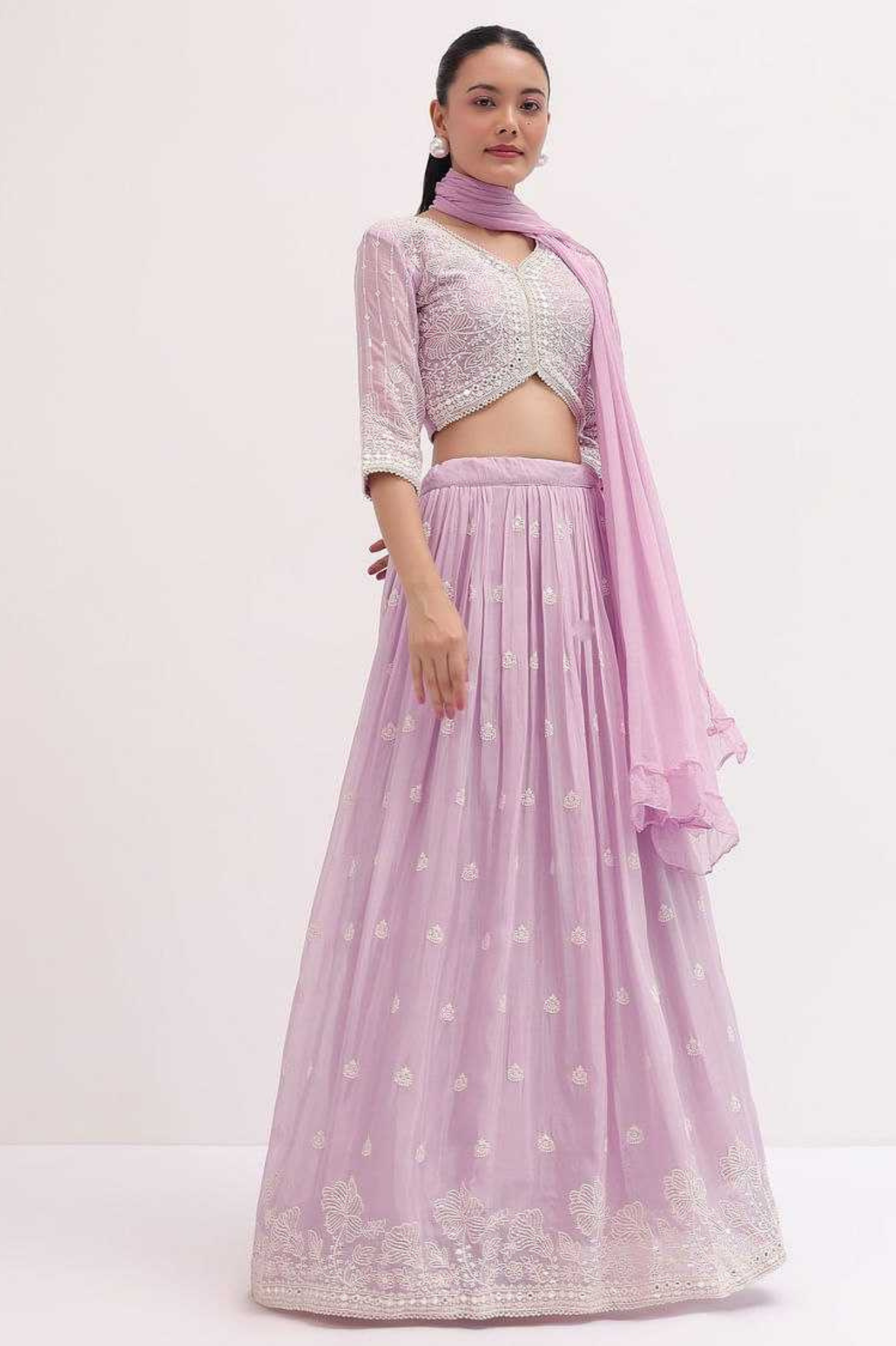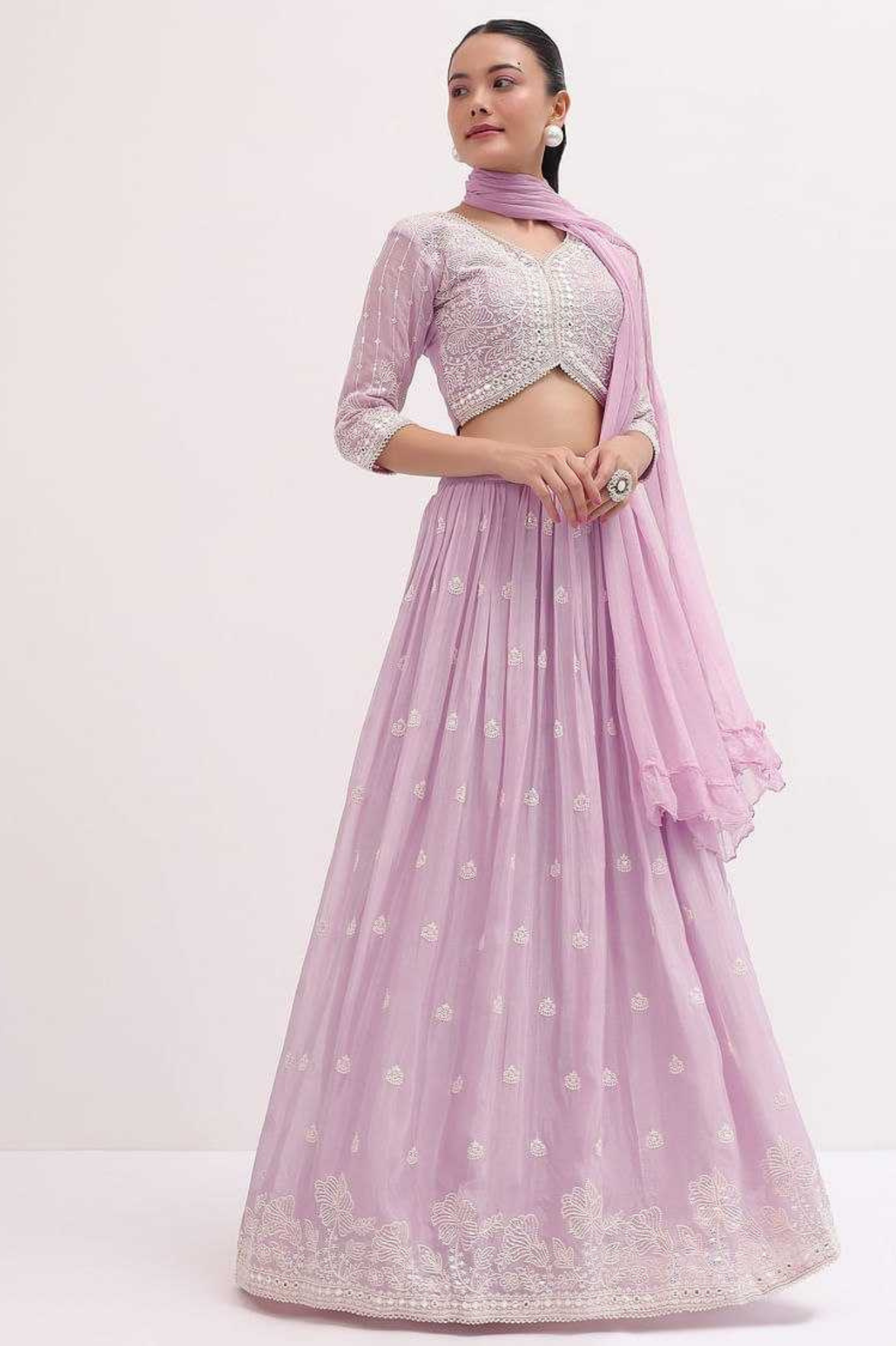 This vibrant yellow georgette lehenga choli set is a perfect choice for festive and wedding occasions. The lehenga is adorned with delicate embroidery and subtle motifs, adding elegance to its flowy silhouette. It is paired with a beautifully embroidered georgette blouse featuring a stylish cut and detailed work, and a lightweight georgette dupatta that completes the look with finesse.