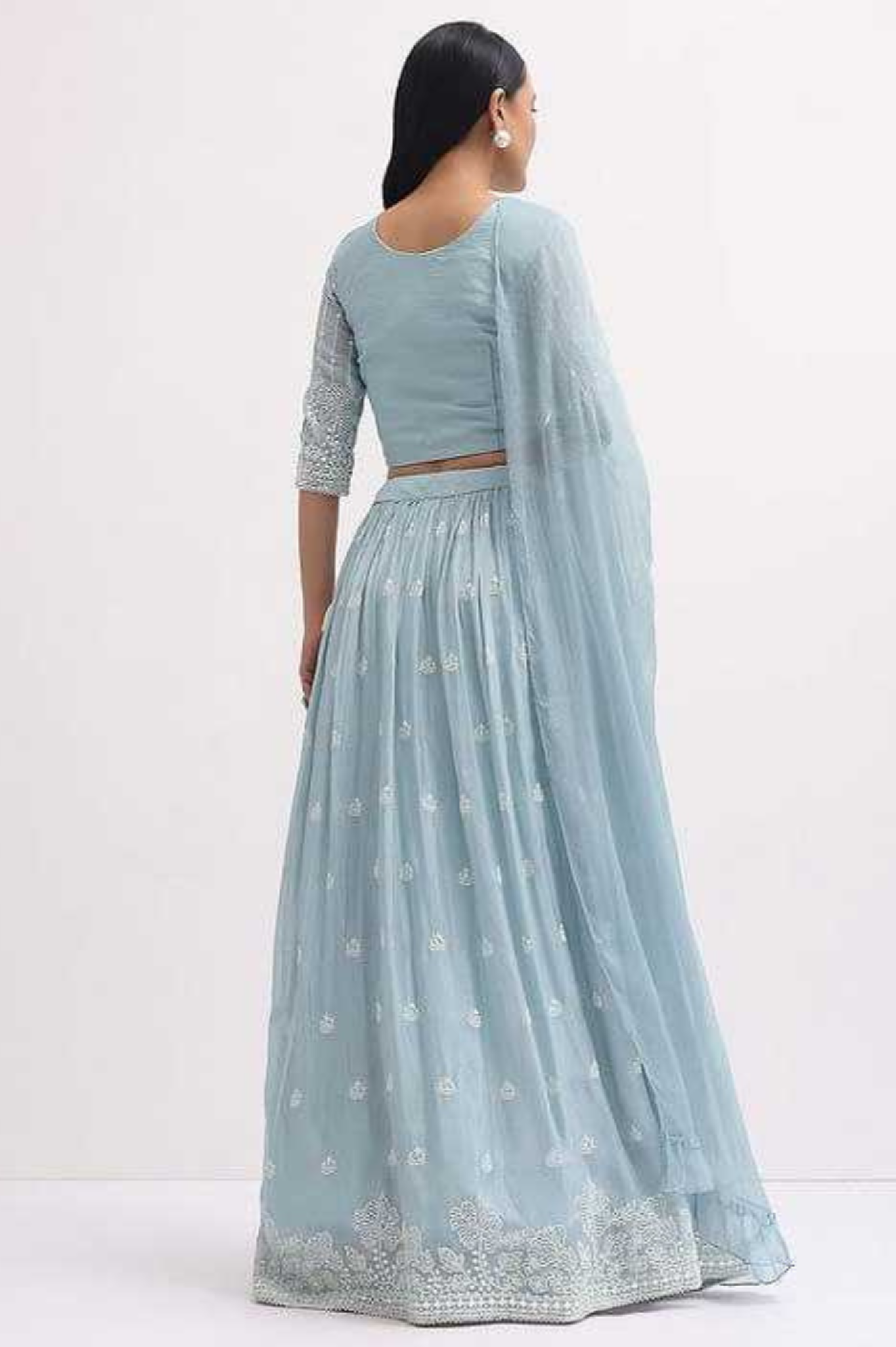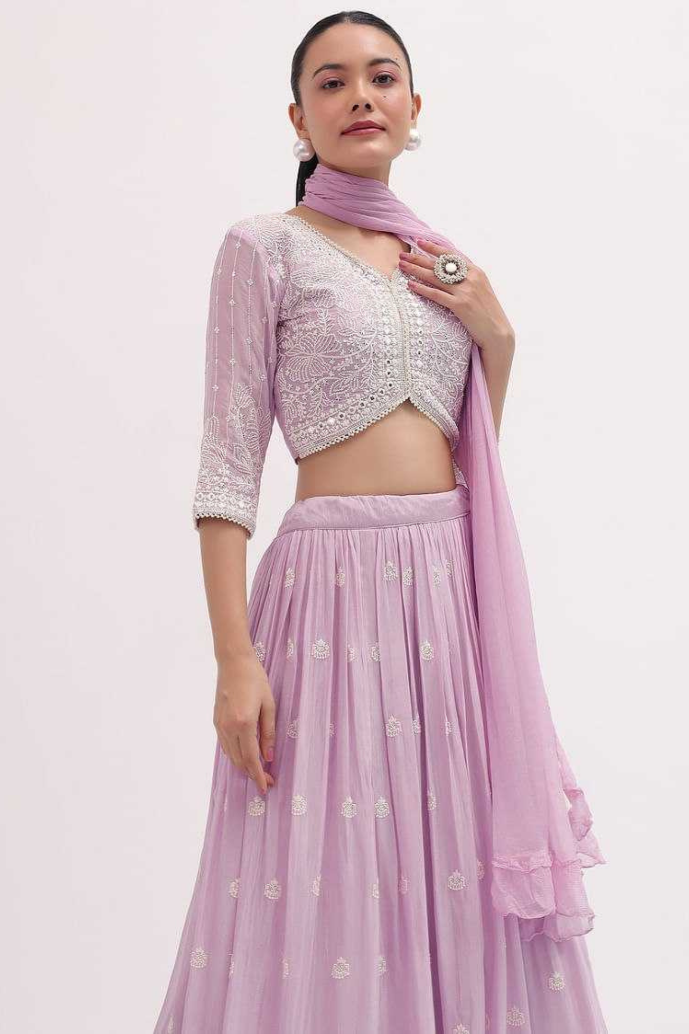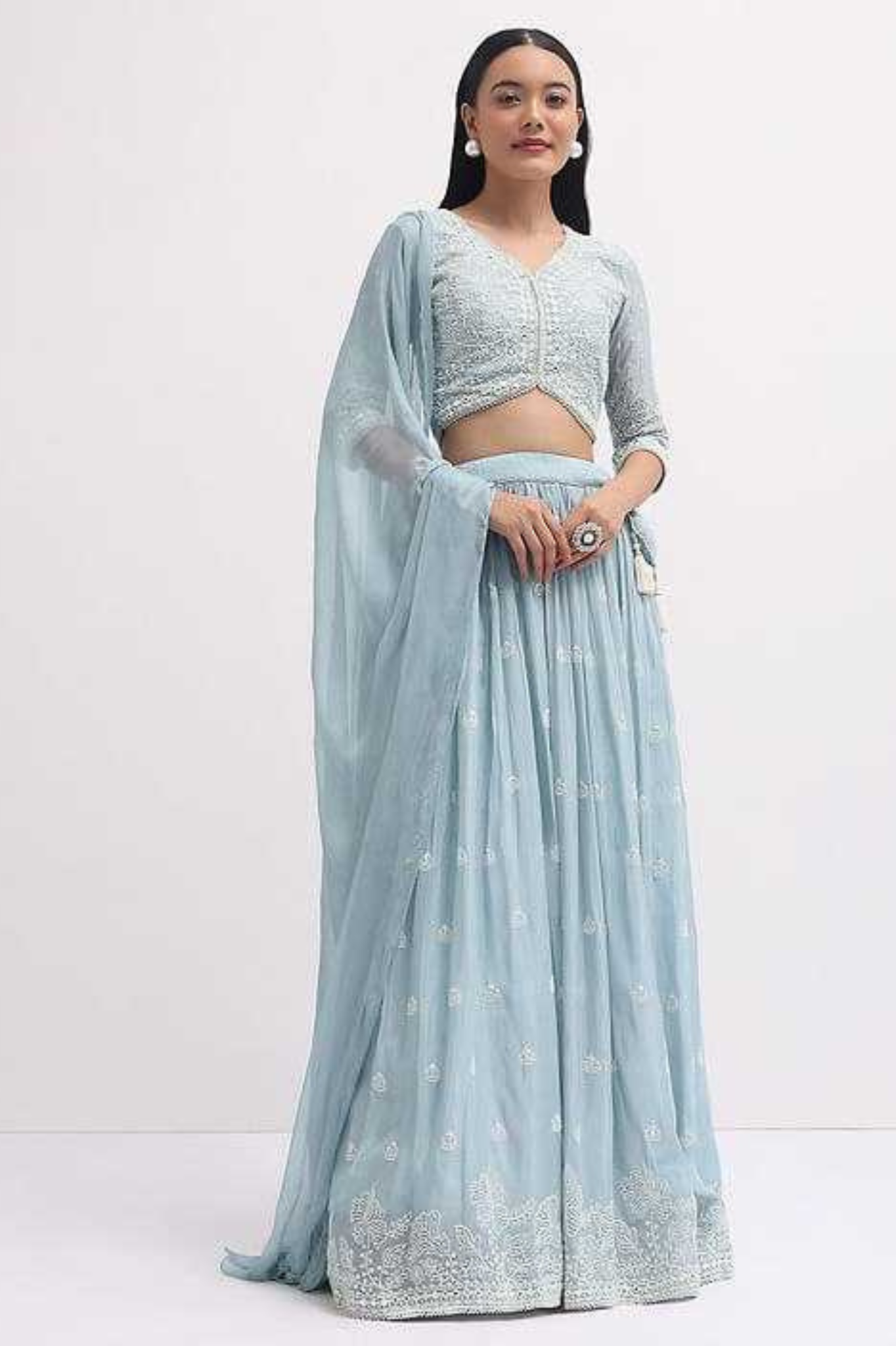 This vibrant yellow georgette lehenga choli set is a perfect choice for festive and wedding occasions. The lehenga is adorned with delicate embroidery and subtle motifs, adding elegance to its flowy silhouette. It is paired with a beautifully embroidered georgette blouse featuring a stylish cut and detailed work, and a lightweight georgette dupatta that completes the look with finesse.