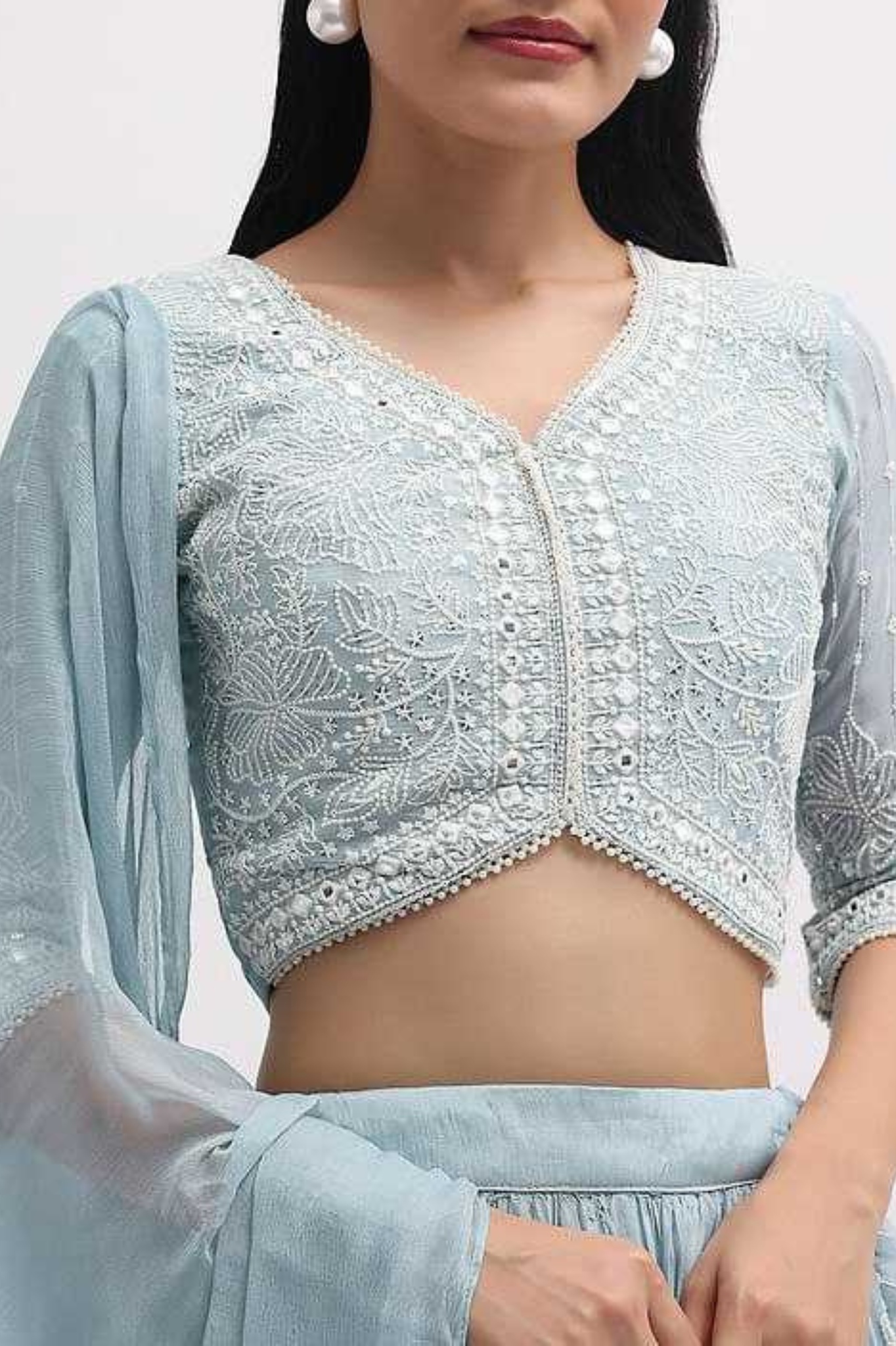 An elegant drape crafted from premium crunchy chiffon, this saree features a graceful scallop design with fine thread embroidery work, making it a timeless addition to your festive and wedding wardrobe. The satin digital print blouse complements the saree beautifully, adding a modern touch...