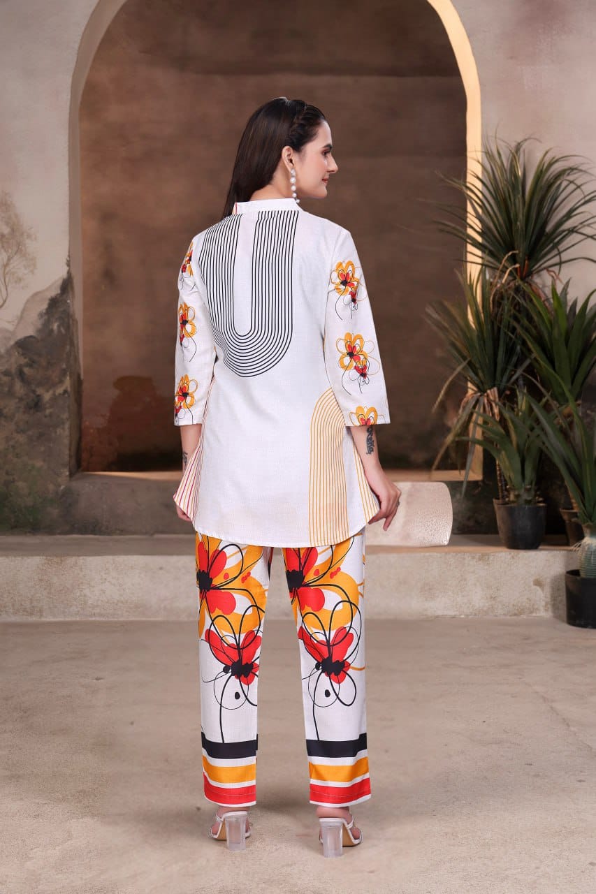 The kurti features a striking oversized floral print in fiery tones of red, orange, and yellow against a crisp white base, paired with straight-fit trousers that mirror the same vibrant design. The contrast stripes at the hemline add a trendy edge, making this co-ord set a true head-turner.