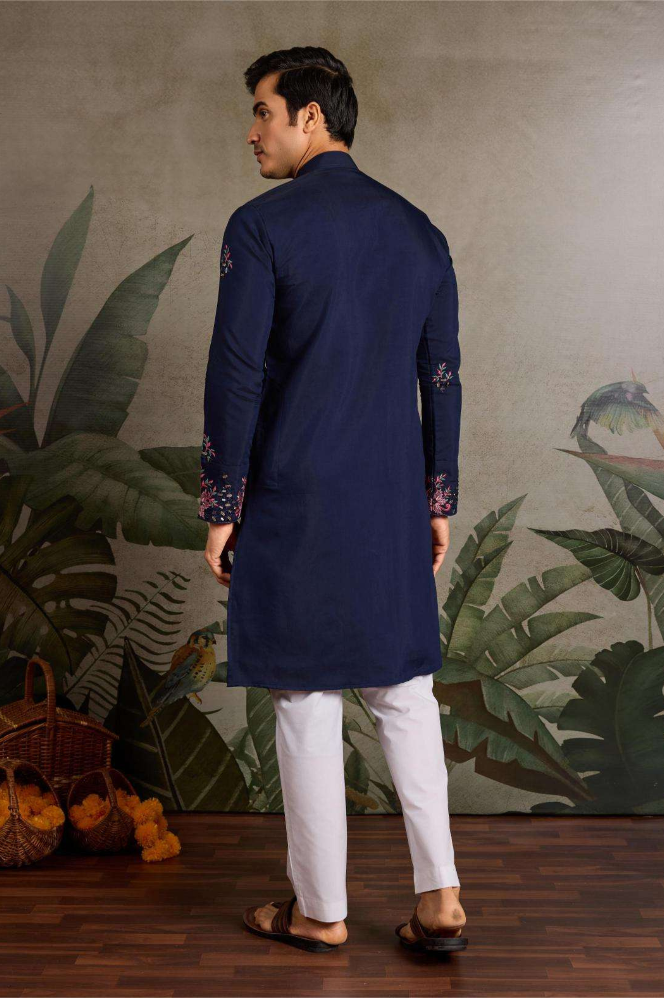 This Navy Blue Kurta Set is crafted for elegance and grandeur, featuring exquisite embroidery in floral patterns on the front side and sleeves with lace work (0.8 MTR) and detailed embroidery on the back side with sleeves (1.1 MTR). Paired with a crisp white pant, this outfit brings a perfect balance of regal style and modern sophistication.