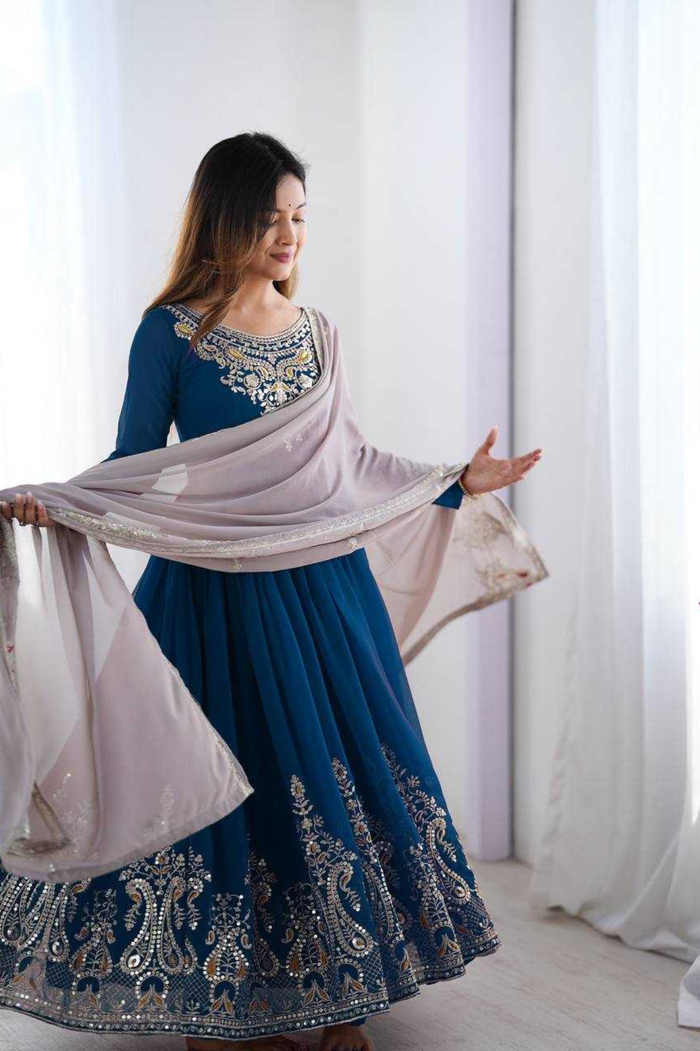 Make a regal statement with this Royal Blue Heavy Georgette Anarkali Set, beautifully designed with multi-thread embroidery and 5mm sequin work. The top comes with full sleeves, micro cotton inner, and a graceful length of 53–54 inches, fully stitched and ready to wear in sizes M (38) to XXL (44).