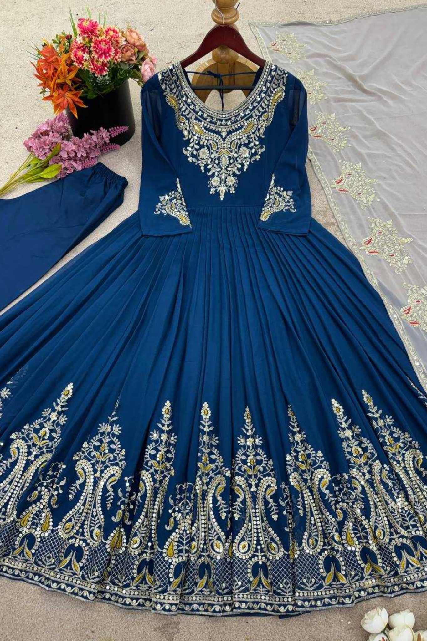Make a regal statement with this Royal Blue Heavy Georgette Anarkali Set, beautifully designed with multi-thread embroidery and 5mm sequin...