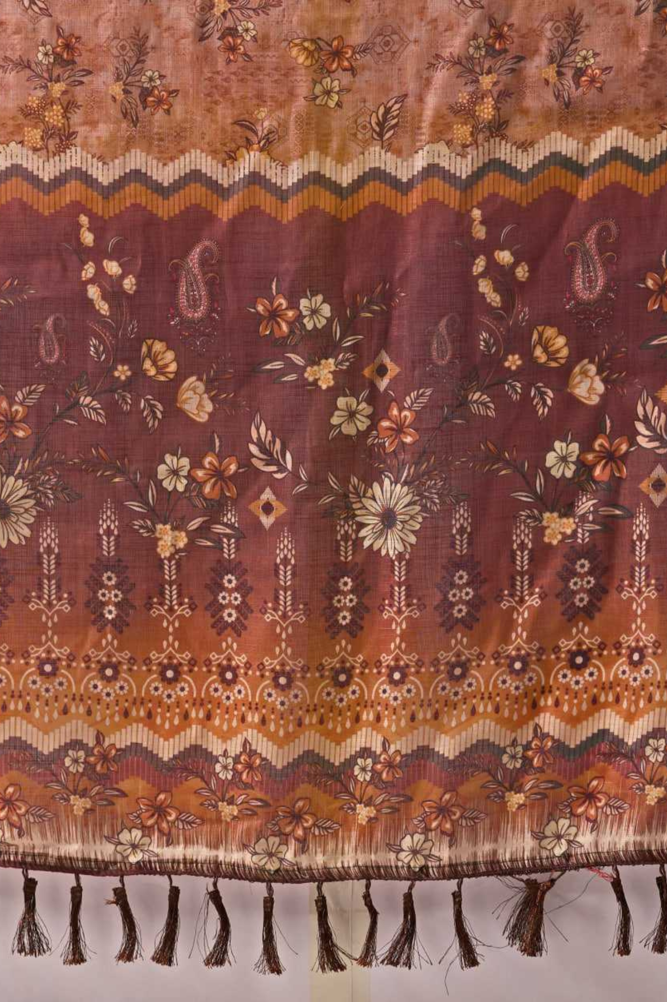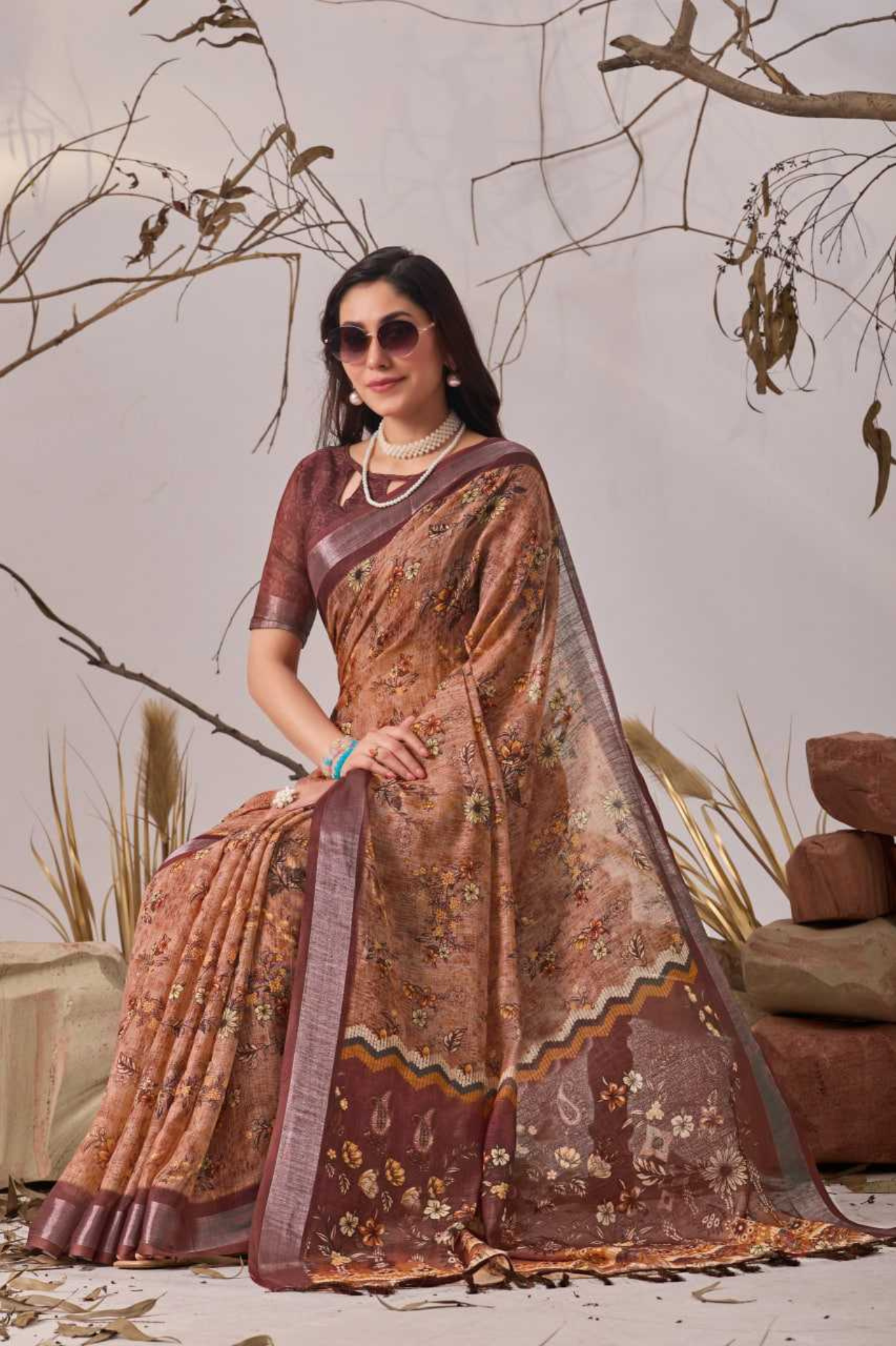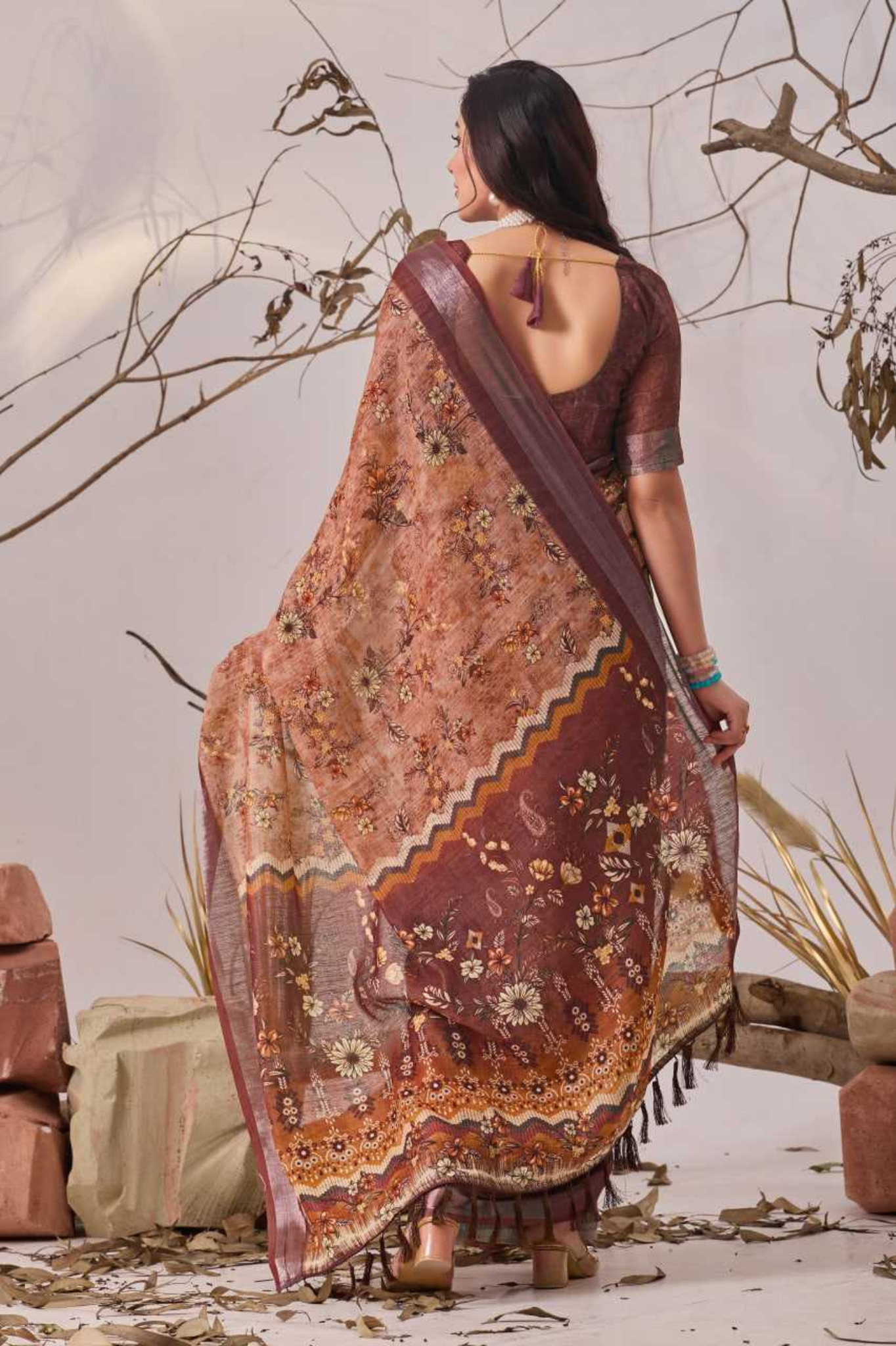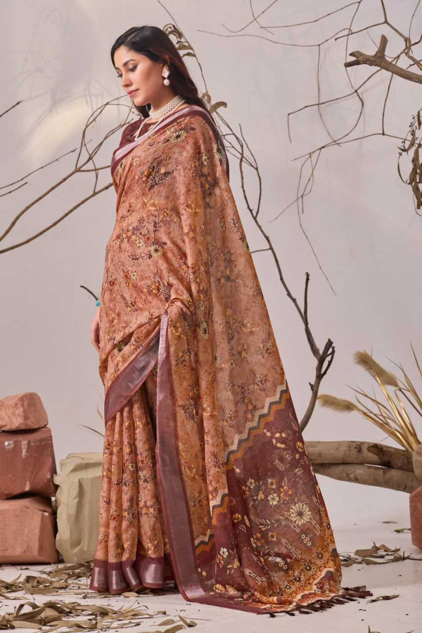 Crafted from premium Linen Cotton, this saree showcases an elegant digital floral pattern that blends traditional artistry with a modern aesthetic. The earthy brown base with detailed prints and a subtle sheen makes it versatile for casual gatherings, festive occasions, and day events. Finished with a refined border and tassels, it exudes understated grace.