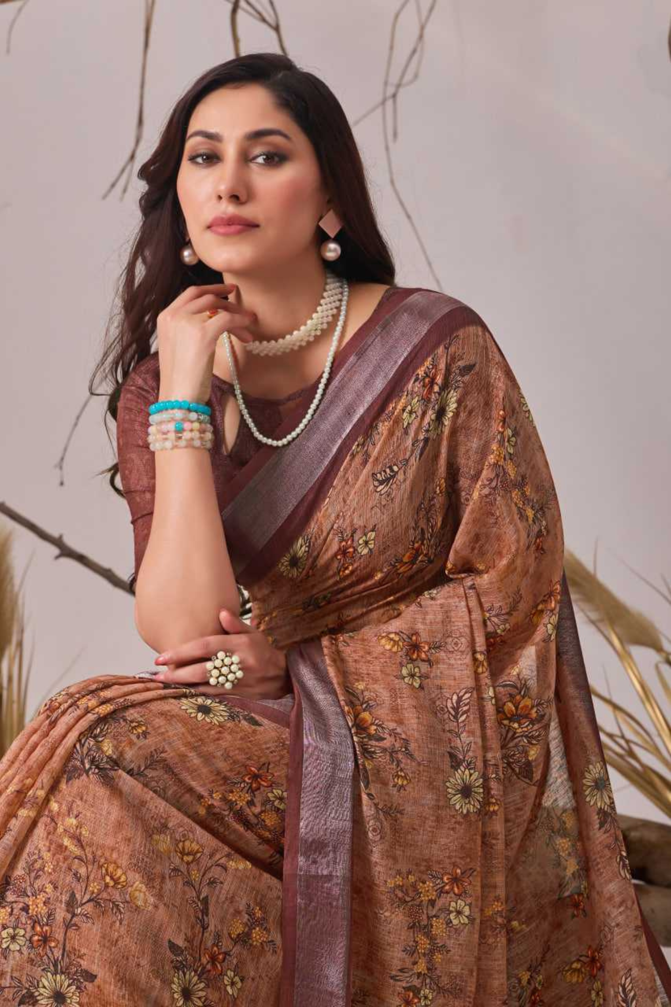 Brown Linen Cotton Saree with Digital Floral Prints