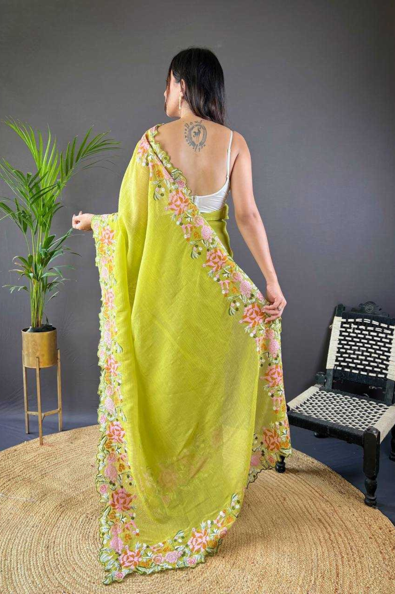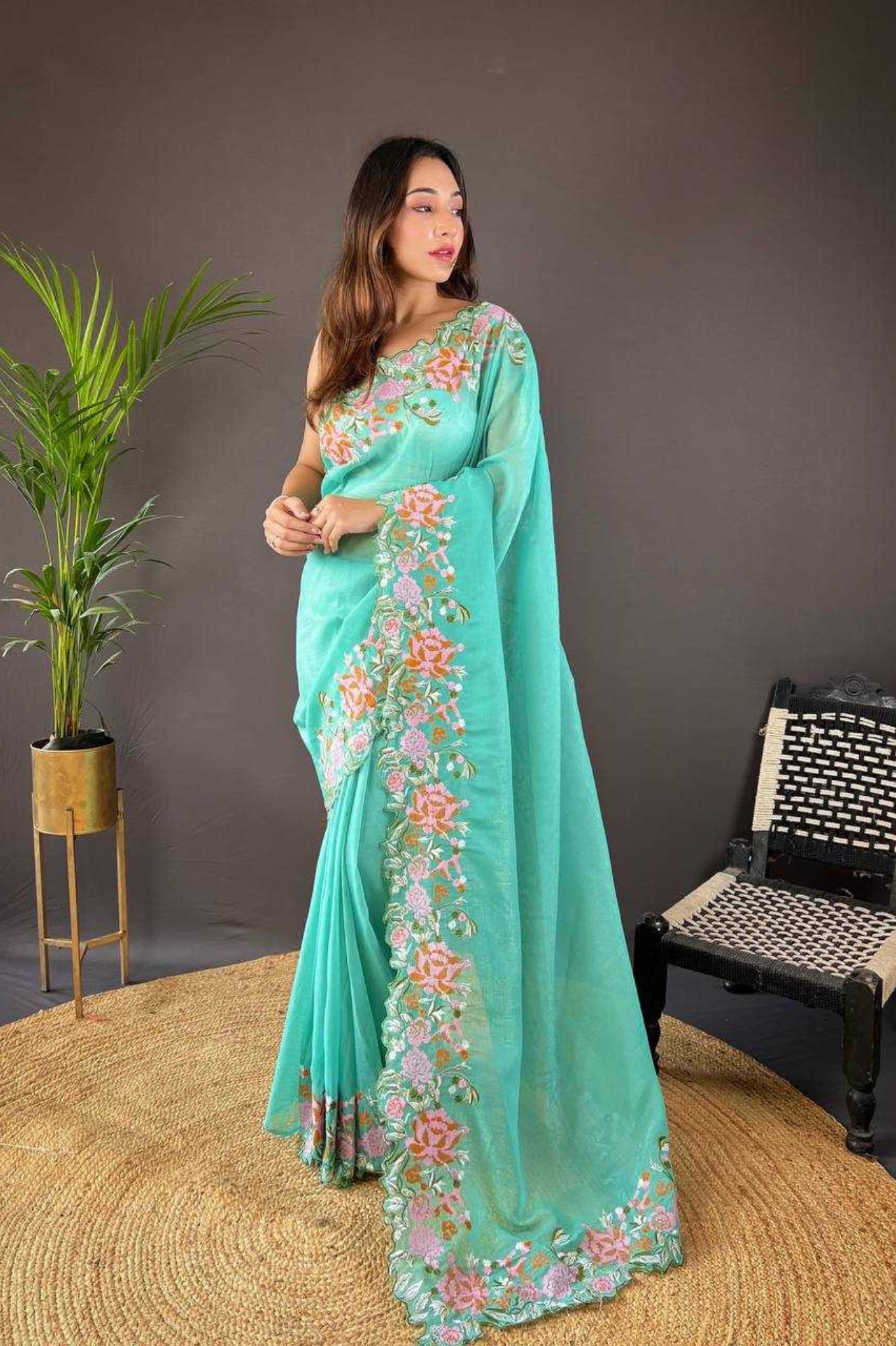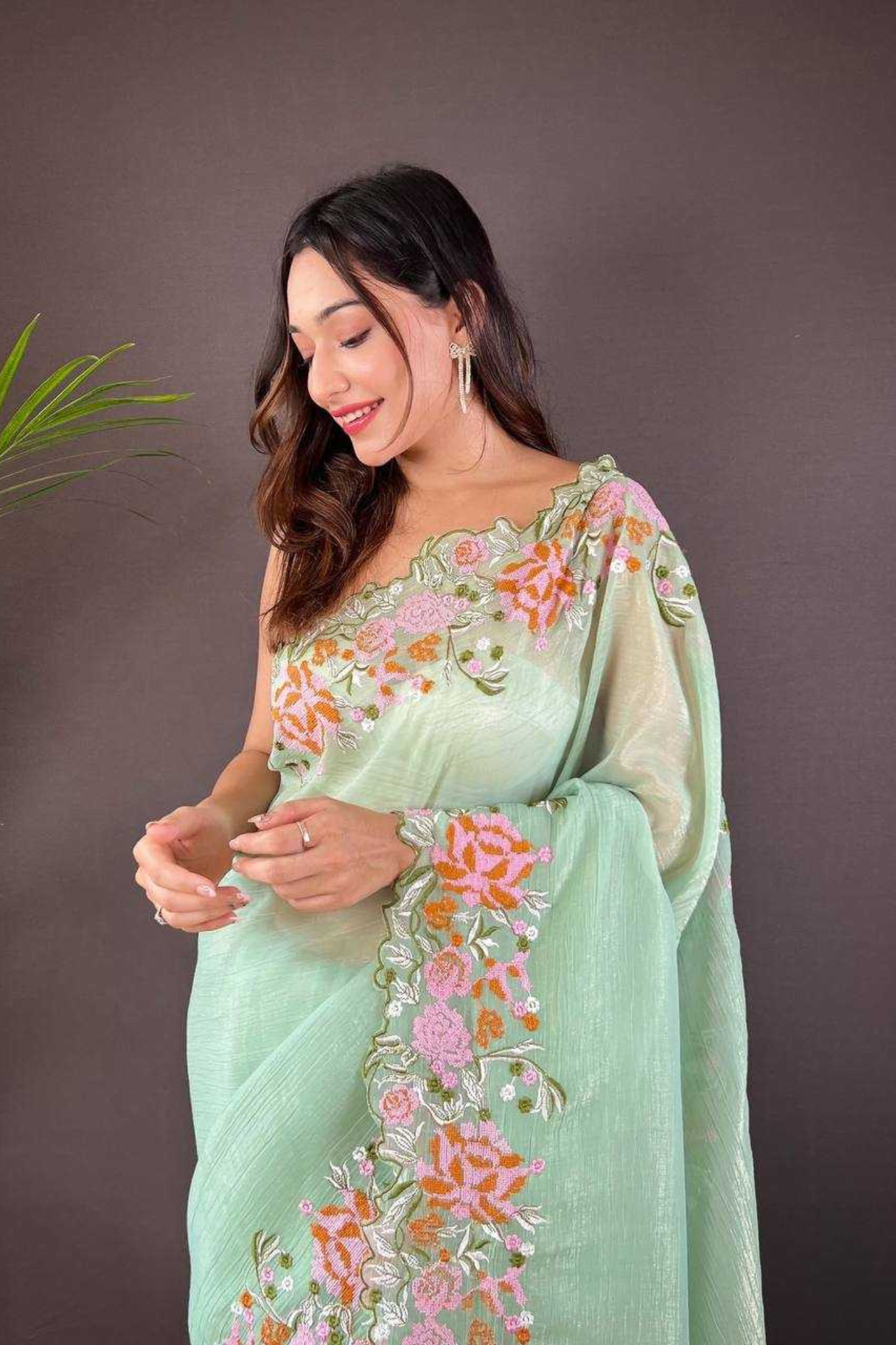Experience timeless elegance with this Soft Glossy Silk Saree, beautifully detailed with designer cross-stitch floral embroidery along the border. The delicate cutwork lace edging adds a refined touch, making it a perfect pick for festive occasions, parties, and celebrations. The glossy silk fabric gives a luxurious drape and soft sheen that enhances its sophisticated charm.