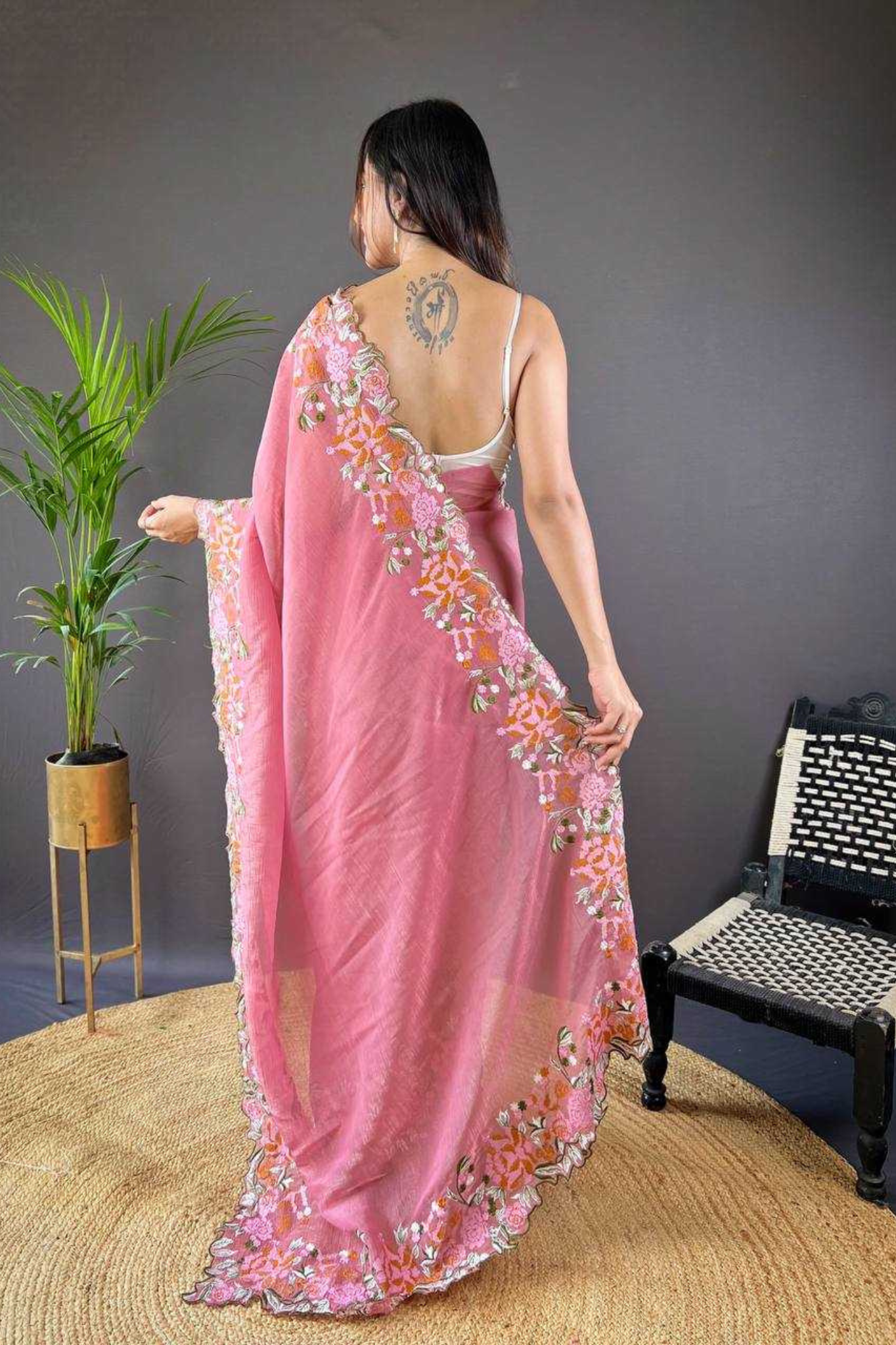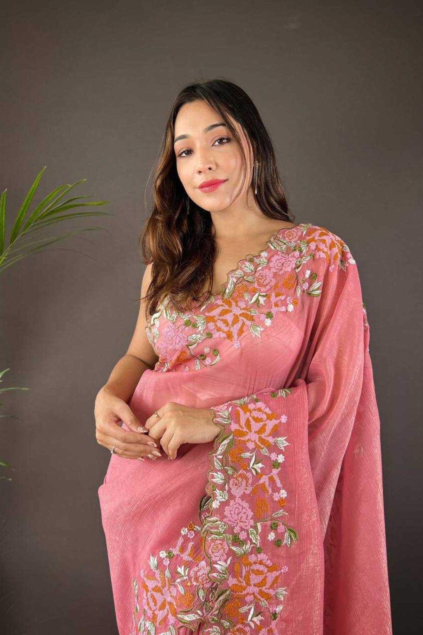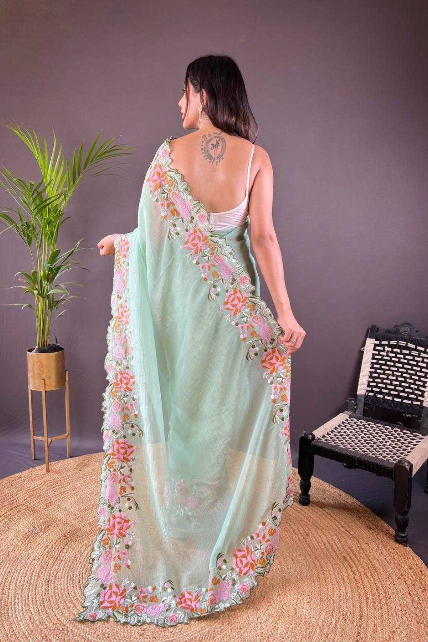 Experience timeless elegance with this Soft Glossy Silk Saree, beautifully detailed with designer cross-stitch floral embroidery along the border. The delicate cutwork lace edging adds a refined touch, making it a perfect pick for festive occasions, parties, and celebrations. The glossy silk fabric gives a luxurious drape and soft sheen that enhances its sophisticated charm.