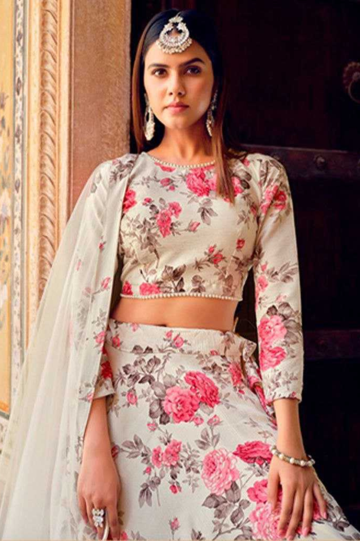 Grace meets charm in this floral printed white lehenga, designed with a full flair silhouette and an adjustable waist tied...