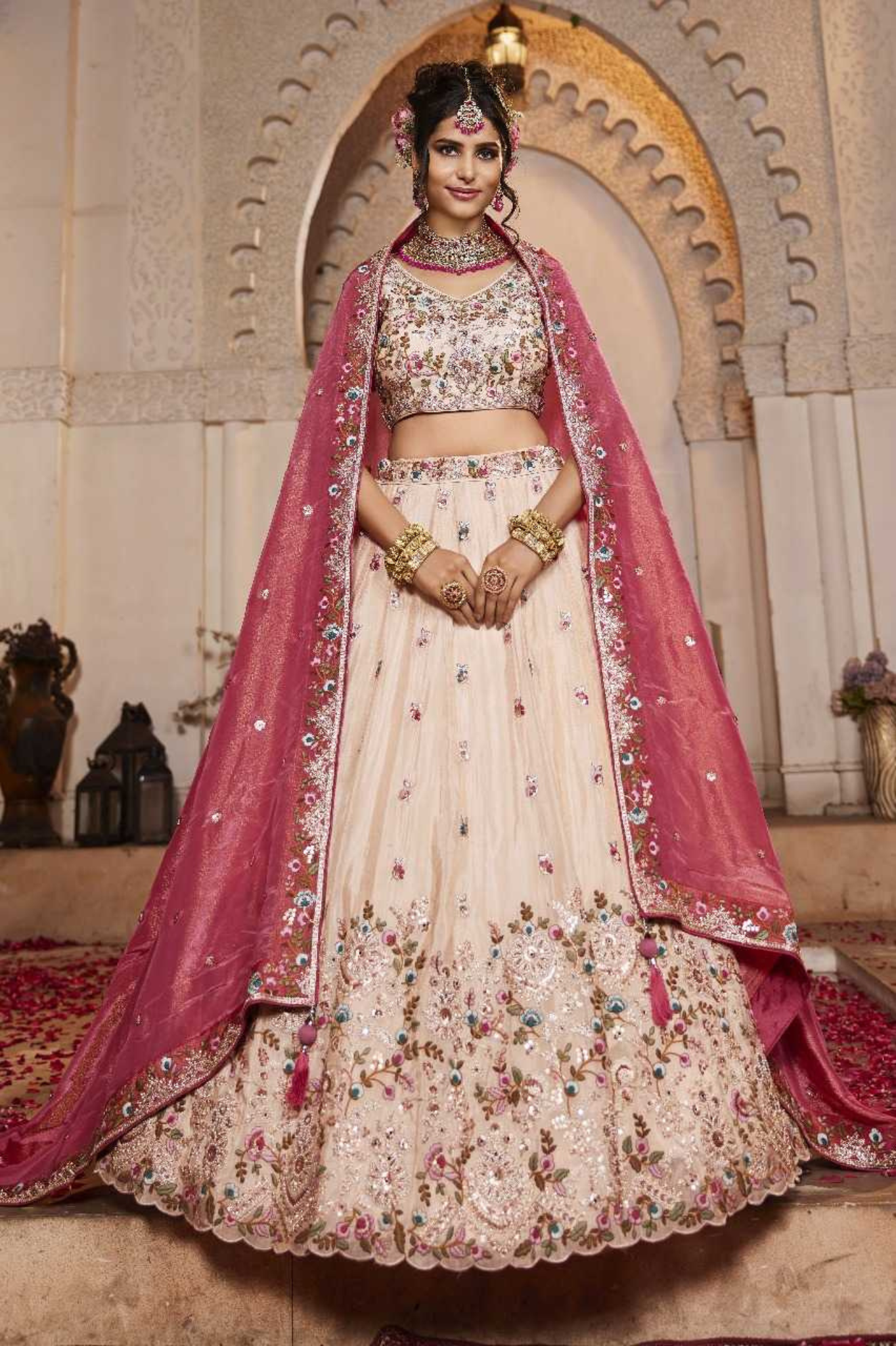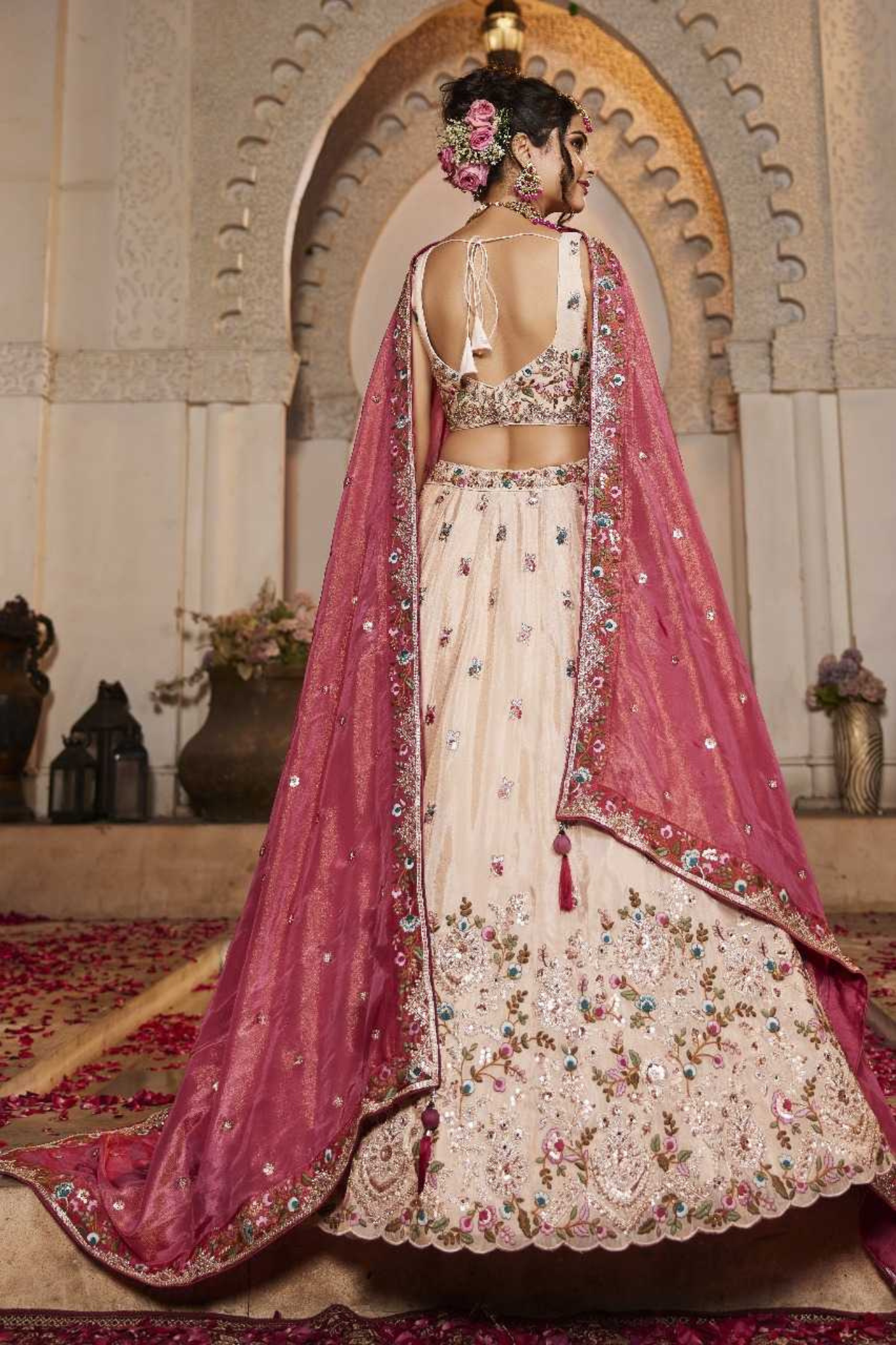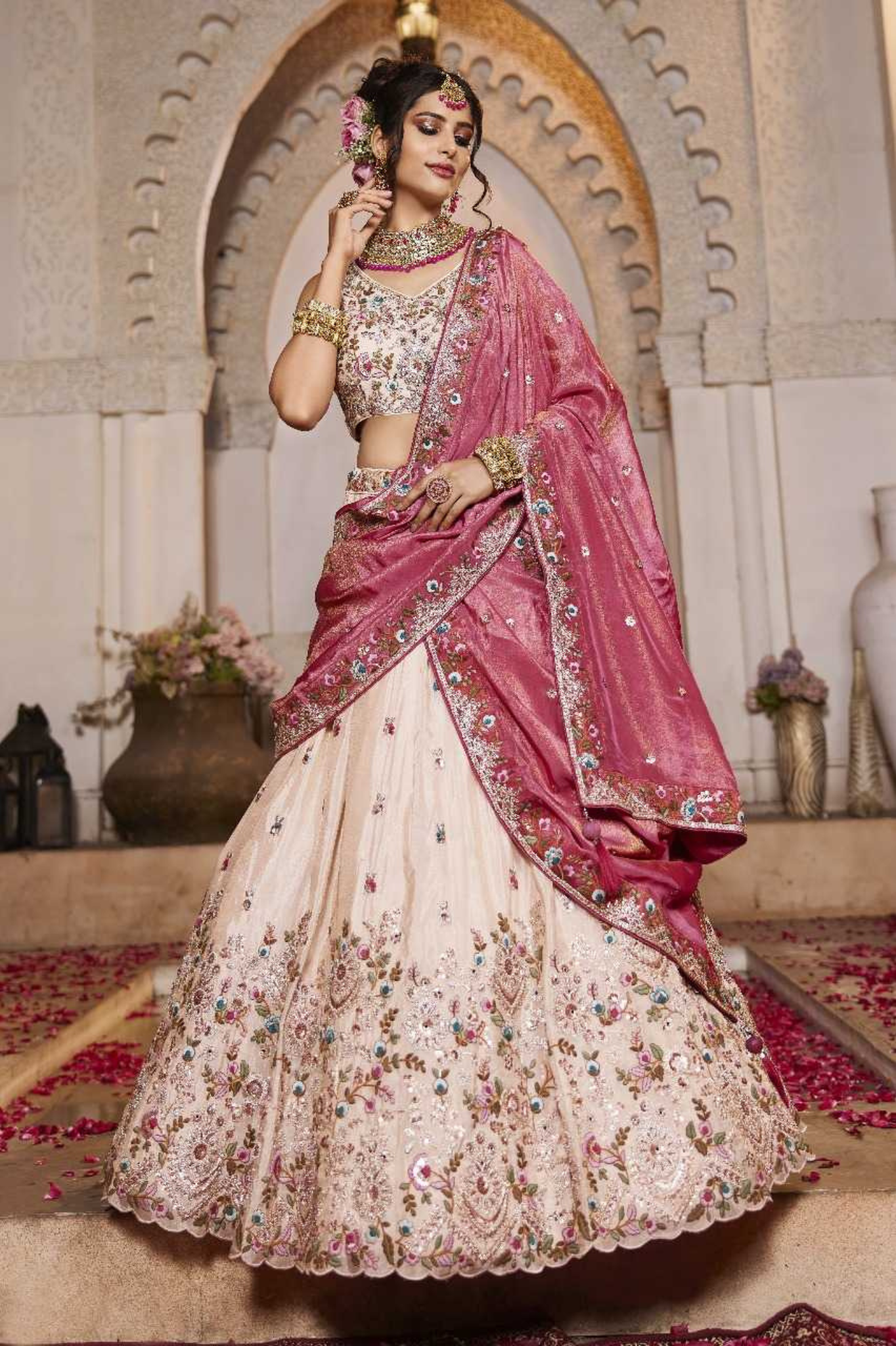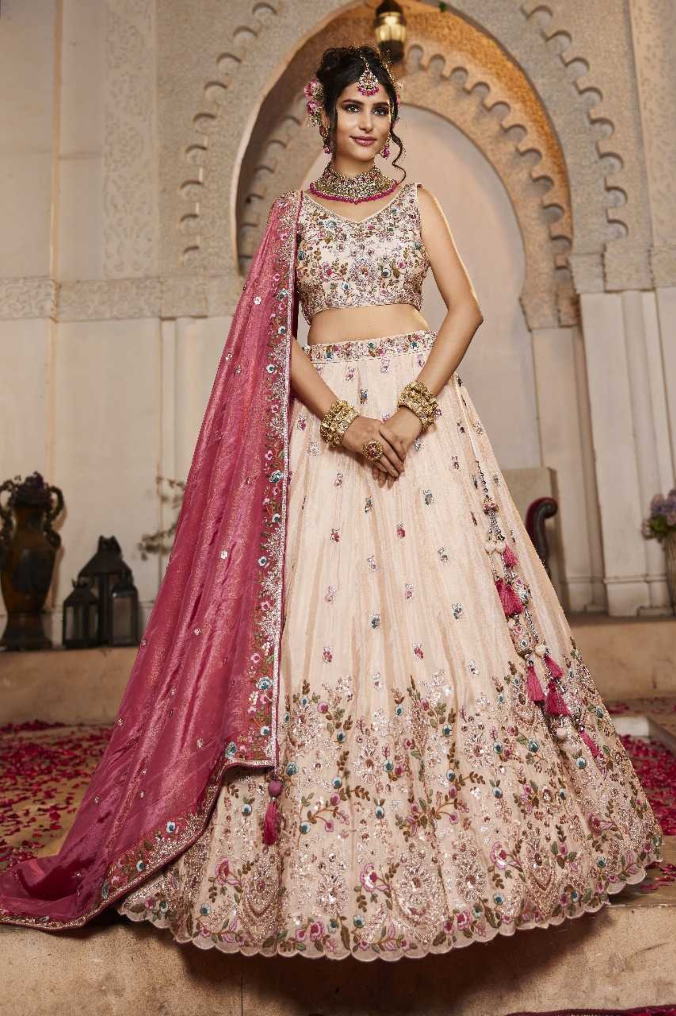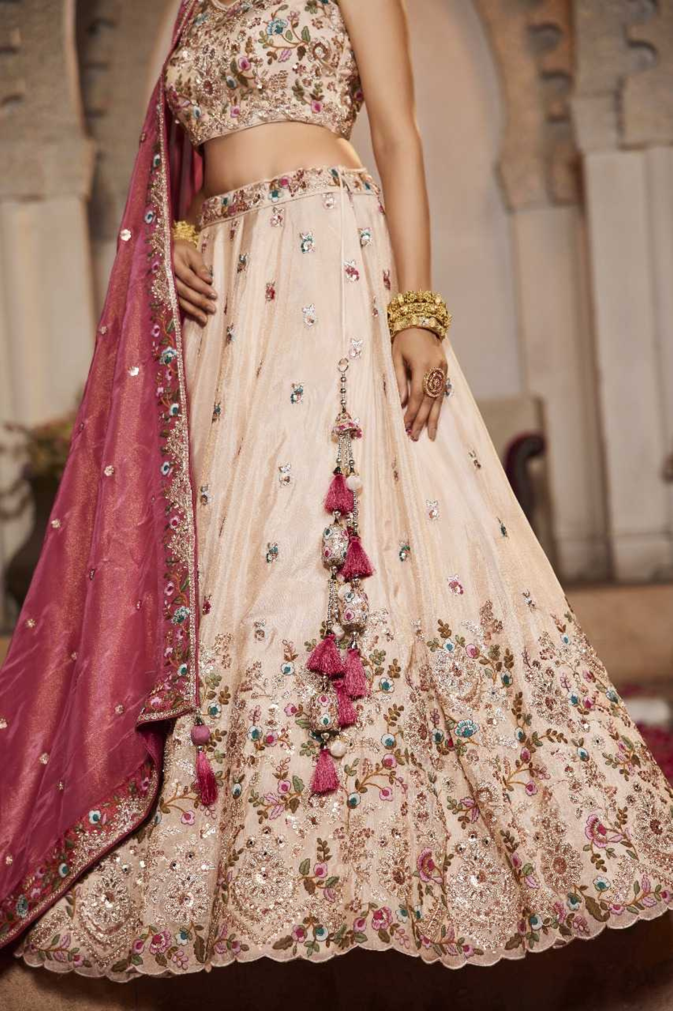 Step into elegance with this cream tissue lehenga, adorned with intricate embroidery and sequin highlights that radiate festive charm. Paired...