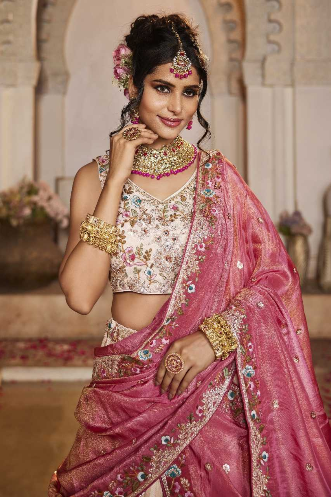 Designer Tissue Embroidered Lehenga Choli with Matching Dupatta – Cream & Red