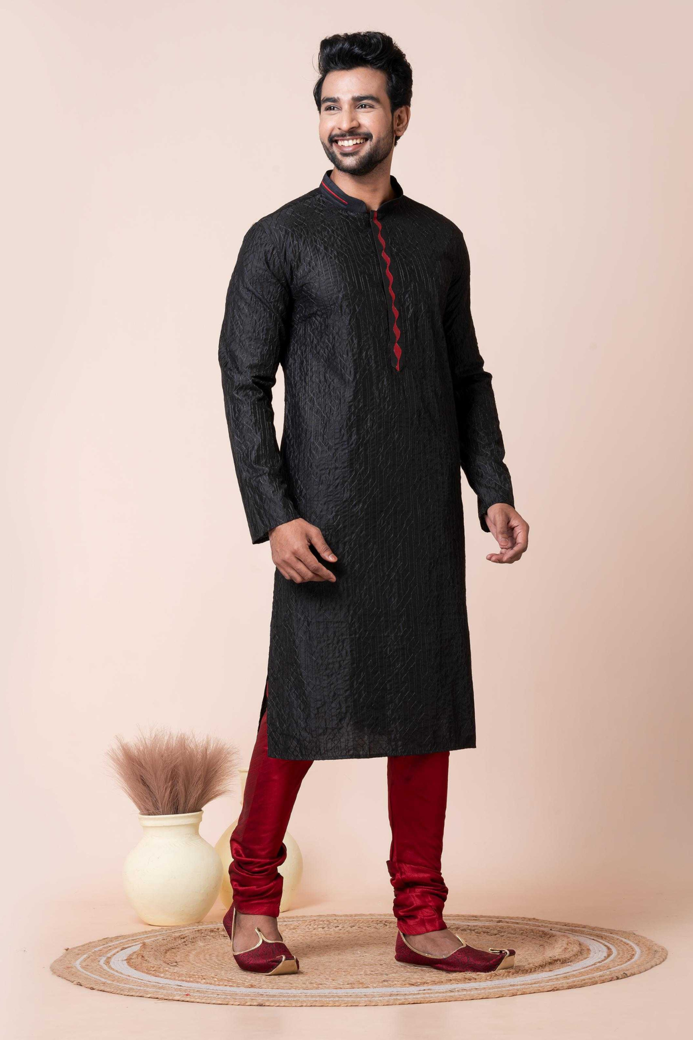 Step into timeless style with this men’s kurta made from soft and durable mix cotton fabric. Designed in classic black with subtle textured detailing and a striking red placket accent, this kurta is paired with a deep red pajama for a bold yet refined ethnic look. Perfect for festive occasions, cultural events, or family gatherings, this outfit balances tradition with modern sophistication.