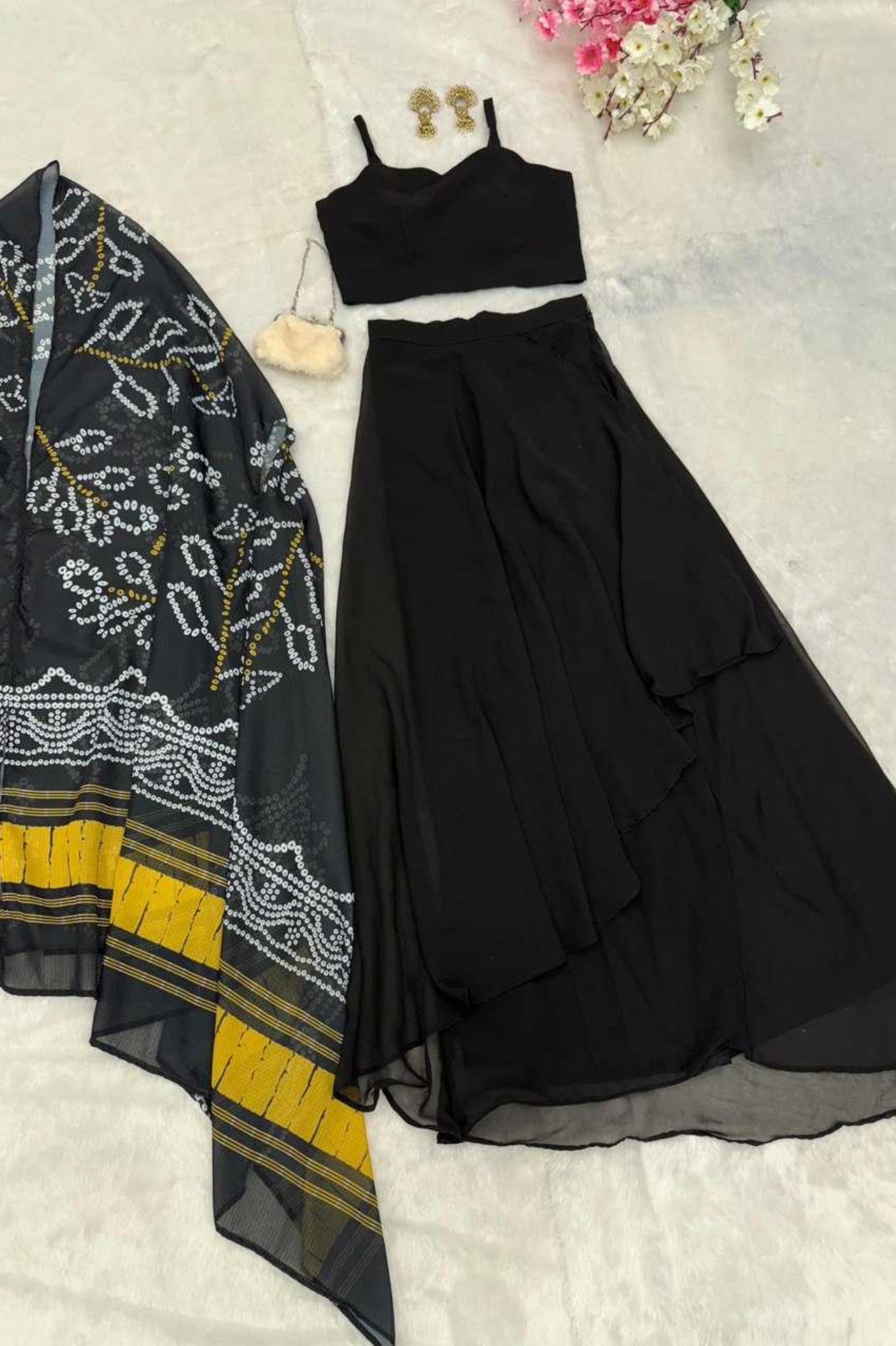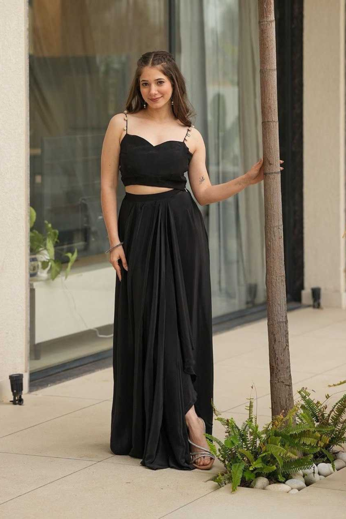 Make a bold style statement with this three-piece black Indo-Western set featuring a chic georgette blouse, trendy drape skirt, and...