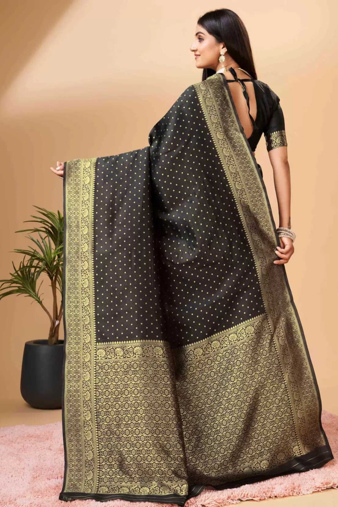 Make a bold and graceful statement with this elegant black Banarasi art silk saree, finely adorned with delicate golden zari...