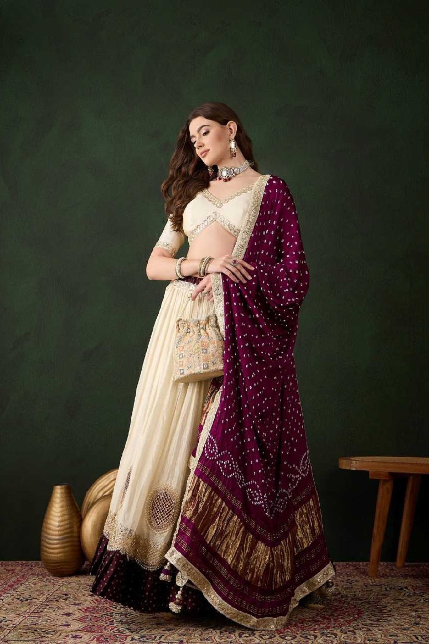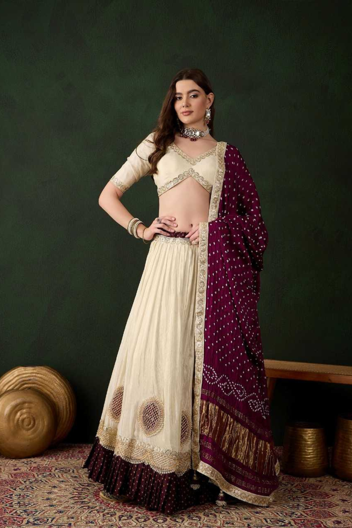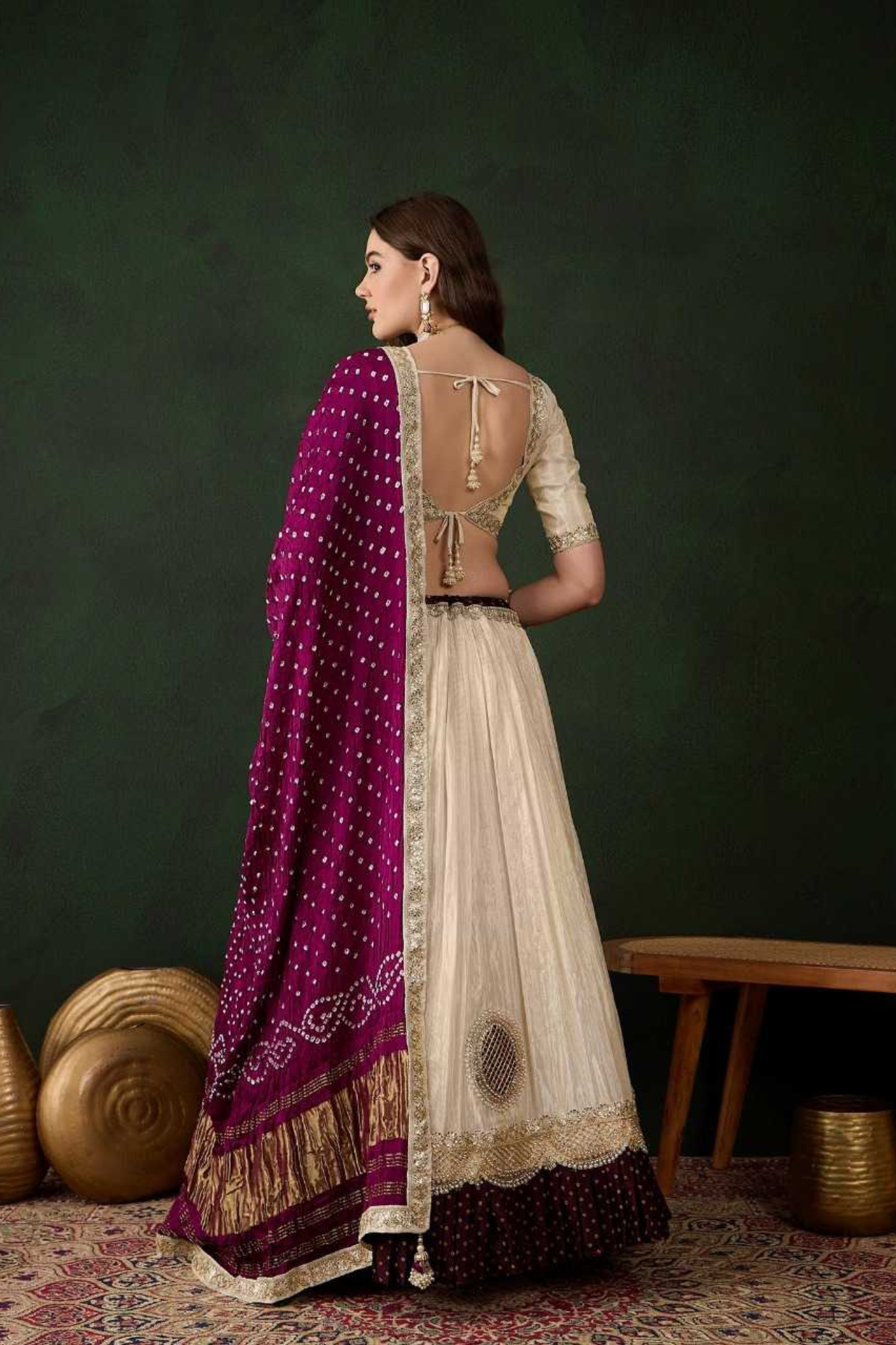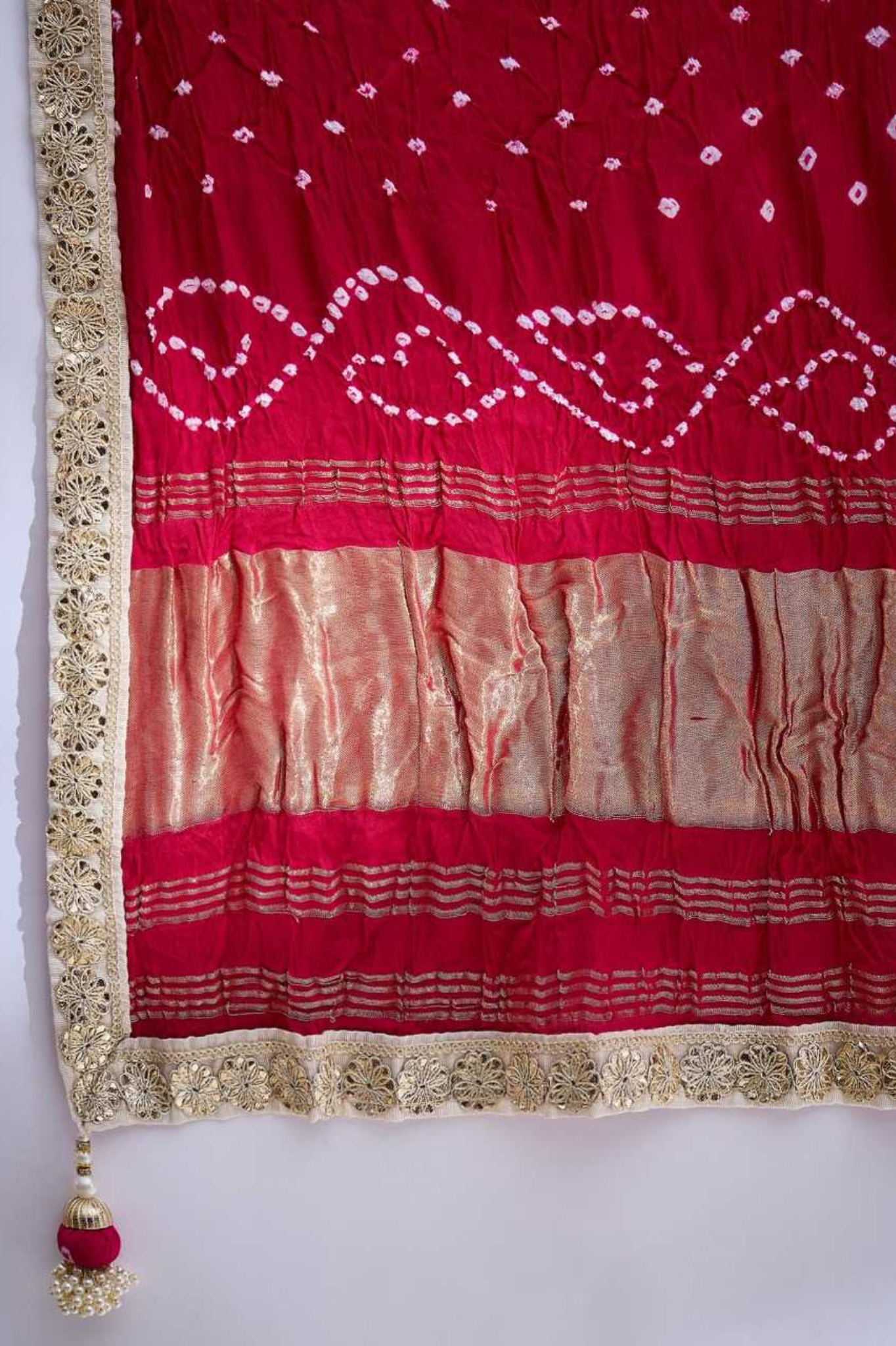 Exude regal elegance with this Ivory & Red Pure Viscose Tissue lehenga set, a masterpiece designed for weddings and grand festivities. The lehenga is crafted in Pure Viscose Tissue, featuring a lustrous ivory base enhanced with delicate golden embroidery and striking red pleated borders. The matching Pure Viscose Tissue blouse comes with intricate detailing and a unique cut design, adding a modern twist to traditional attire. Paired with a rich red dupatta featuring golden embroidery and border, this ensemble is the perfect blend of heritage charm and contemporary glam.
