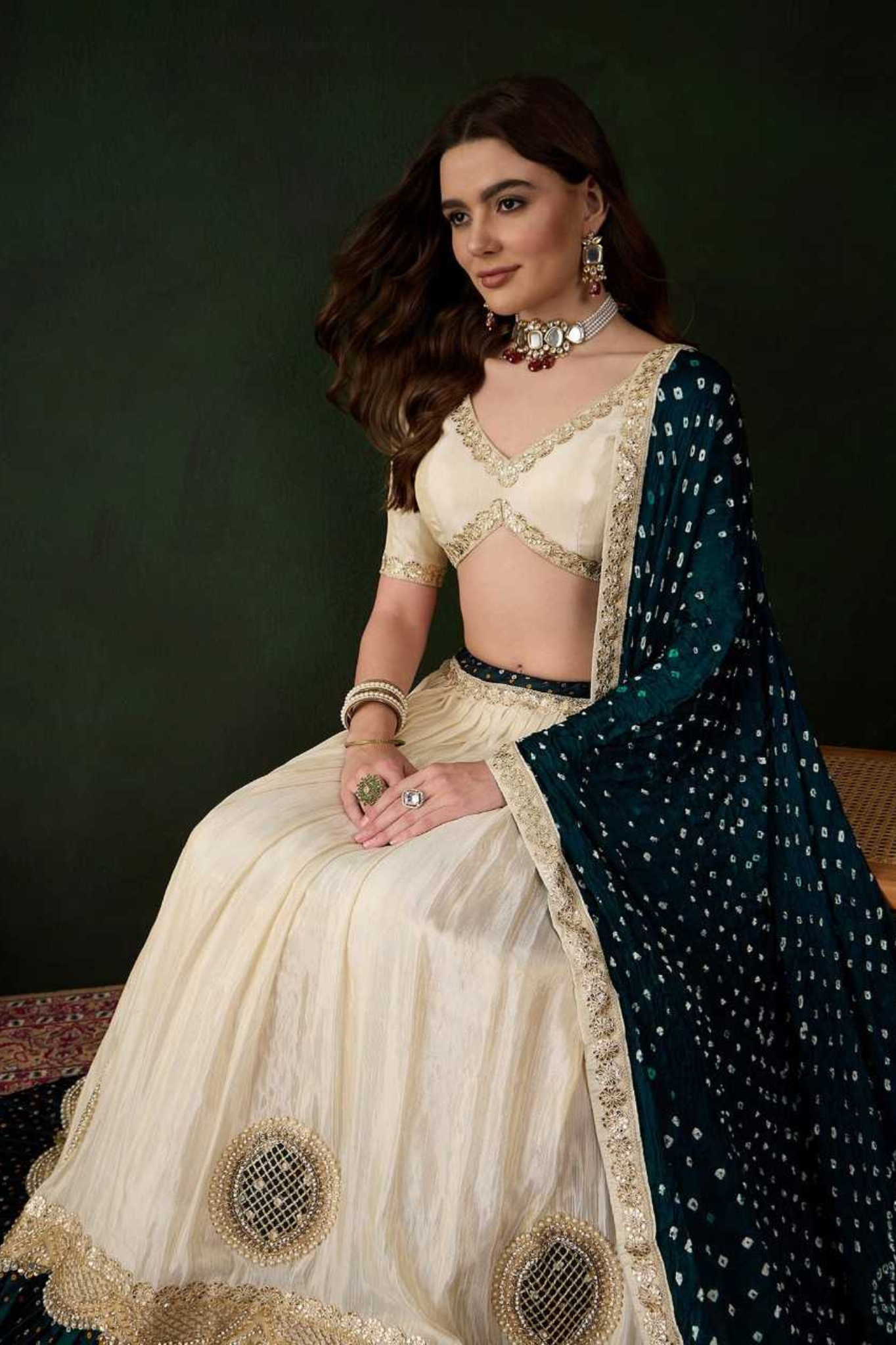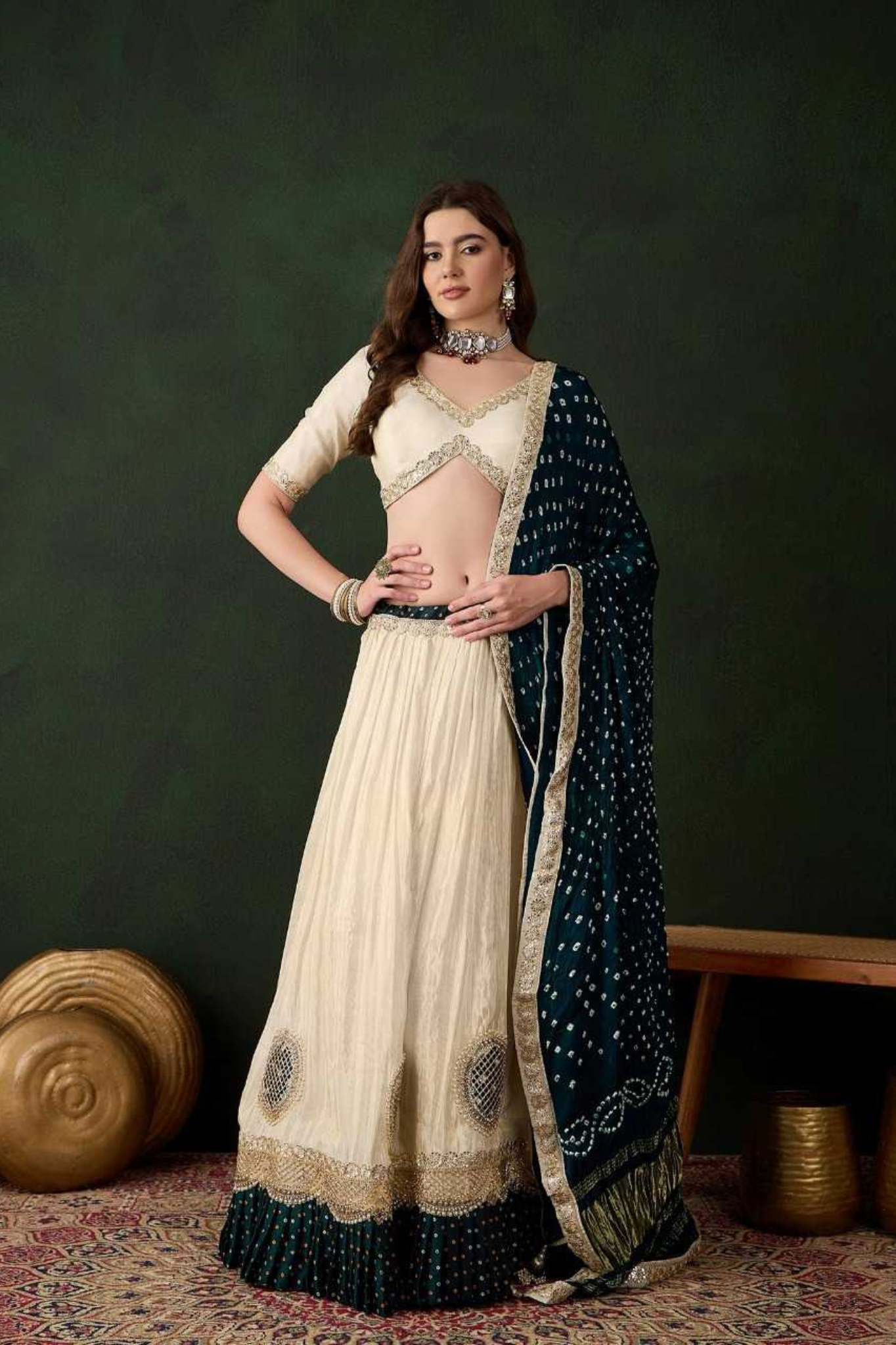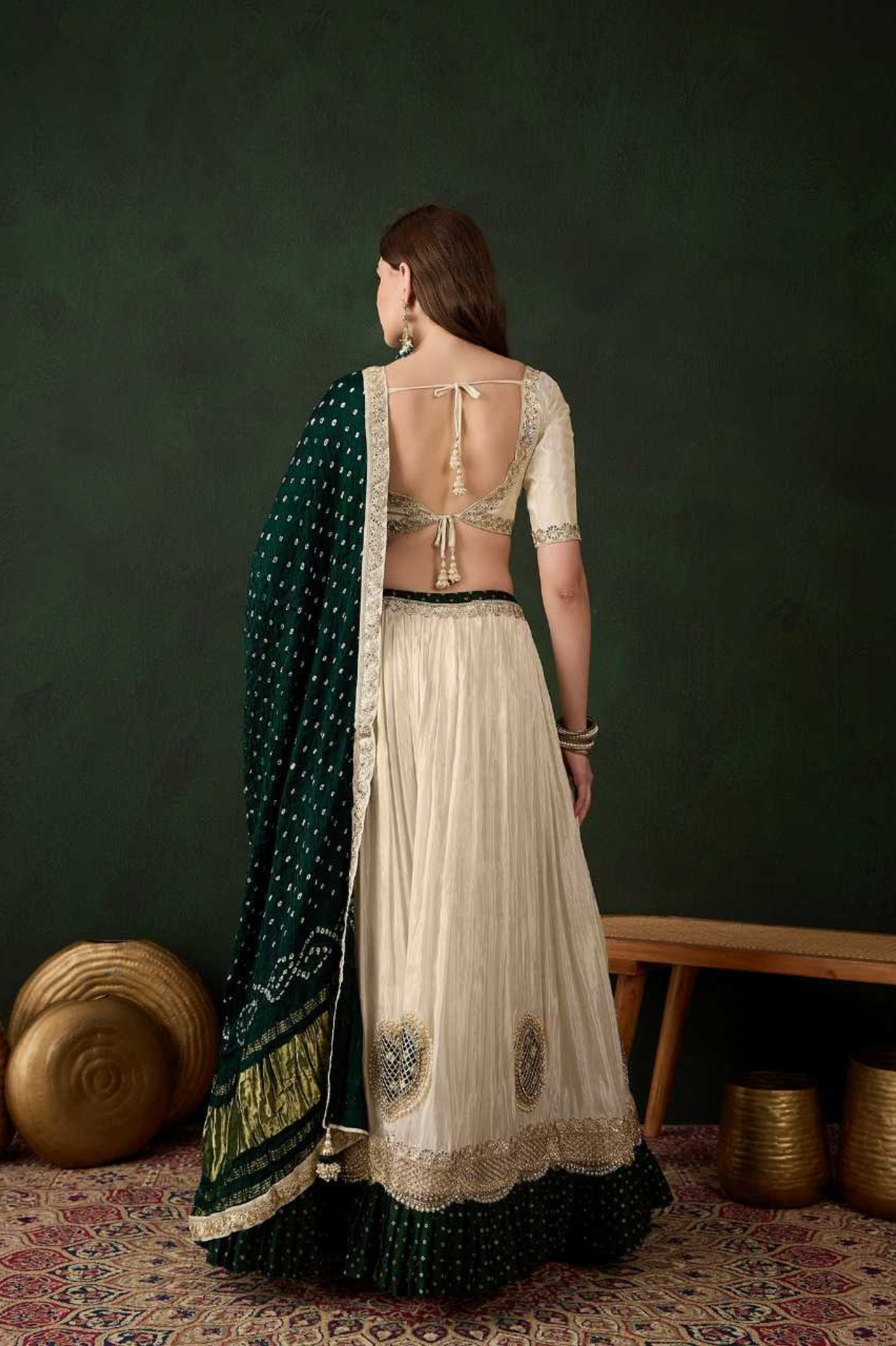 Exude regal elegance with this Ivory & Red Pure Viscose Tissue lehenga set, a masterpiece designed for weddings and grand festivities. The lehenga is crafted in Pure Viscose Tissue, featuring a lustrous ivory base enhanced with delicate golden embroidery and striking red pleated borders. The matching Pure Viscose Tissue blouse comes with intricate detailing and a unique cut design, adding a modern twist to traditional attire. Paired with a rich red dupatta featuring golden embroidery and border, this ensemble is the perfect blend of heritage charm and contemporary glam.