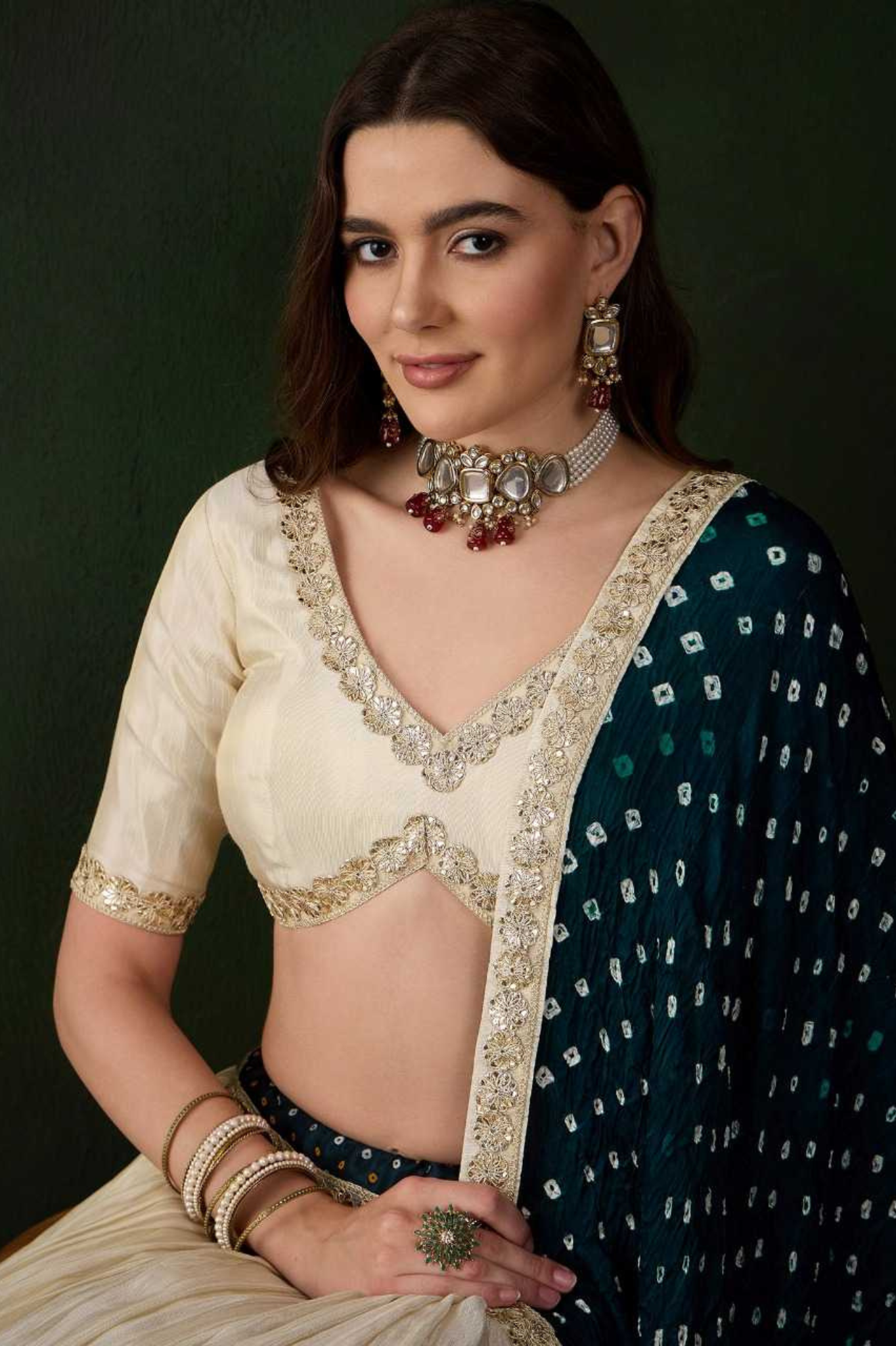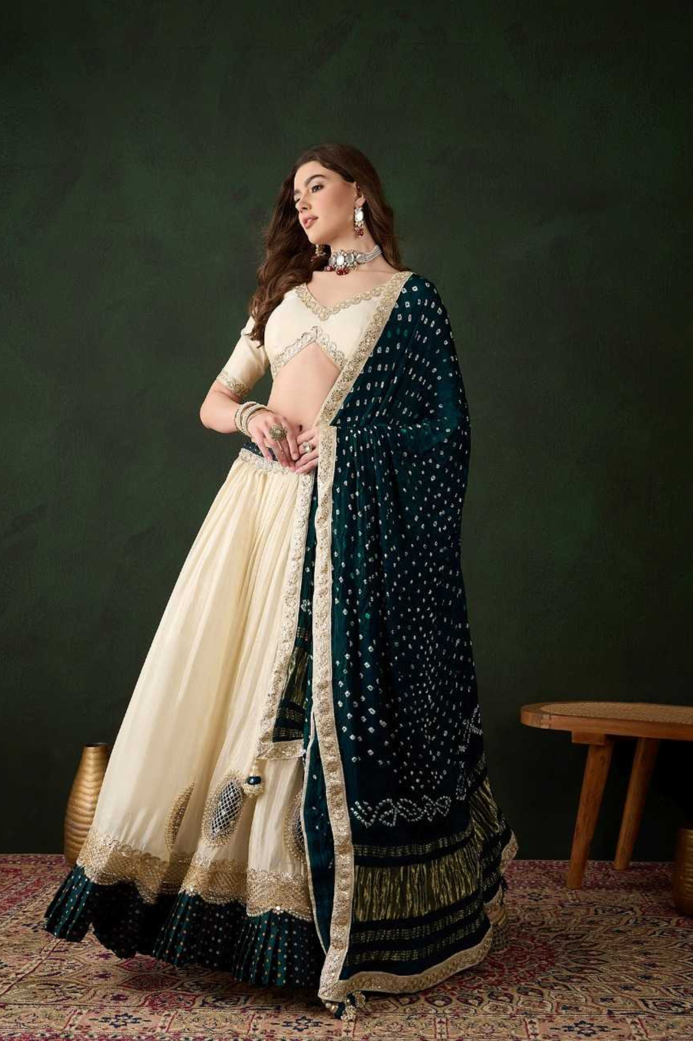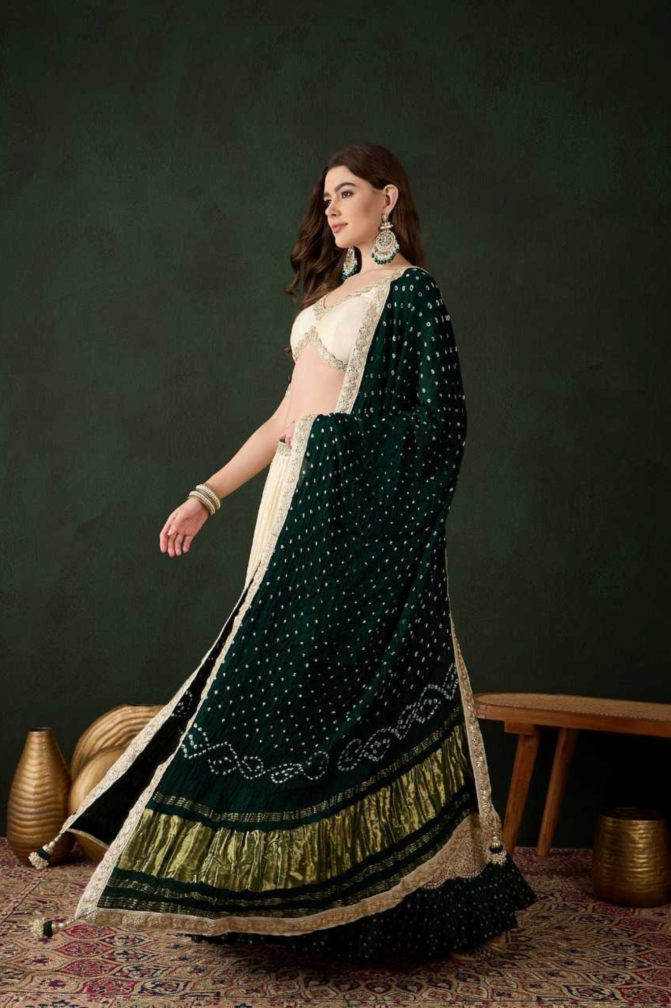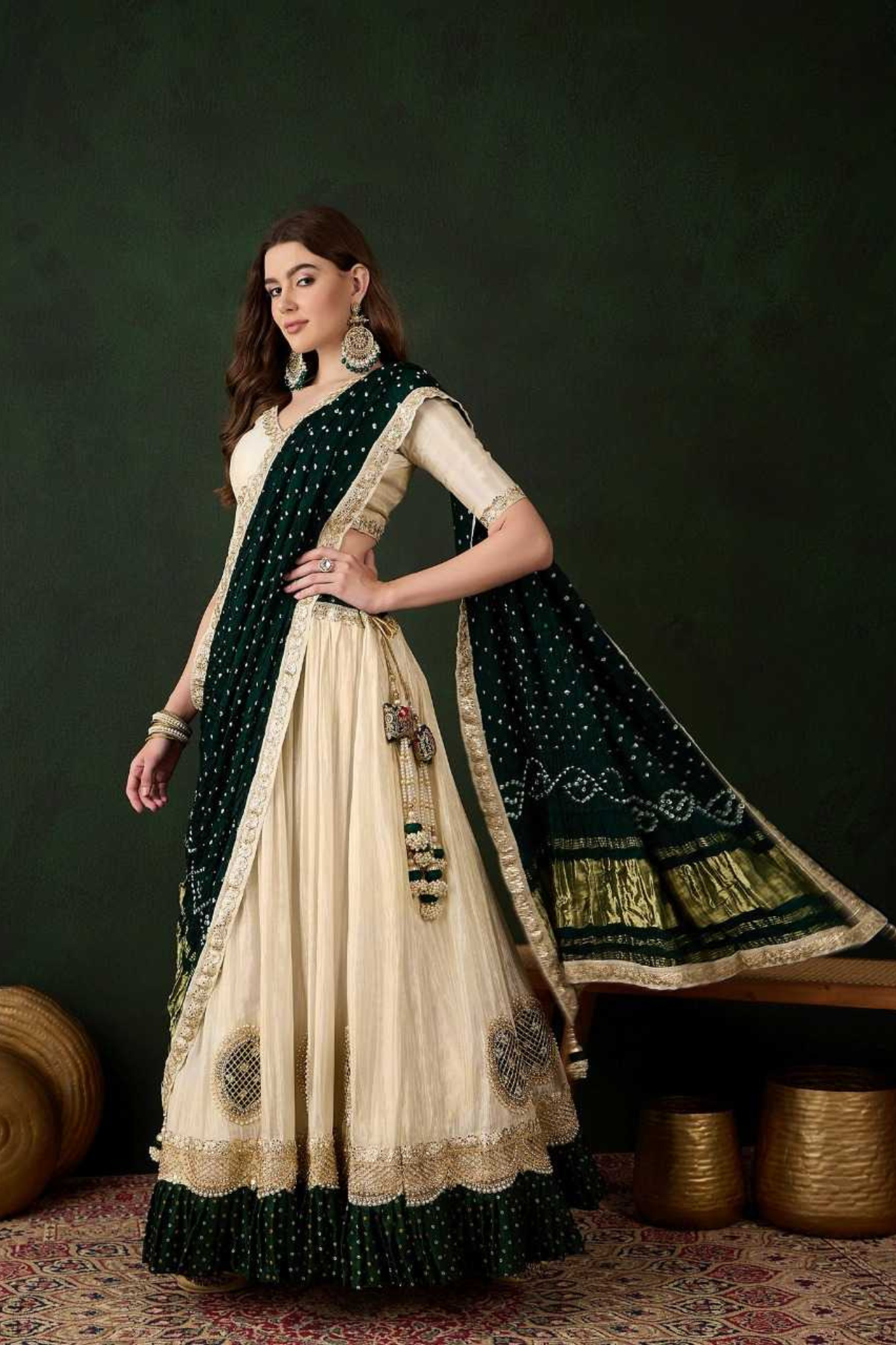 Exude regal elegance with this Ivory & Red Pure Viscose Tissue lehenga set, a masterpiece designed for weddings and grand festivities. The lehenga is crafted in Pure Viscose Tissue, featuring a lustrous ivory base enhanced with delicate golden embroidery and striking red pleated borders. The matching Pure Viscose Tissue blouse comes with intricate detailing and a unique cut design, adding a modern twist to traditional attire. Paired with a rich red dupatta featuring golden embroidery and border, this ensemble is the perfect blend of heritage charm and contemporary glam.