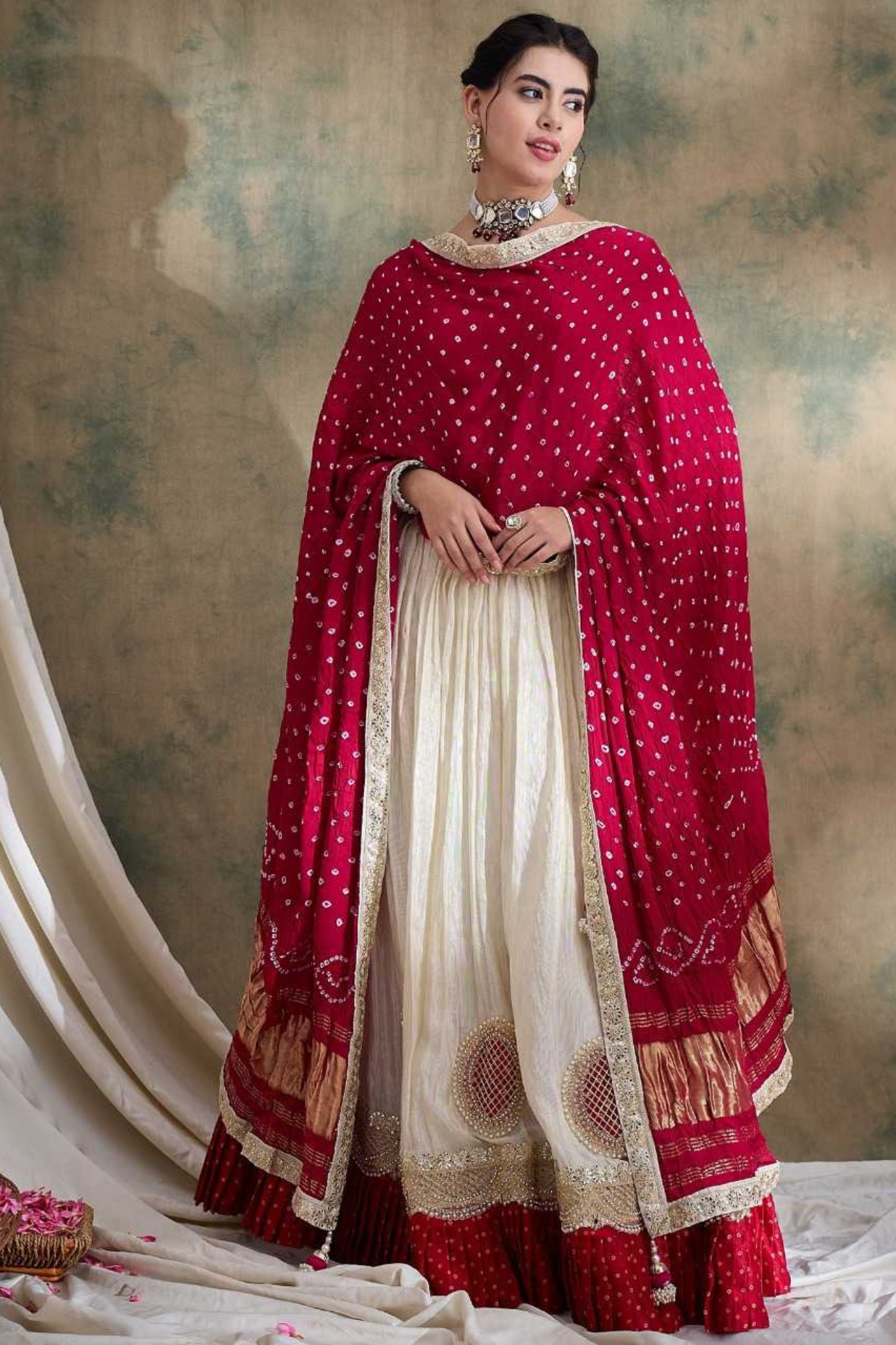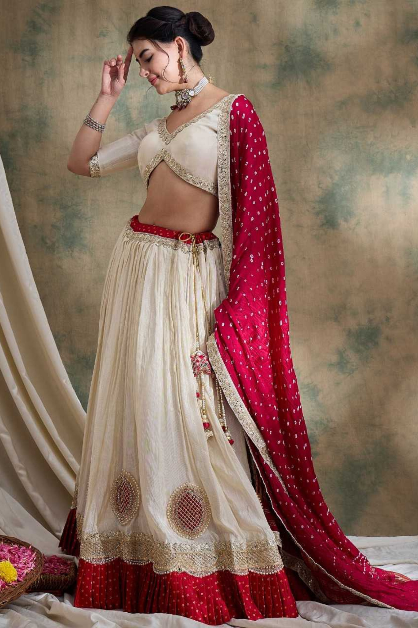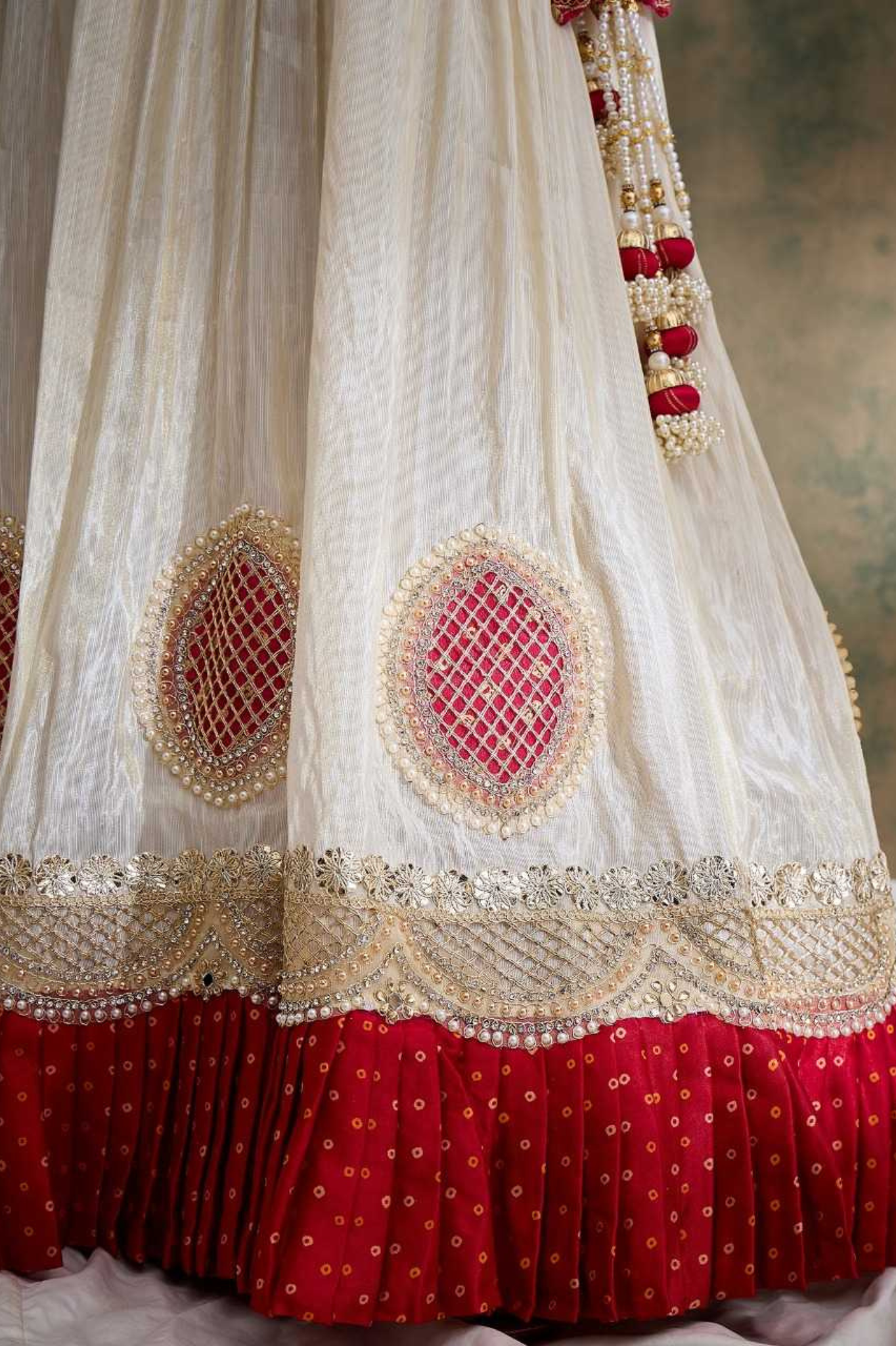 Ivory & Red Pure Viscose Tissue Bridal Lehenga Set