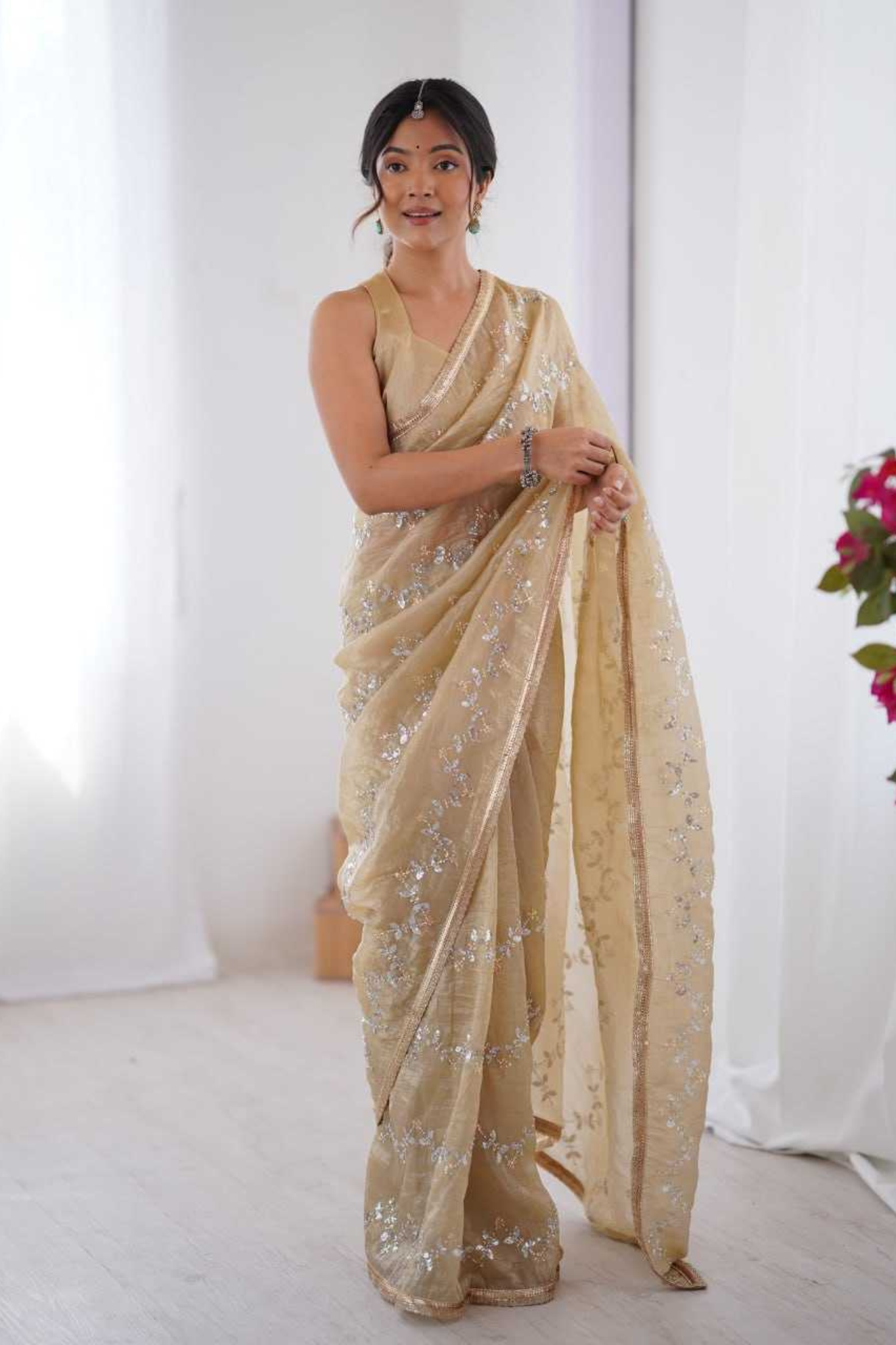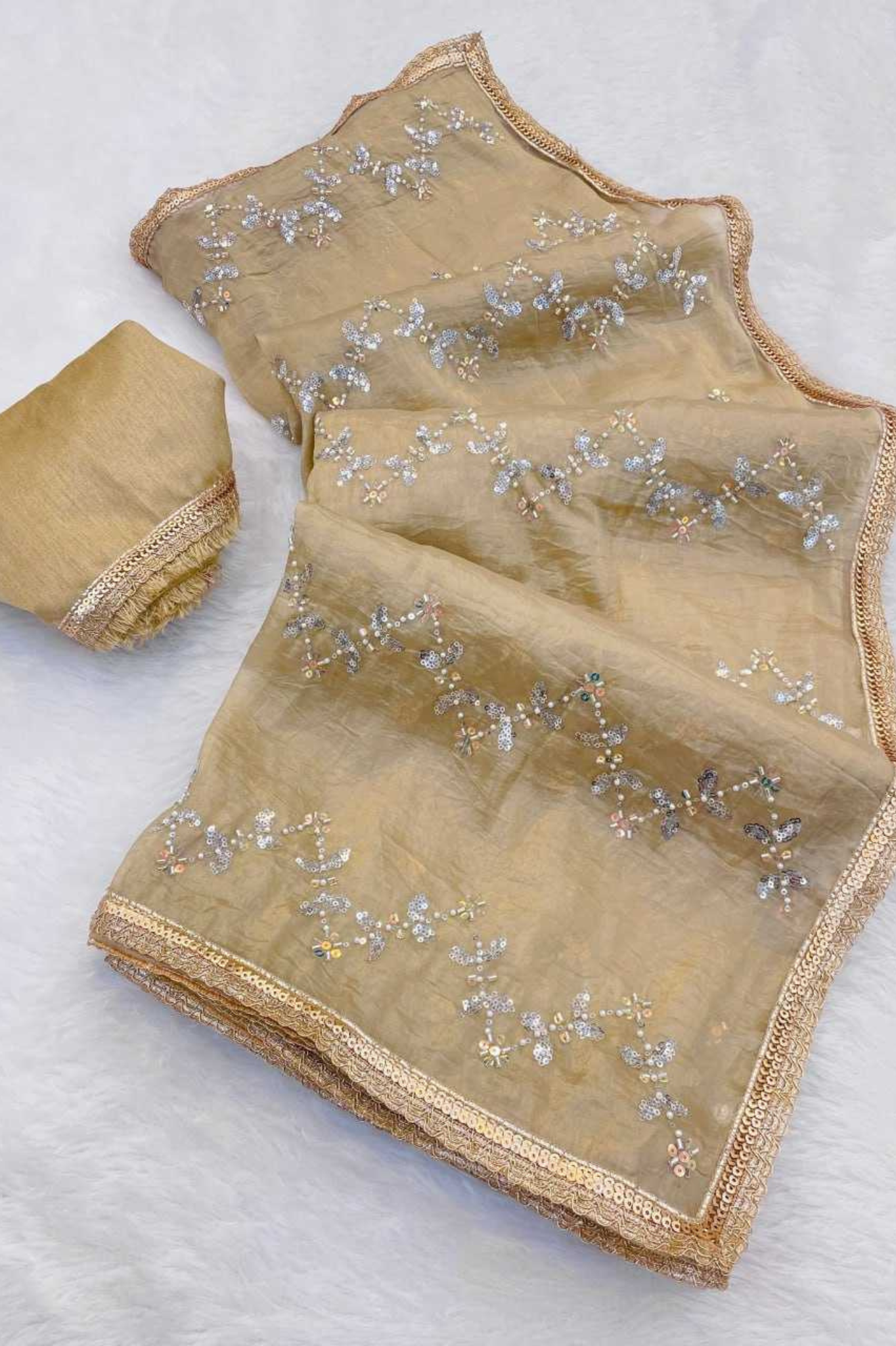 Golden Glam Crush Saree with Moti & ZigZag Sequin Embroidery