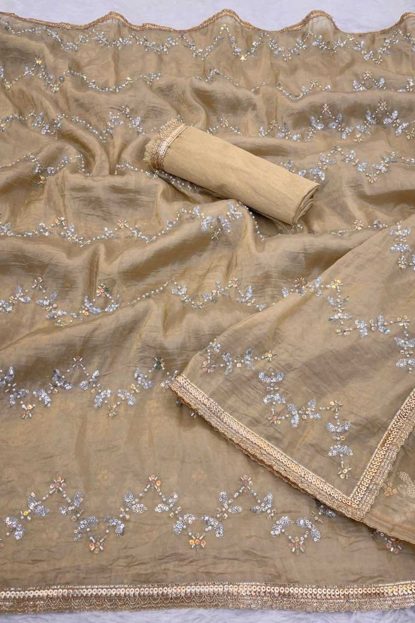 Shine with elegance in this golden saree crafted from heavy smooth gold crush fabric. The drape is beautifully adorned with designer moti and zigzag striped sequin embroidery work all over, giving it a rich and festive appeal. Paired with a heavy mono Banglori plain blouse featuring a lace border, this saree is a timeless choice for weddings, parties, and special celebrations.