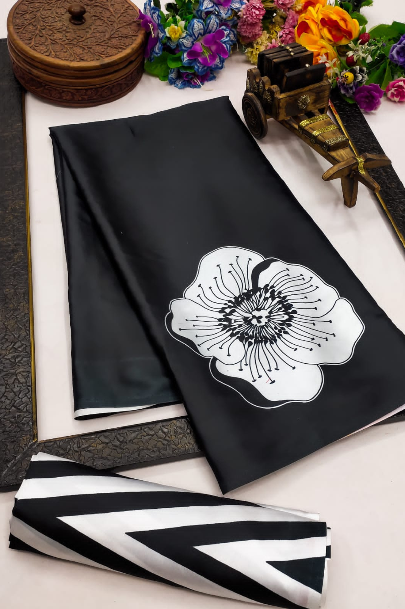 Black Floral Digital Print Japan Satin Saree with Matching Blouse