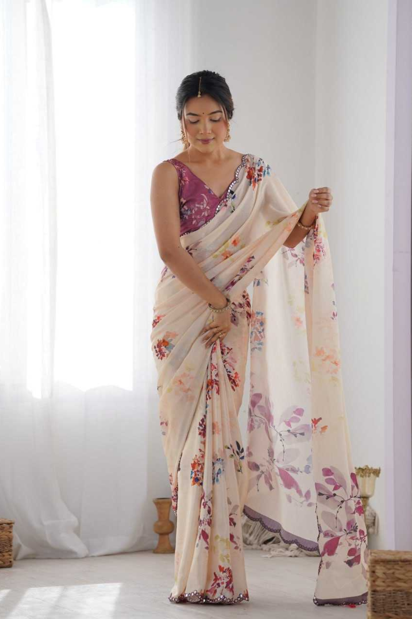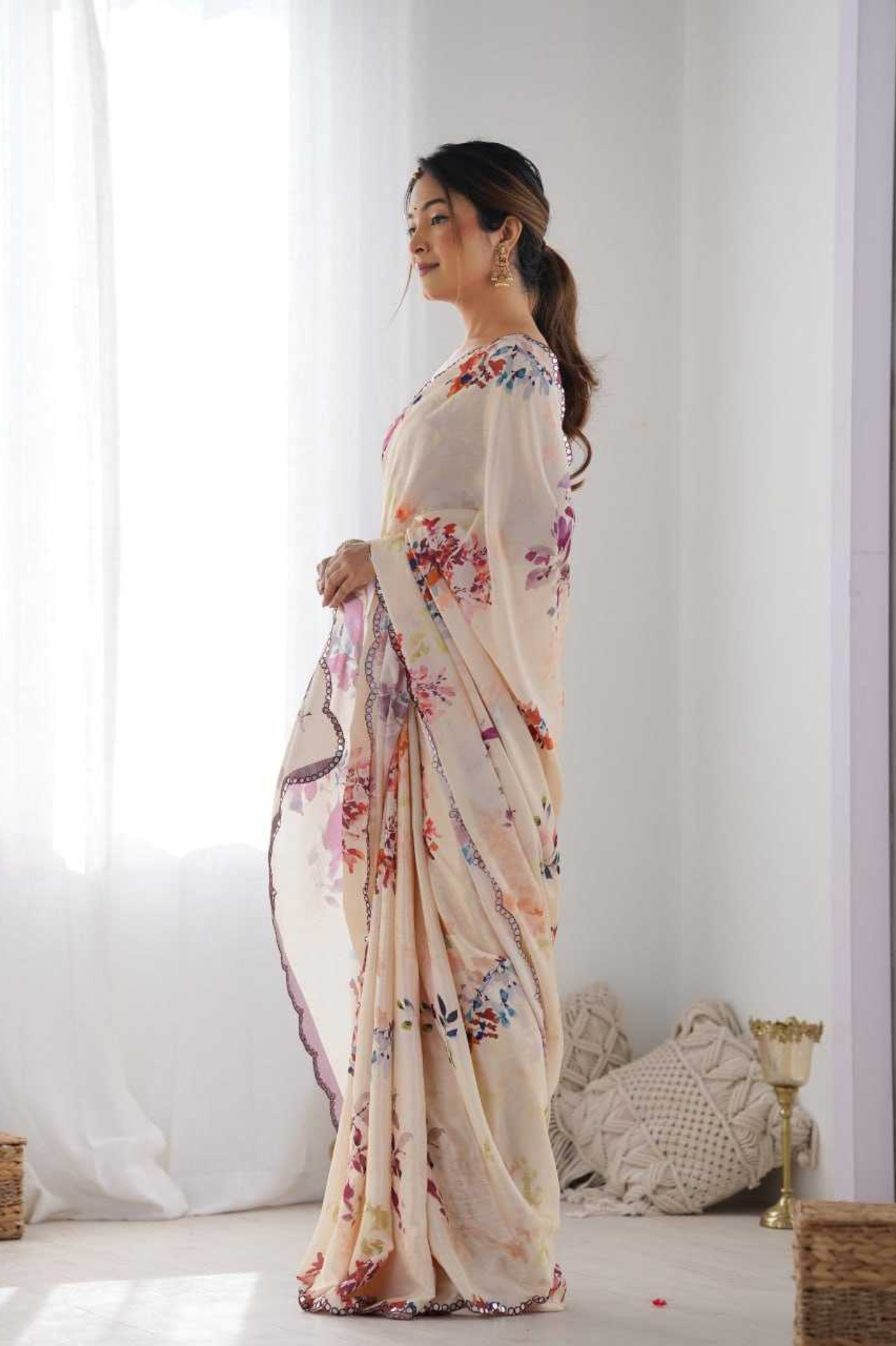 Elegant Floral Print Heavy Chinnon Saree with Mirror Lace Detailing