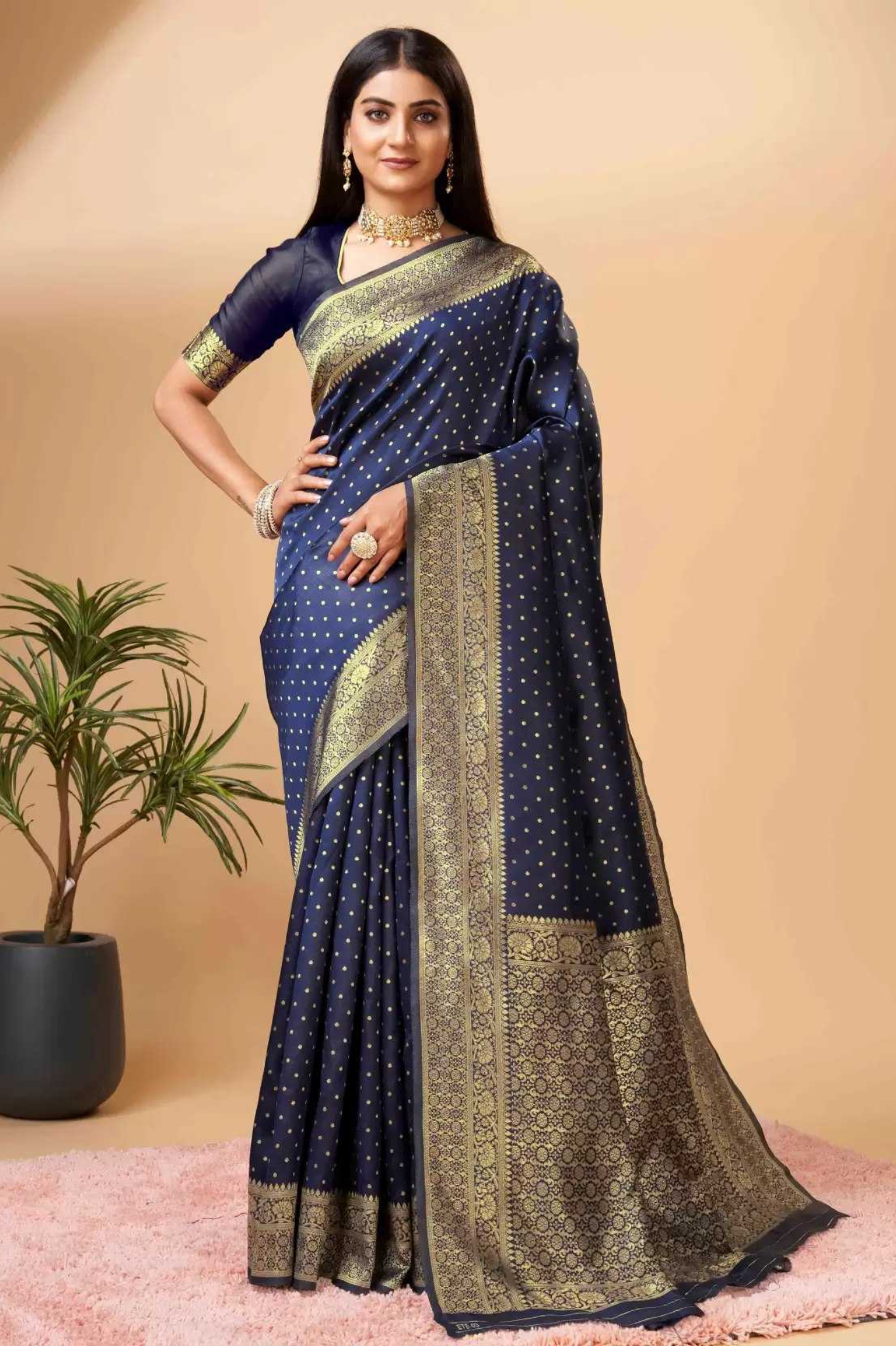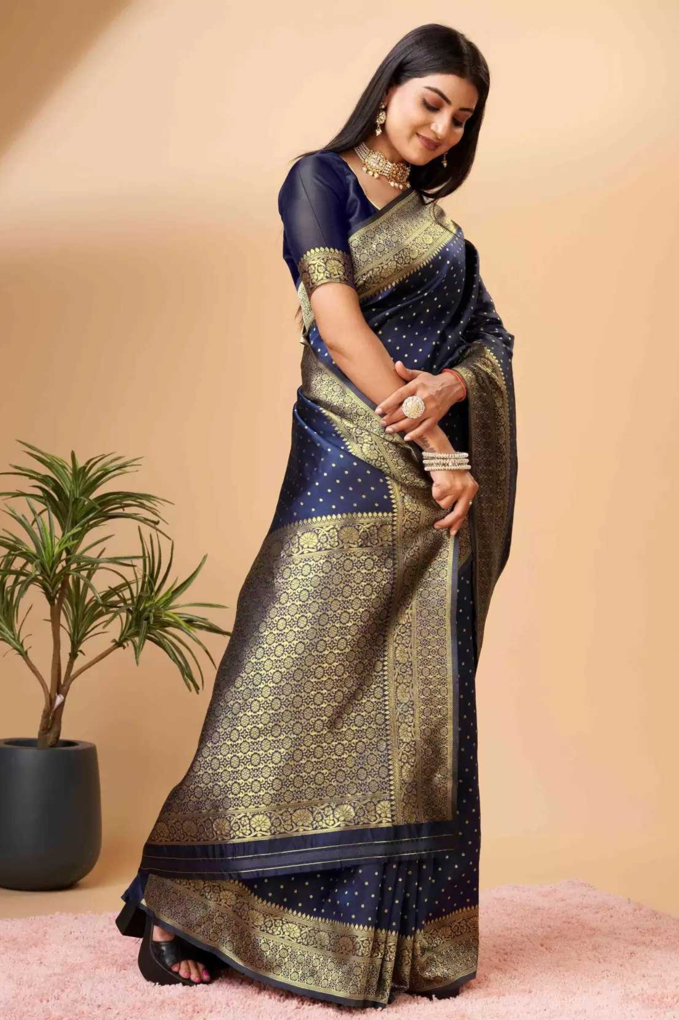 Make a bold and graceful statement with this elegant blue Banarasi art silk saree, finely adorned with delicate golden zari buttis across the body. The richly woven border and grand pallu feature intricate traditional patterns that reflect heritage artistry and festive luxury. Crafted from soft, flowy art silk, this saree is a perfect blend of sophistication and tradition—ideal for weddings, festive occasions, or elegant evening gatherings.