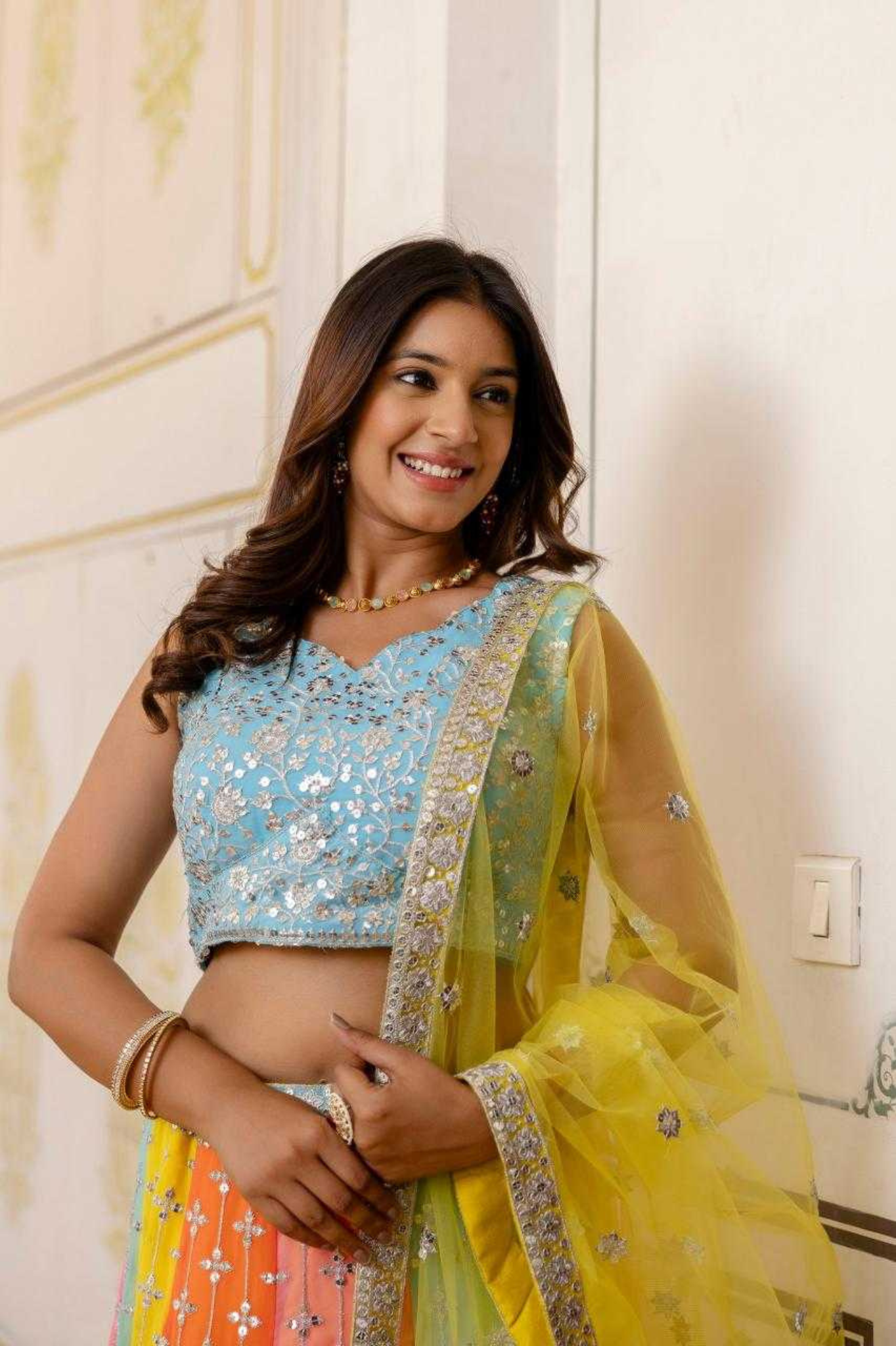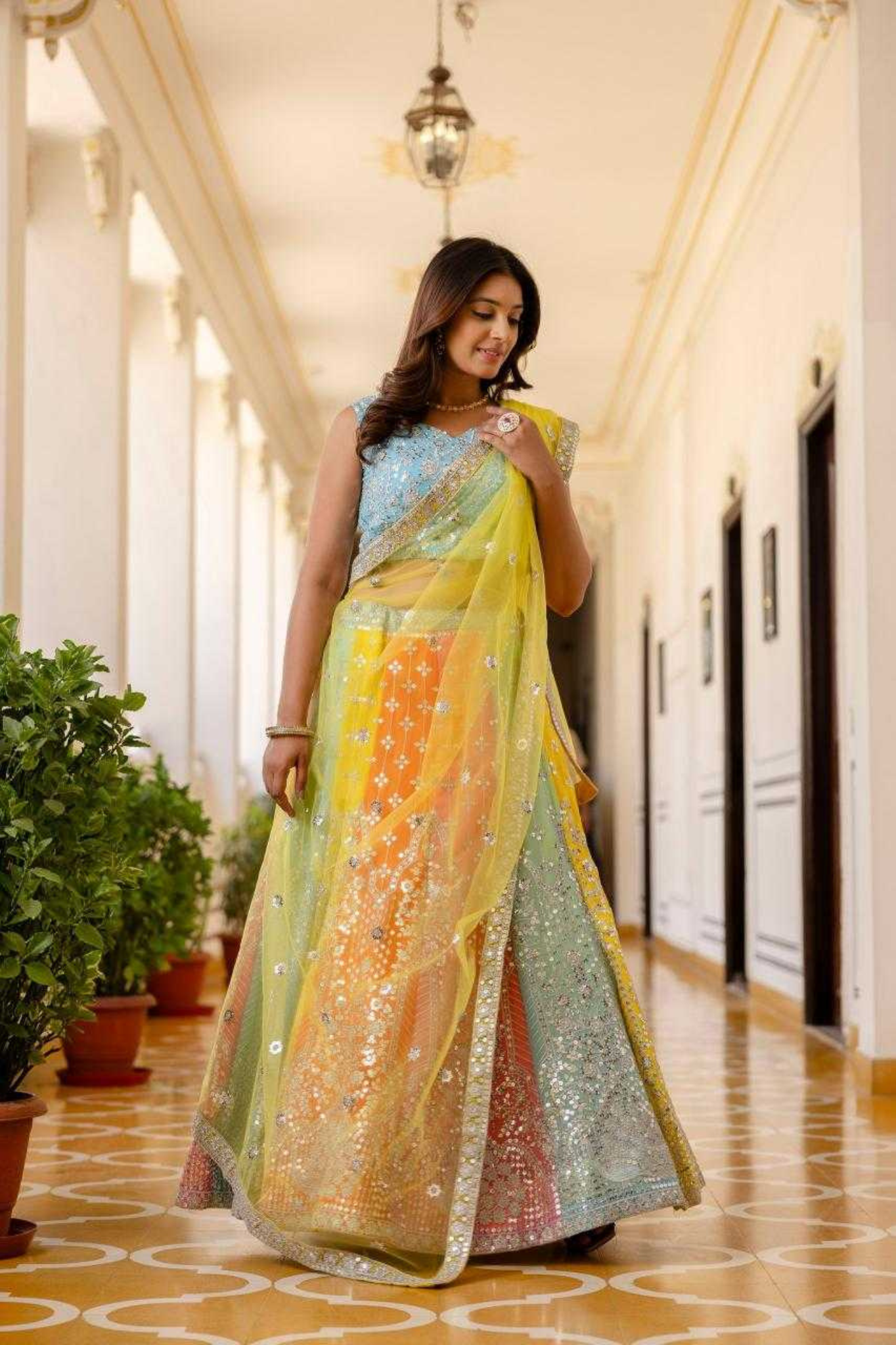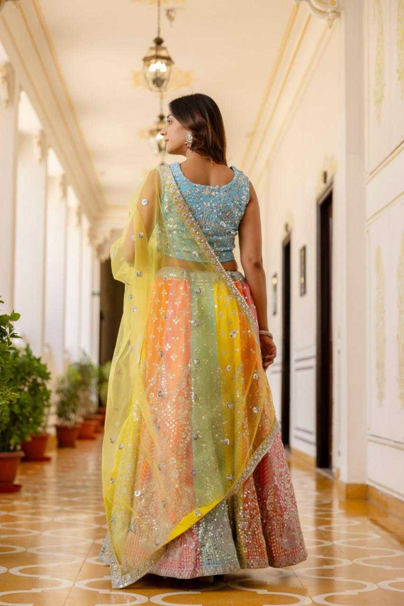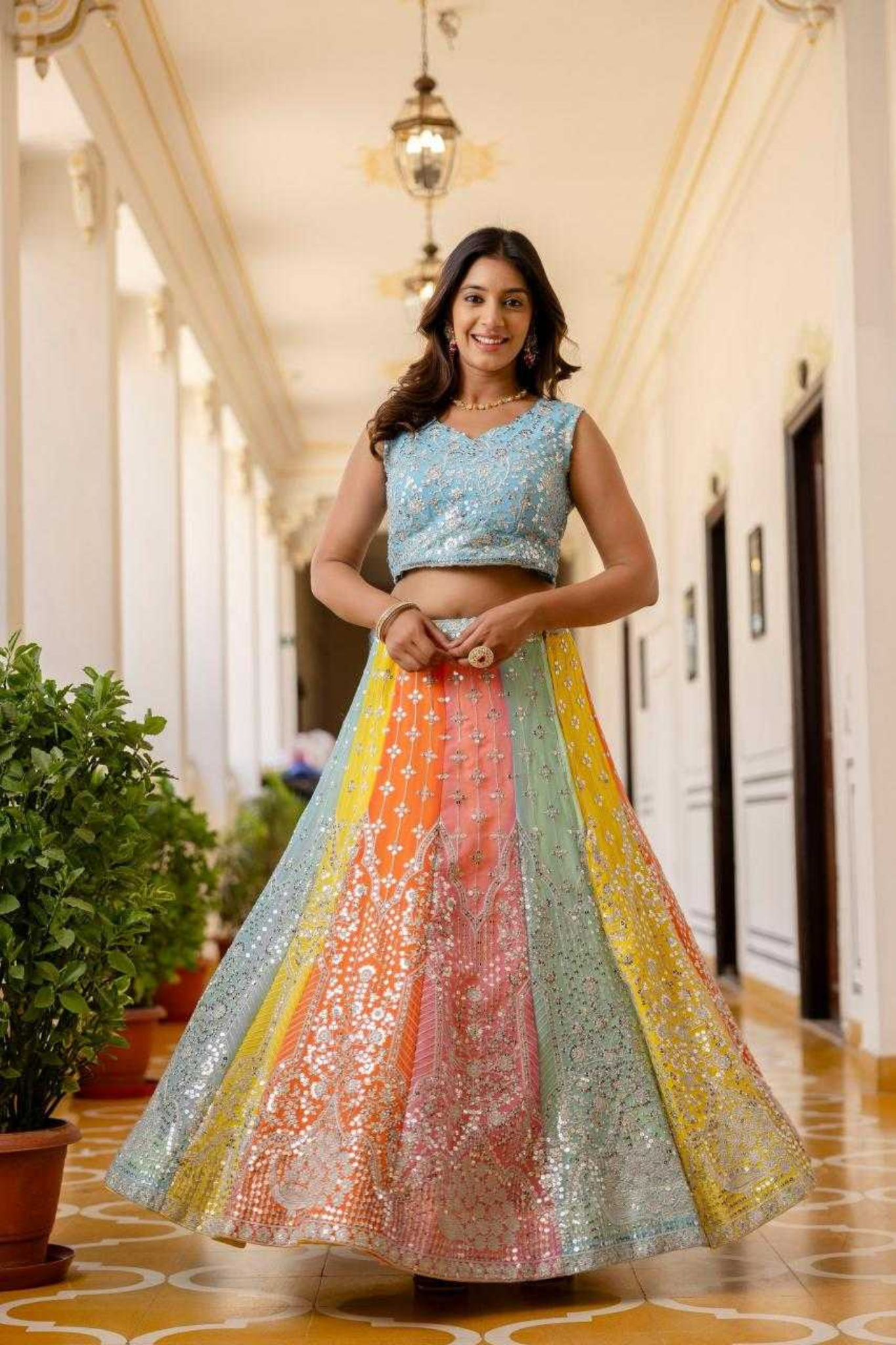 Make a dazzling statement with this vibrant multi-color lehenga set, beautifully adorned with 7-MM sequins and intricate thread embroidery. Designed...