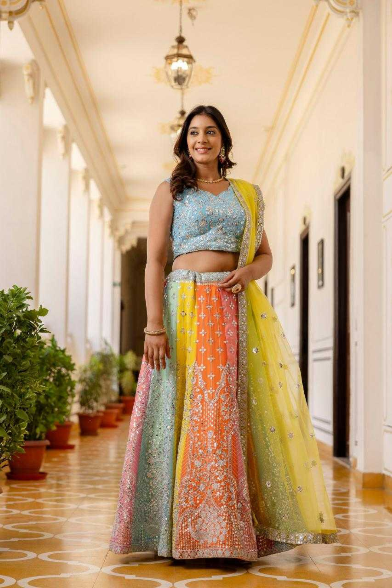 Make a dazzling statement with this vibrant multi-color lehenga set, beautifully adorned with 7-MM sequins and intricate thread embroidery. Designed for elegance and comfort, it features a wide flare and a supportive waist fit, perfect for weddings, receptions, and festive occasions.