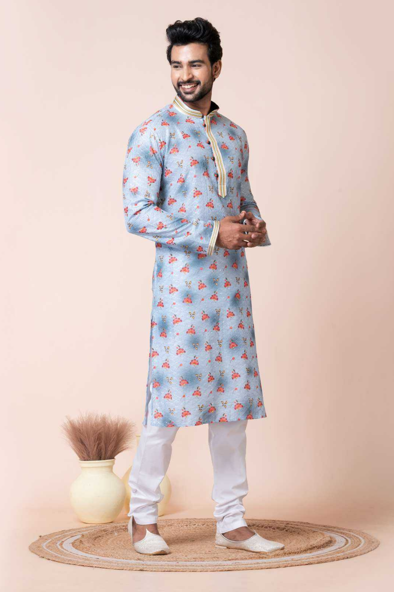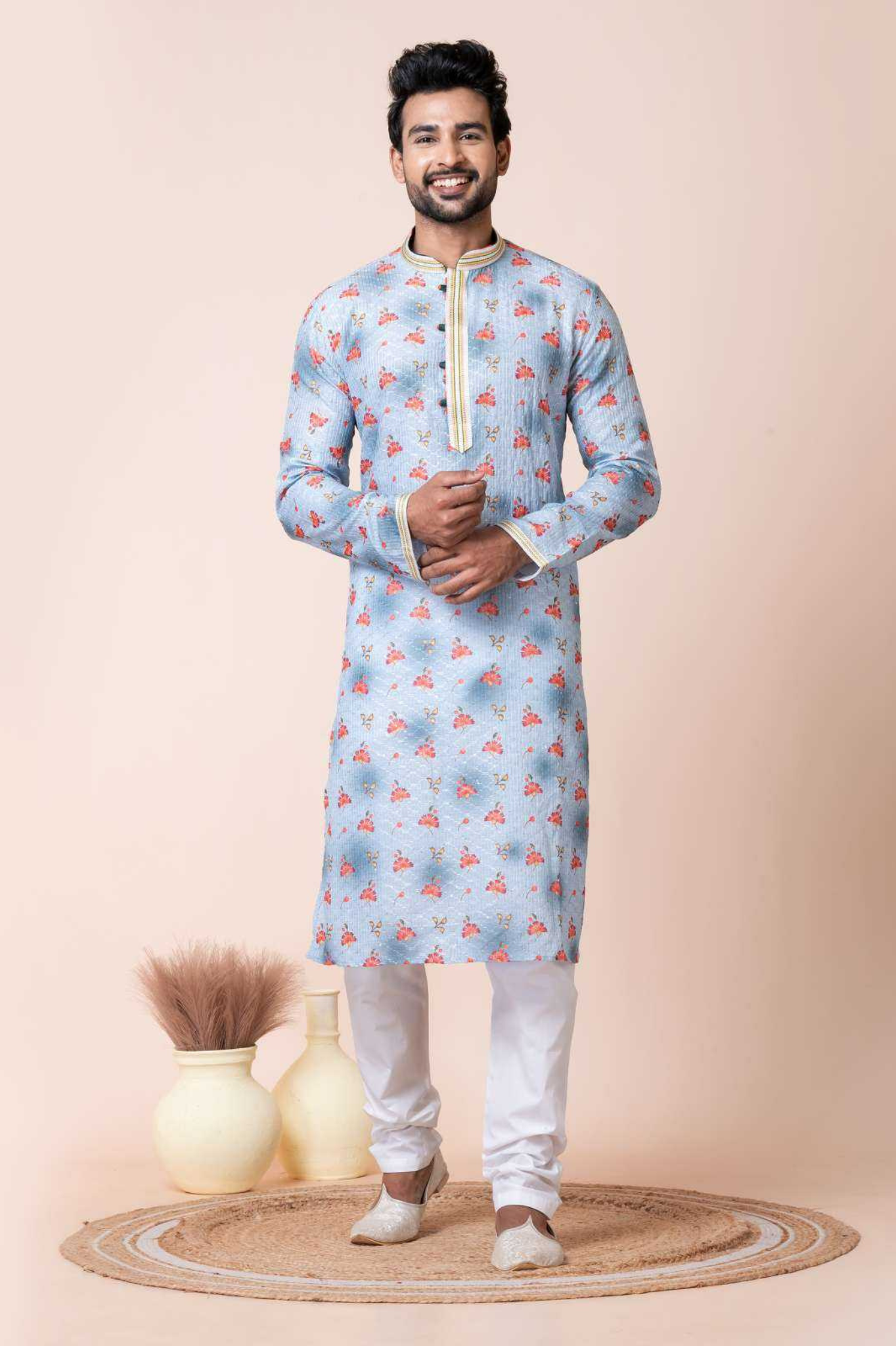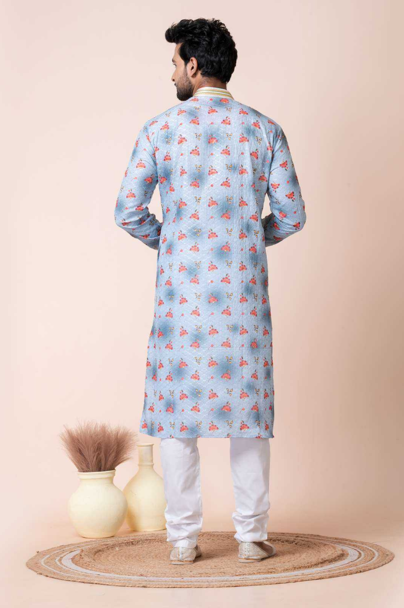 Upgrade your ethnic wardrobe with this men’s kurta crafted from a durable mono cotton-poly blend. Showcasing an elegant sky blue base adorned with delicate floral prints, this kurta is designed to bring charm and freshness to your festive look. The highlighted placket and collar detailing add a refined touch, while the comfortable white pajama completes the traditional yet stylish outfit. Perfect for festive occasions, family gatherings, and cultural events.