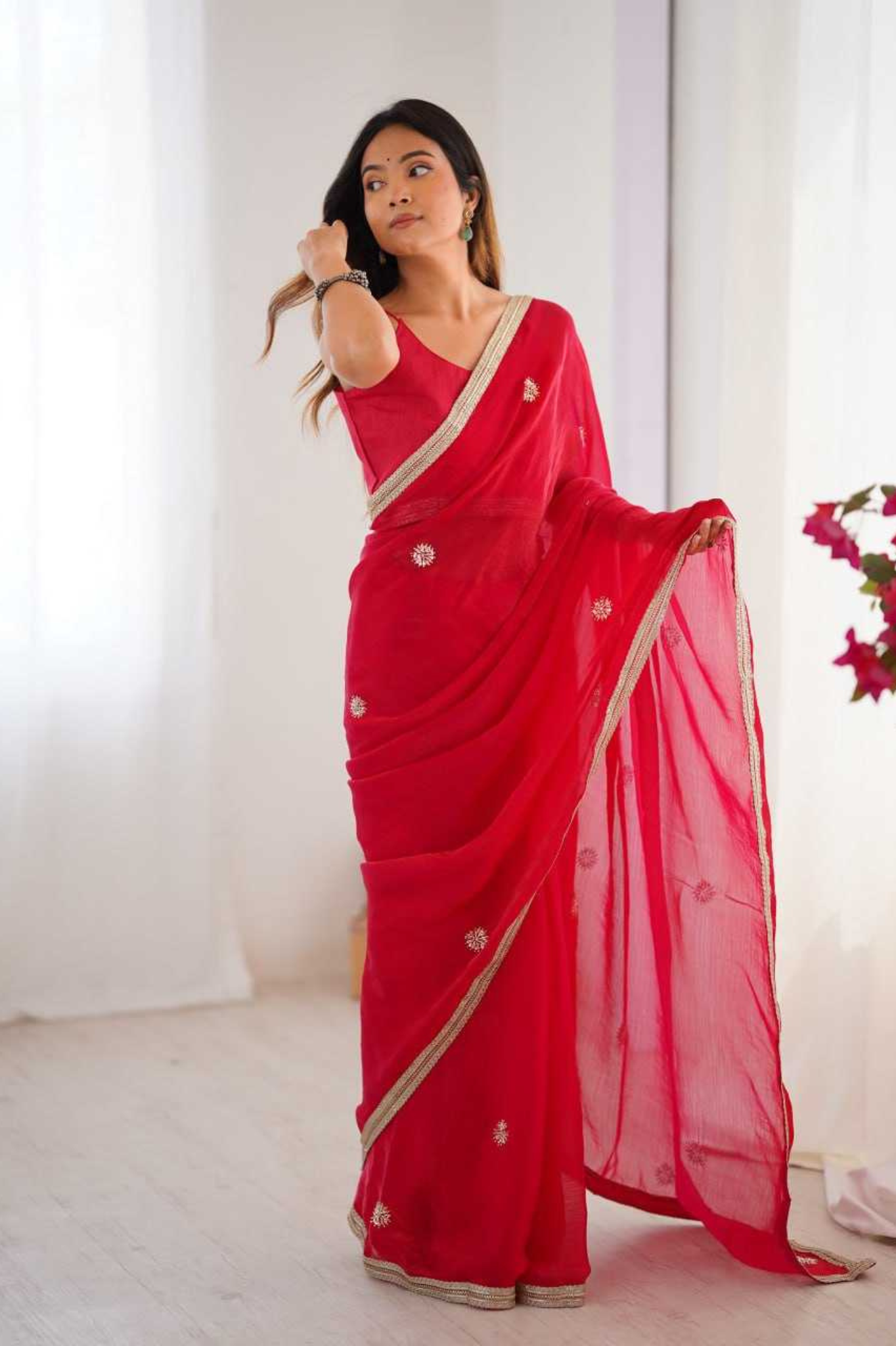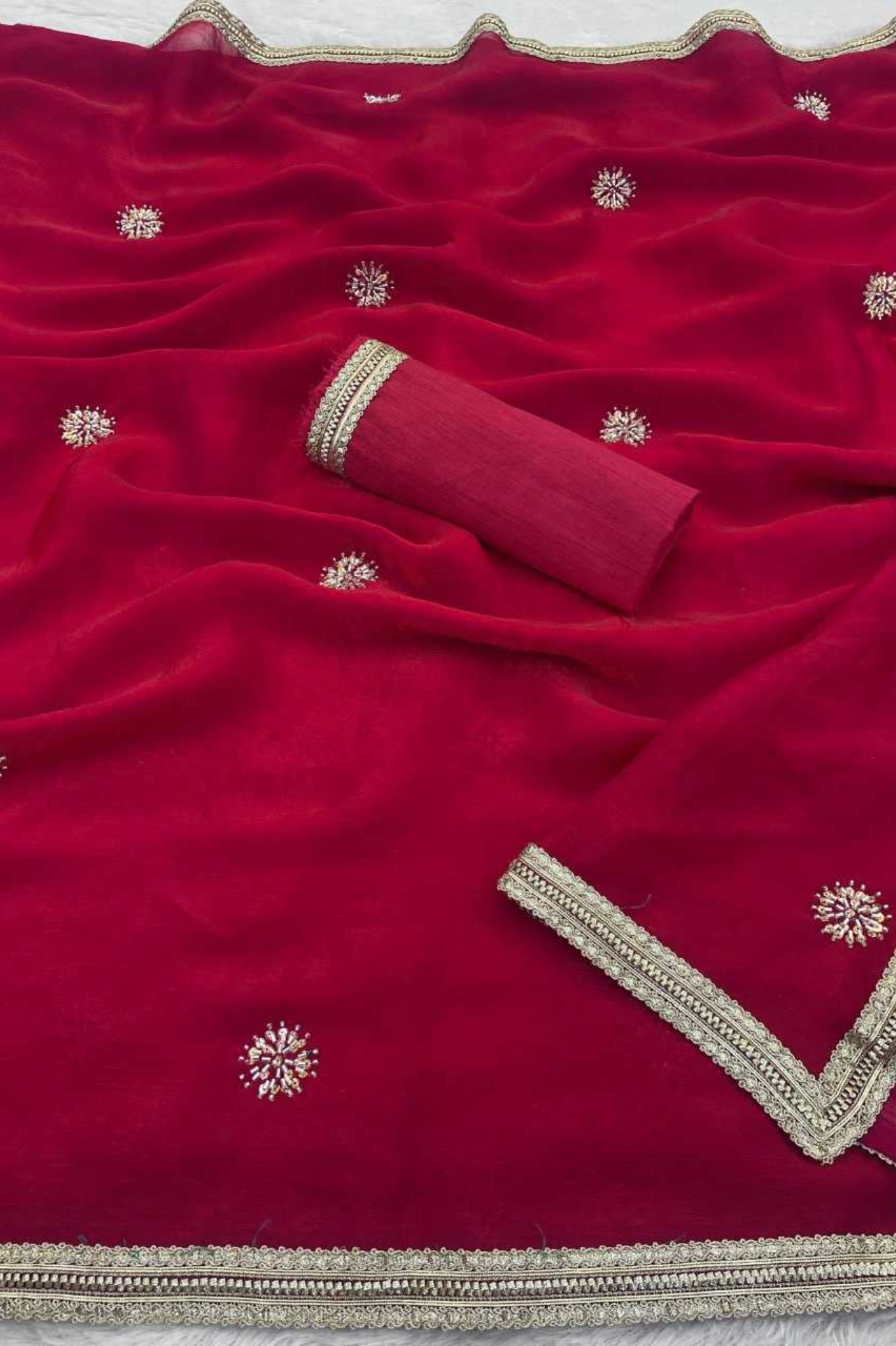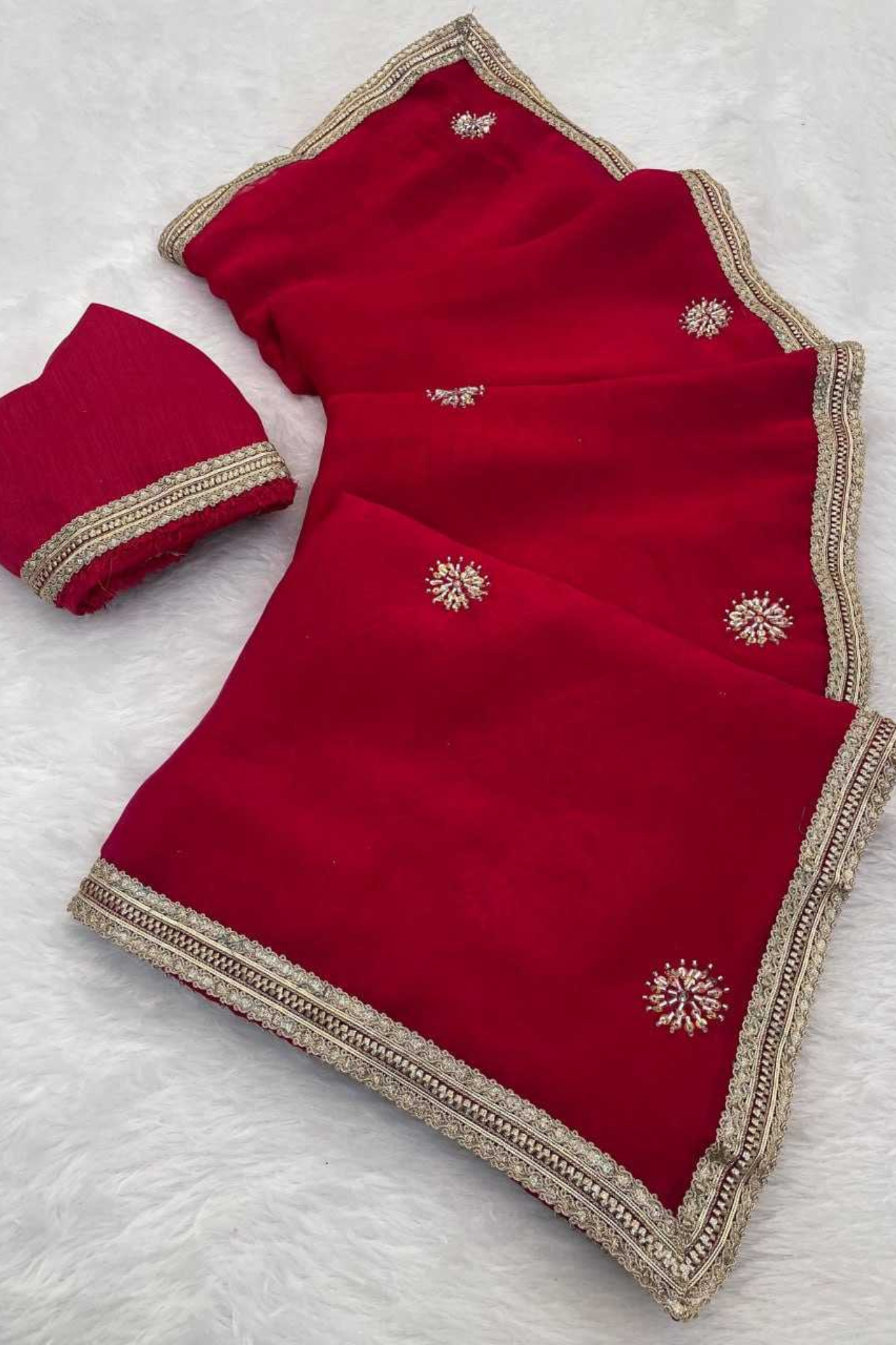 Drape yourself in timeless elegance with this Red designer saree crafted from heavy smooth Fandy fabric. The saree features exquisite beads, moti, and val sequin embroidery work spread all over, adding a graceful shimmer to every step. It is paired with a heavy mono Banglori plain blouse enhanced with a delicate lace border, making it a perfect blend of sophistication and style.