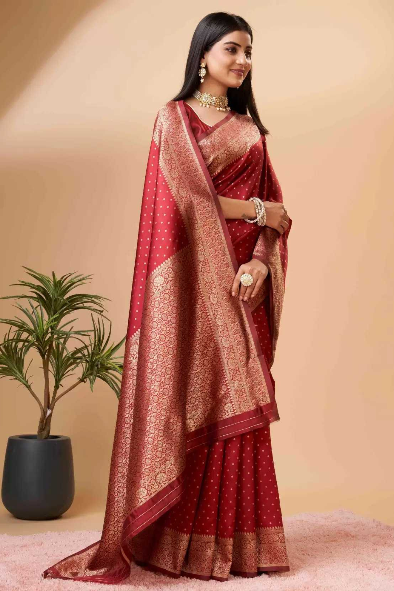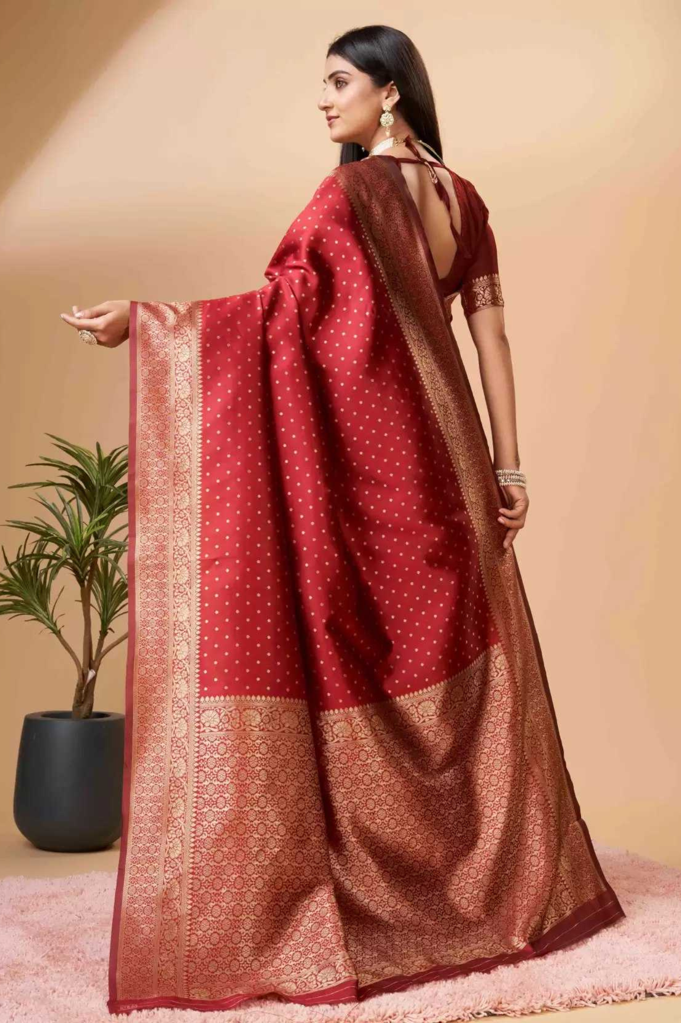 Make a bold and graceful statement with this elegant Red Banarasi art silk saree, finely adorned with delicate golden zari buttis across the body. The richly woven border and grand pallu feature intricate traditional patterns that reflect heritage artistry and festive luxury. Crafted from soft, flowy art silk, this saree is a perfect blend of sophistication and tradition—ideal for weddings, festive occasions, or elegant evening gatherings.