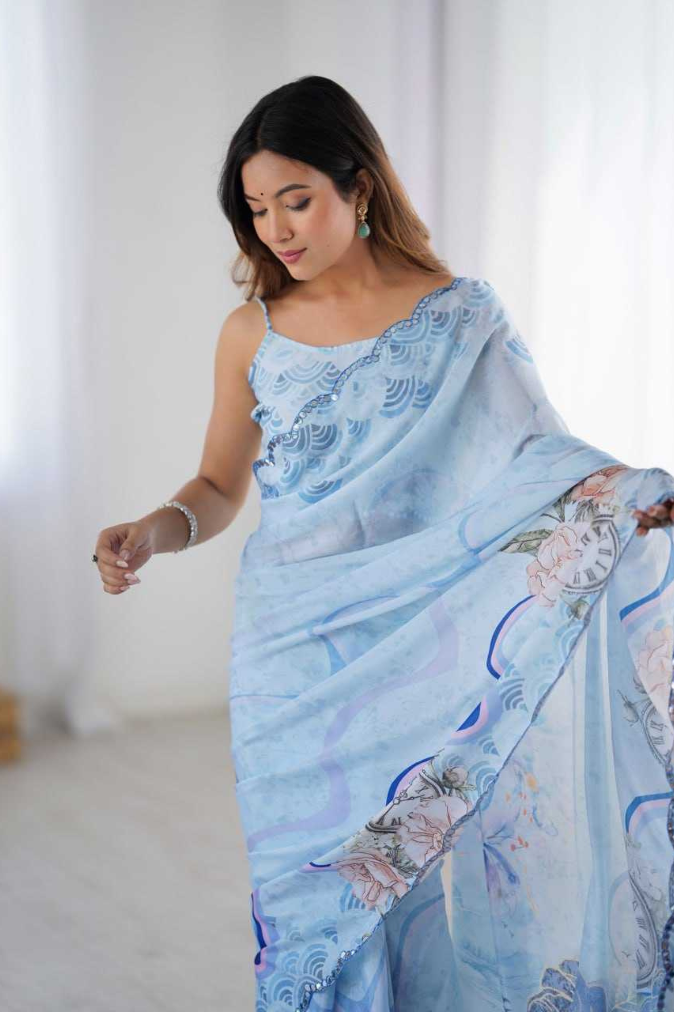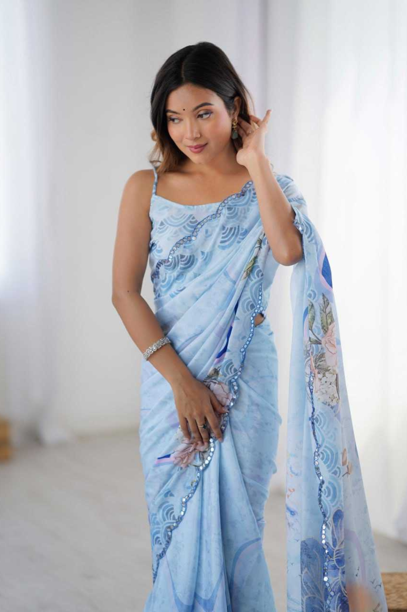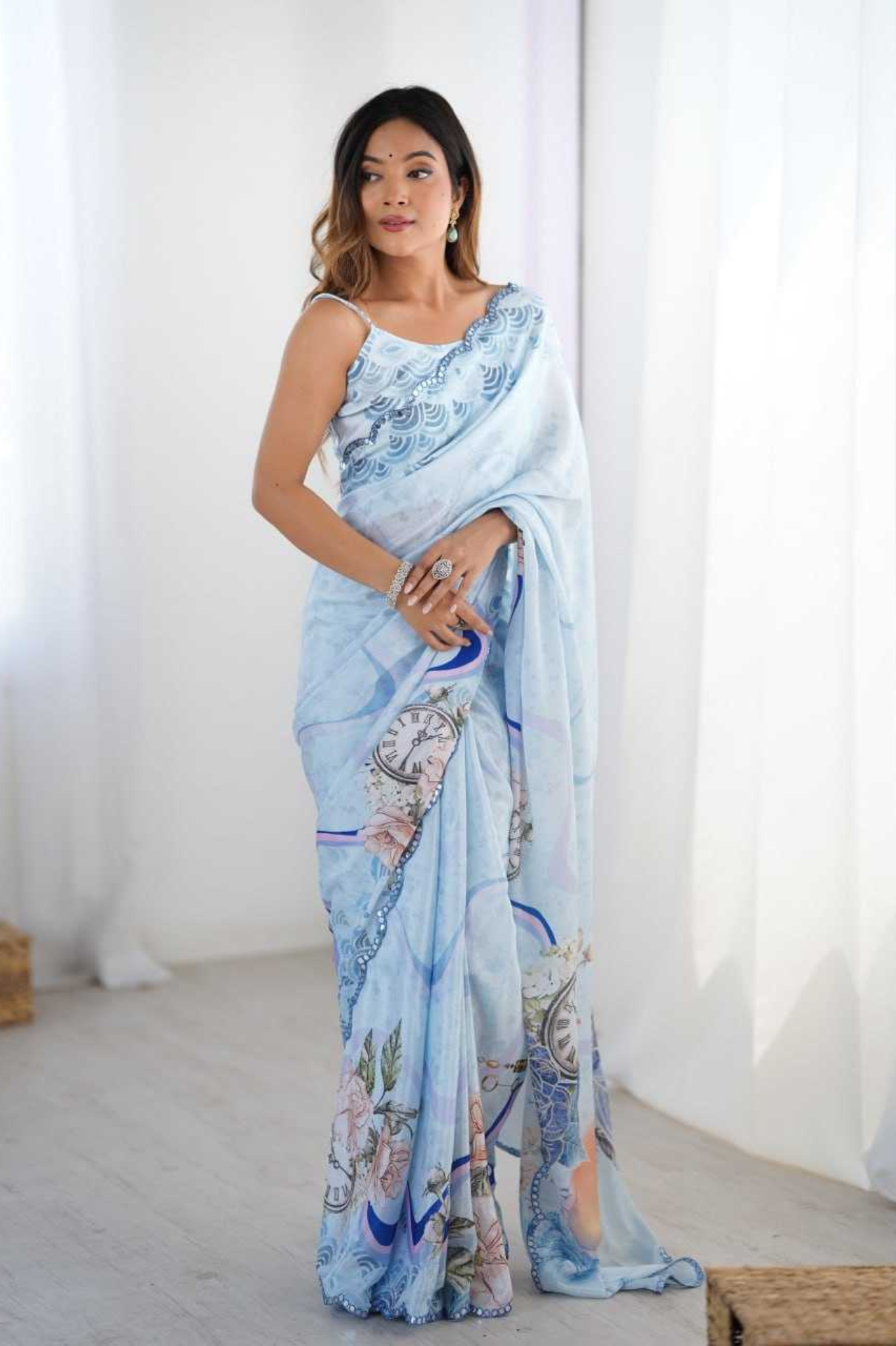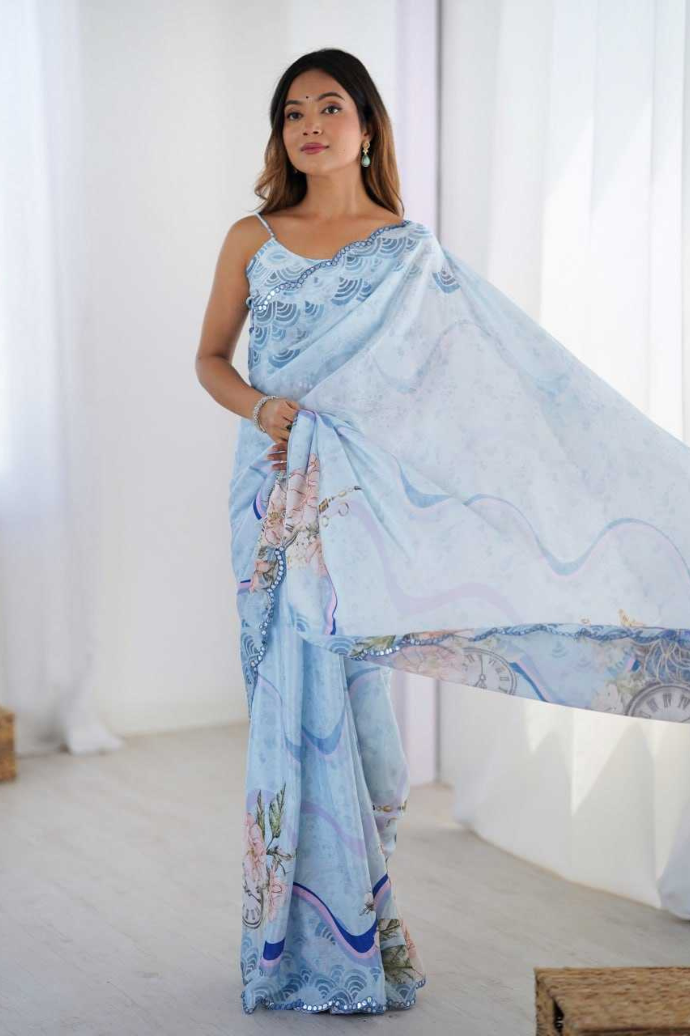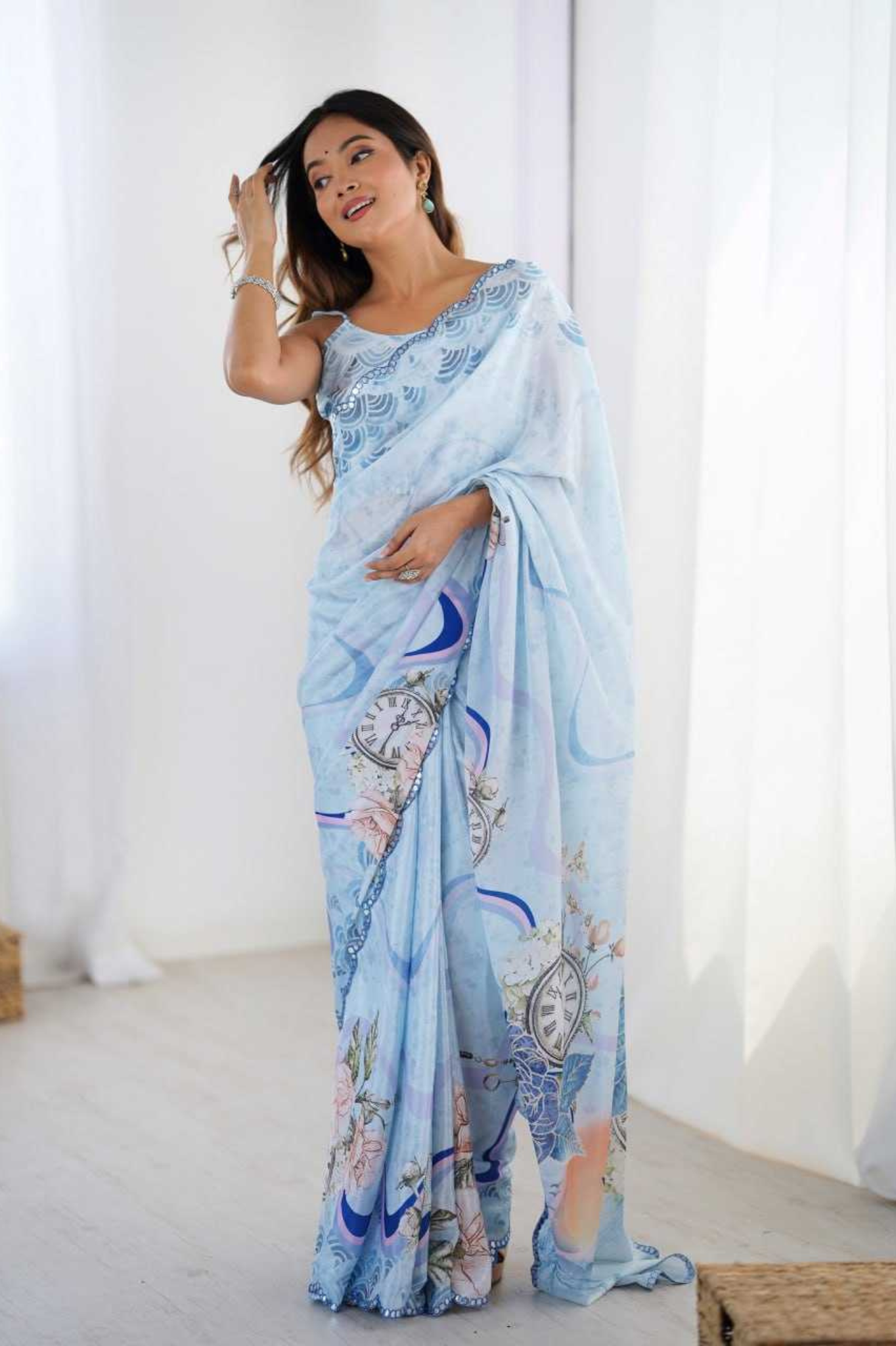 Elevate your ethnic wardrobe with this heavy Chinnon saree in a soothing sky blue shade, featuring elegant print work enhanced with a beautiful Kutchi mirror lace border. Its soft drape and subtle shine make it a perfect pick for festive occasions, parties, and traditional gatherings.