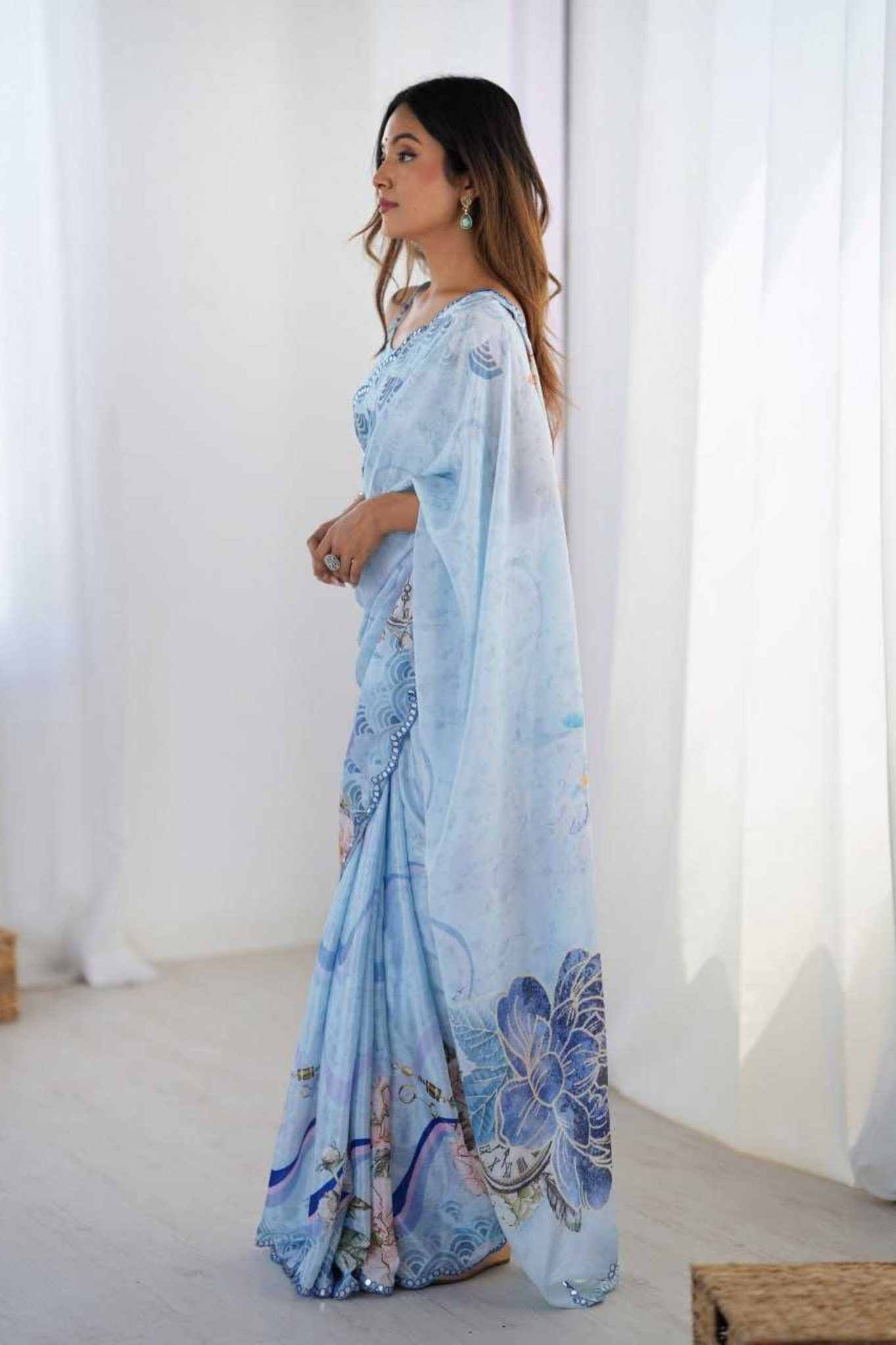 Elevate your ethnic wardrobe with this heavy Chinnon saree in a soothing sky blue shade, featuring elegant print work enhanced...